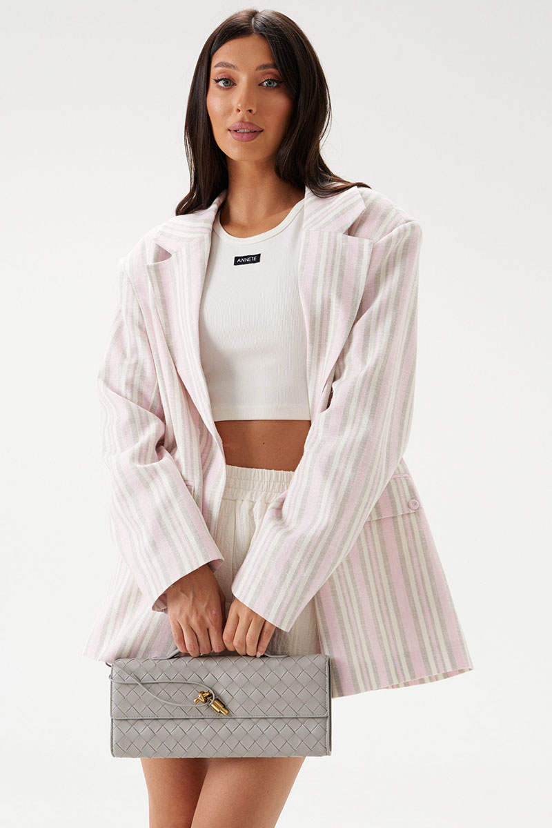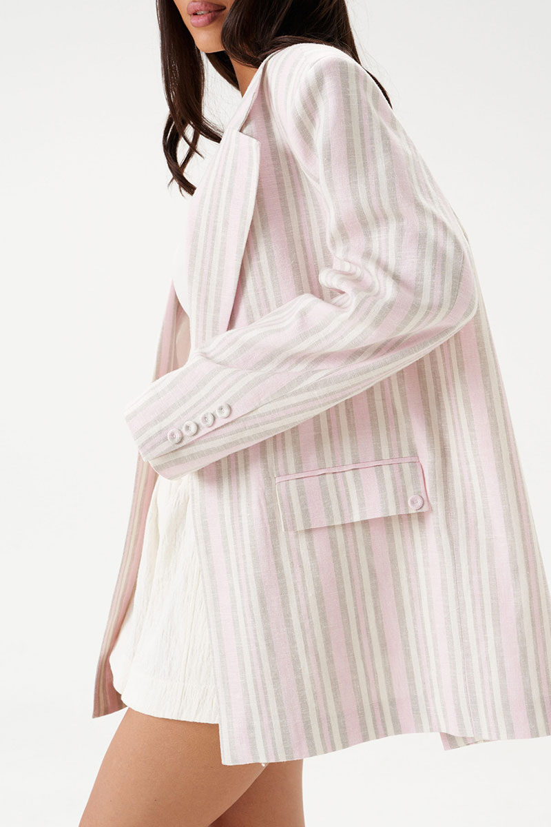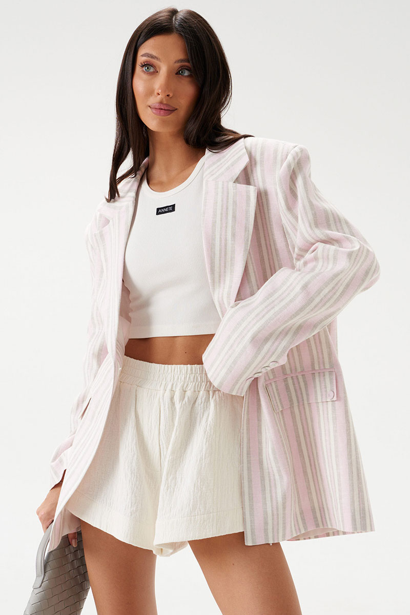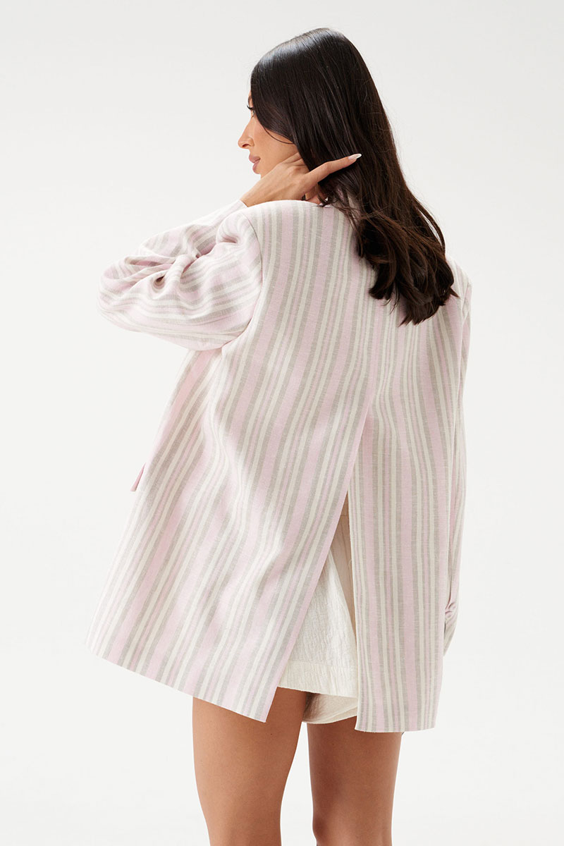 Жакет прямого свободного кроя выполнен из льняного (смесового) полотна бежевого цвета в розово-песочную полоску. Характеристики: прямой свободный крой, подкладка, подплечники, воротник с остроугольным лацканом, застежка центральная на петлю - пуговицу, по переду функциональные карманы с клапаном, рукав втачной, по низу рукава нашиты пуговички, спинка со средним швом, в среднем шве шлица 48 см.