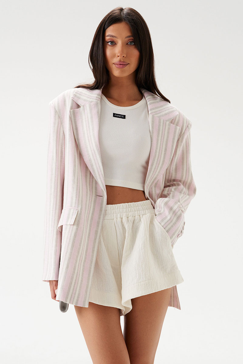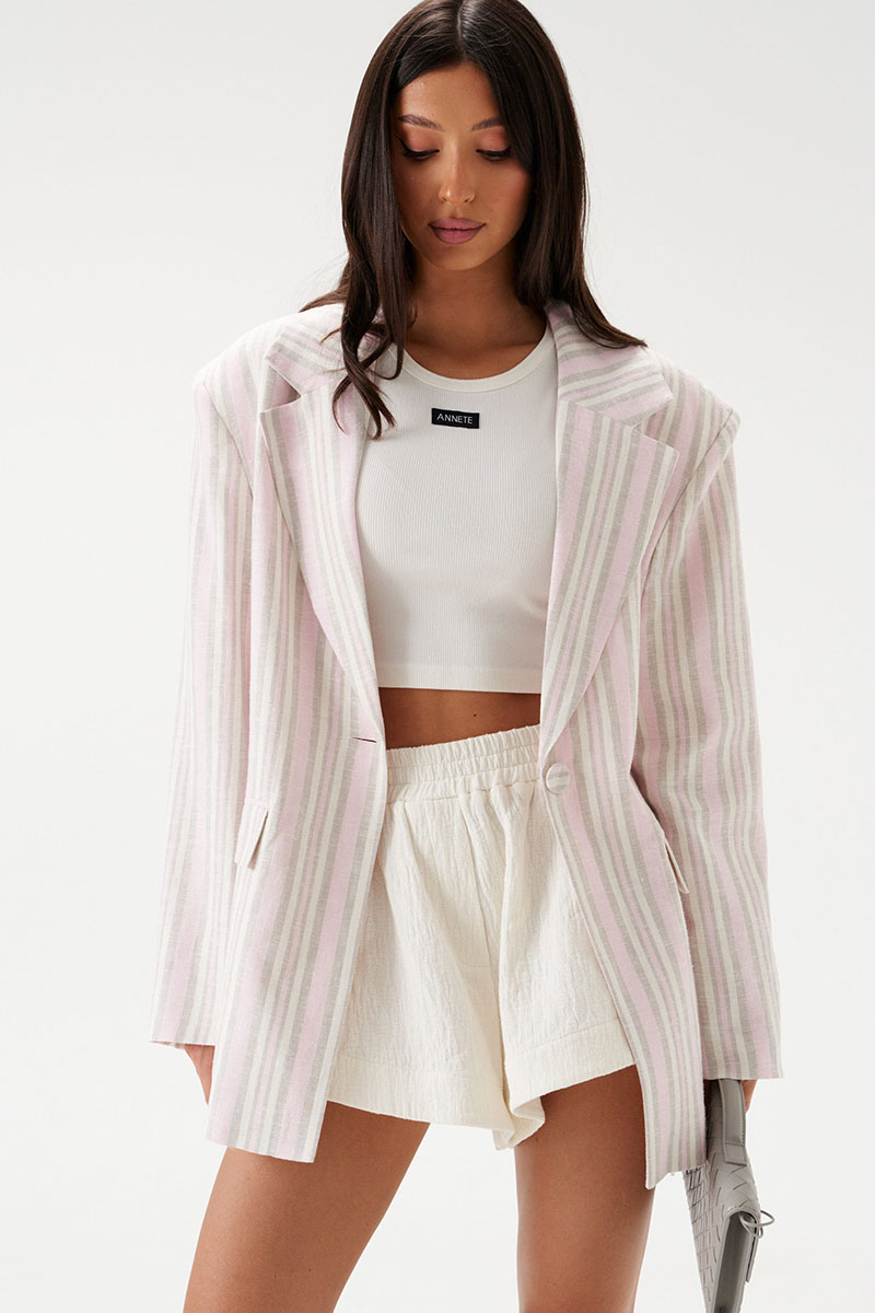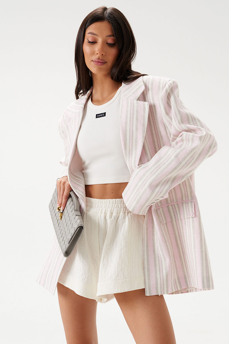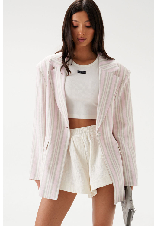 Жакет прямого свободного кроя выполнен из льняного (смесового) полотна бежевого цвета в розово-песочную полоску. Характеристики: прямой свободный крой, подкладка, подплечники, воротник с остроугольным лацканом, застежка центральная на петлю - пуговицу, по переду функциональные карманы с клапаном, рукав втачной, по низу рукава нашиты пуговички, спинка со средним швом, в среднем шве шлица 48 см.