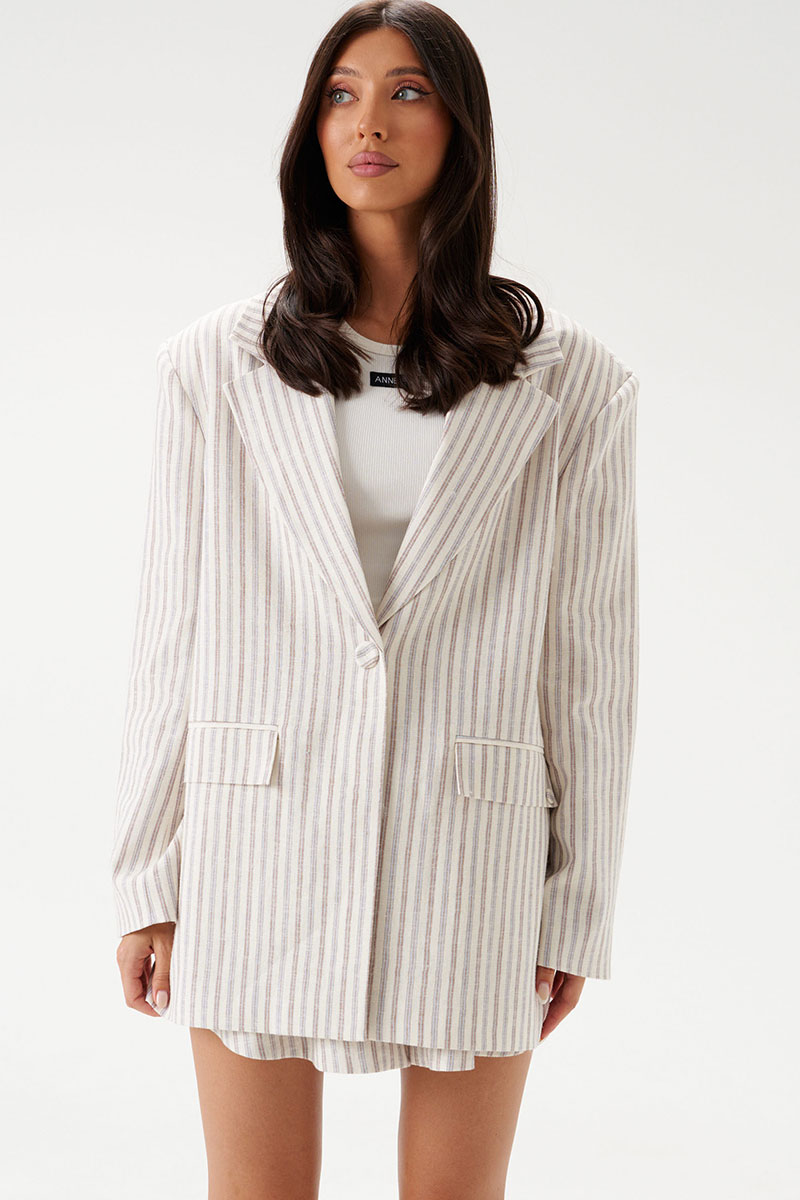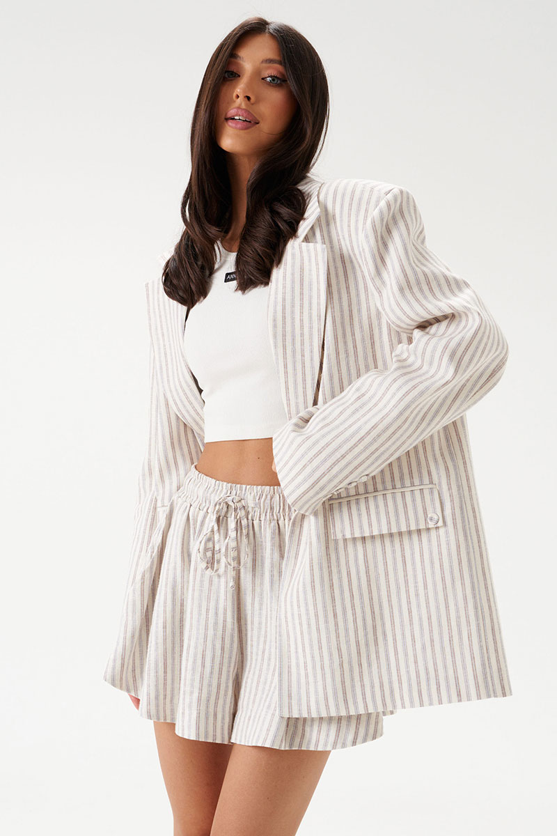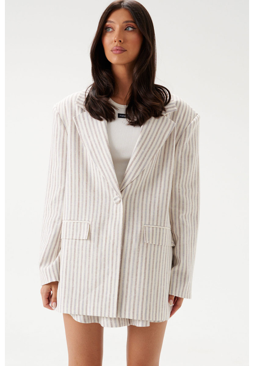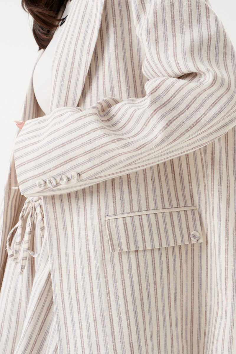 Жакет прямого свободного кроя выполнен из льняного (смесового) полотна бежевого цвета в коричнево-голубую полоску. Характеристики: прямой свободный крой, подкладка, подплечники, воротник с остроугольным лацканом, застежка центральная на петлю - пуговицу, по переду функциональные карманы с клапаном, рукав втачной, по низу рукава нашиты пуговички, спинка со средним швом, в среднем шве шлица 48 см.