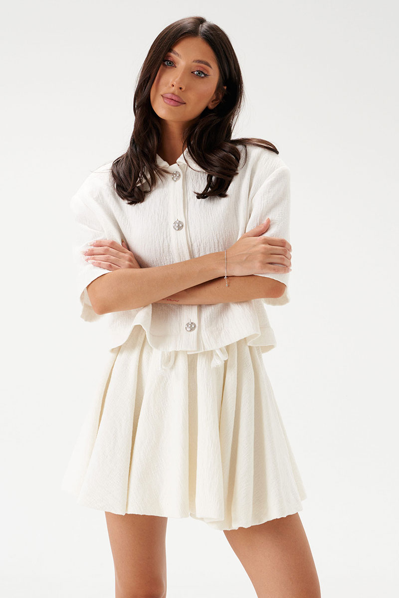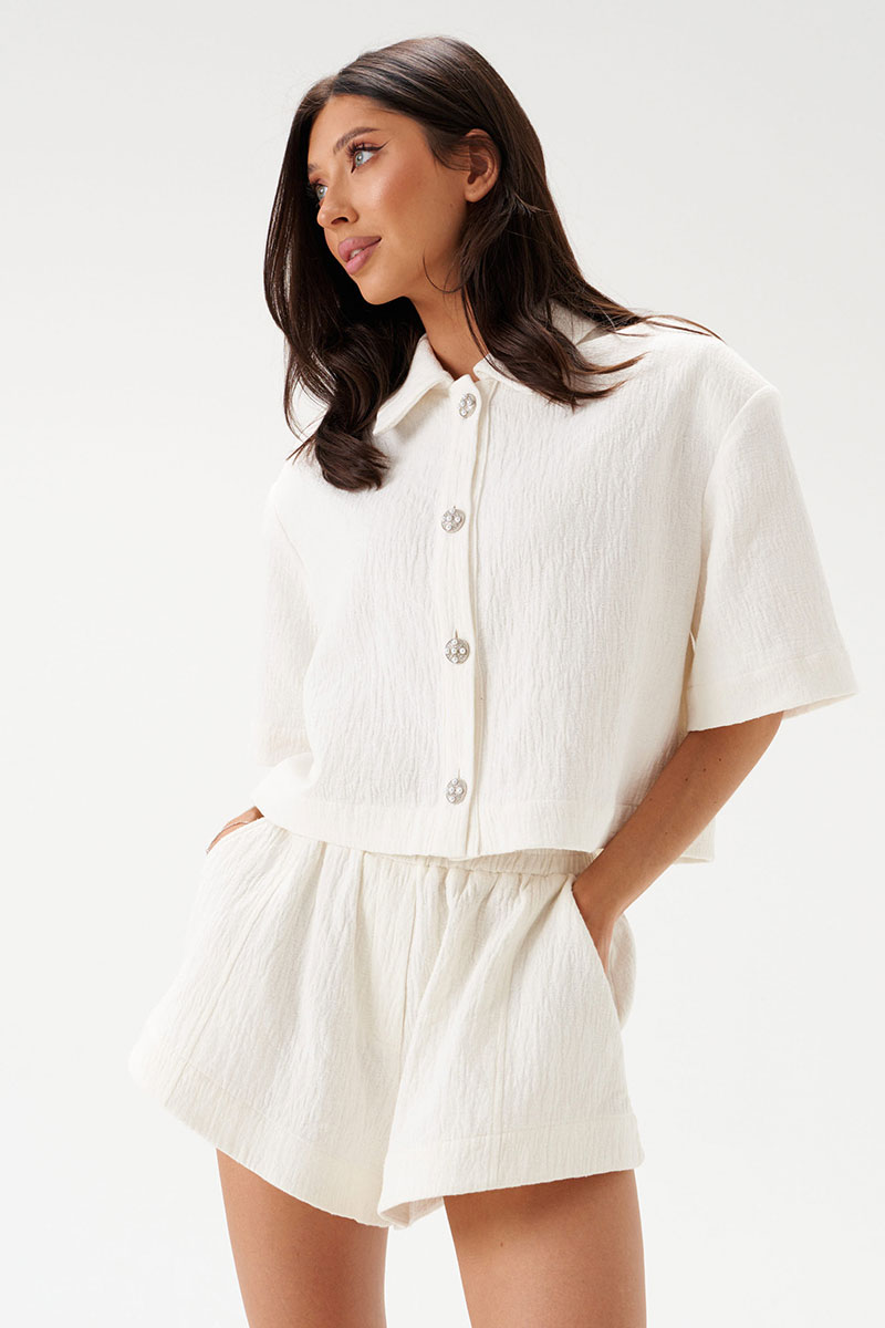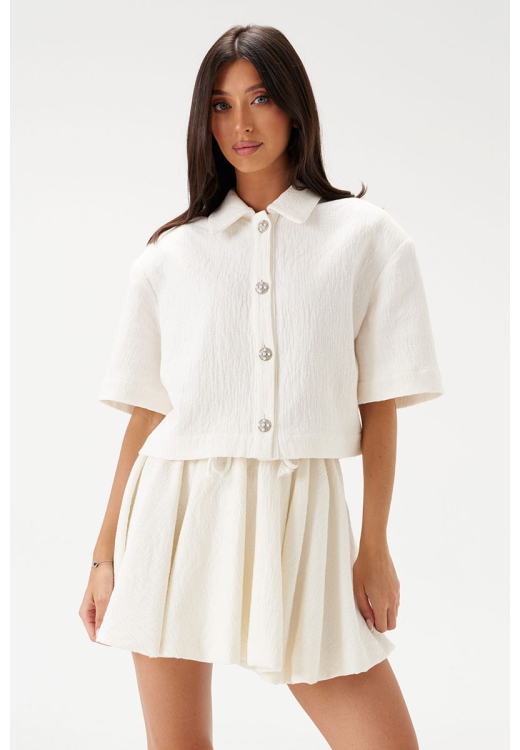 Жакет укороченный прямого кроя выполнен из хлопкового полотна с тиснением молочного цвета. Характеристики: воротник рубашечного типа, застежка центральная на акцентные пуговицы с бусинами, съемные подплечники, короткий рукав.