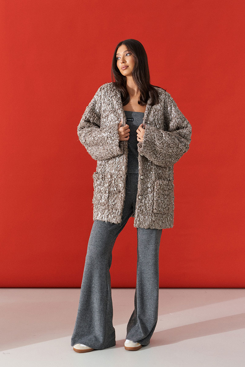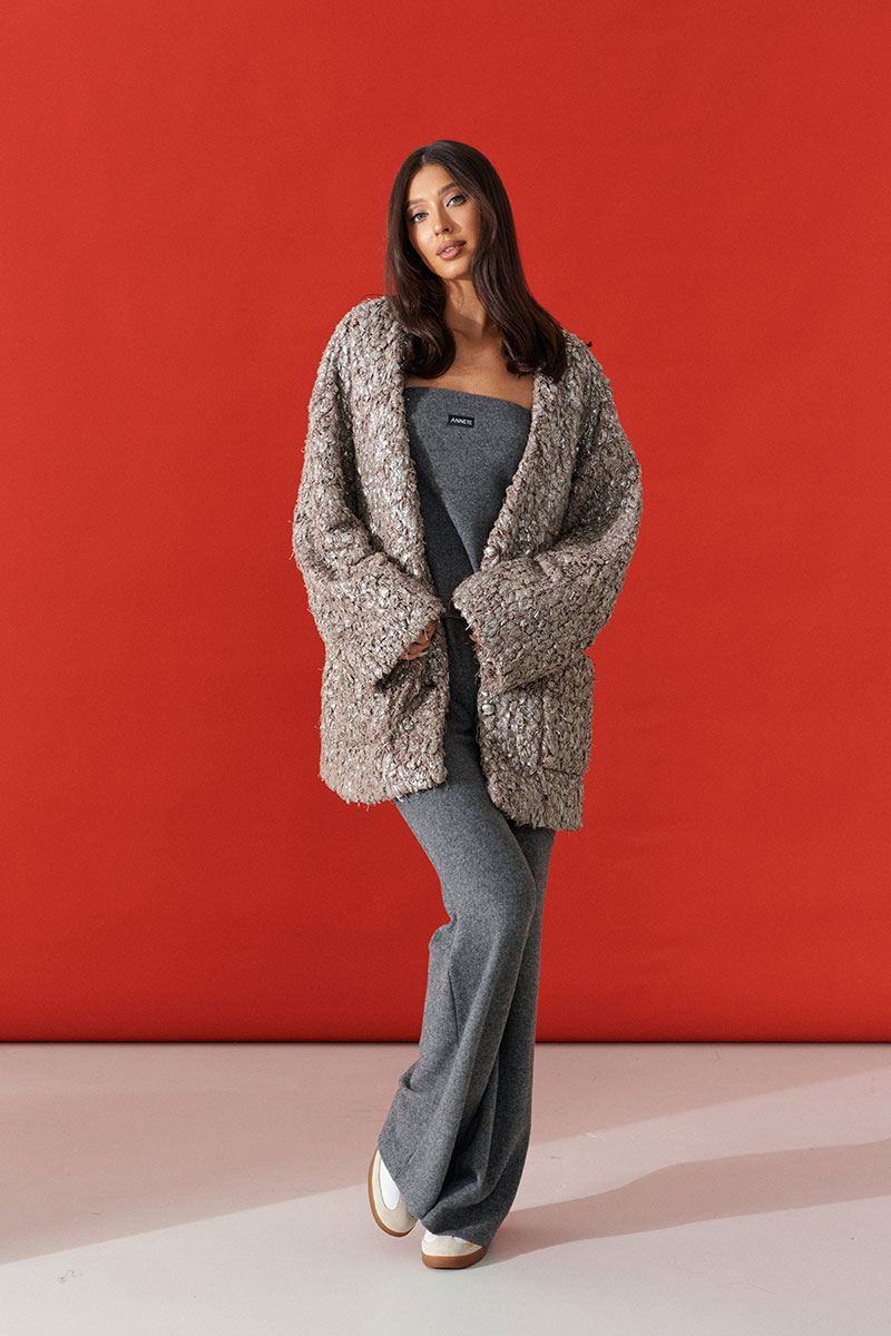 Жакет (кардиган) прямого свободного кроя. Выполнен из мягкой фактурной ткани тёмного-бежевого цвета с серебристым напылением. С подкладкой. Вырез горловины V-образный. Рукав втачной, спущен. По переду накладные карманы. Застёжка центральная пуговицы.