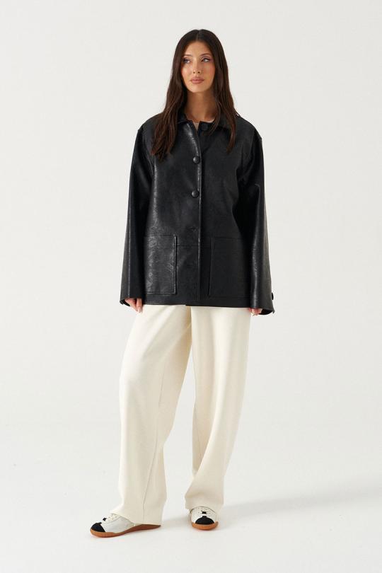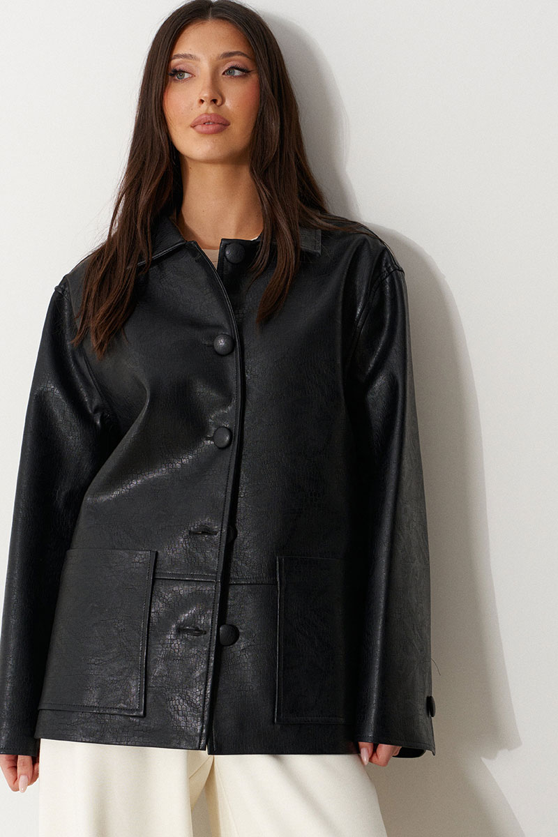 Жакет прямого свободного кроя. выполнен из фактурной эко-кожи чёрного цвета. С подкладкой. Воротник отложной. Рукав втачной, немного спущен. По переду накладные карманы. По окружности жакета подрез ниже линии талии. Спинка отрезная. Застёжка центральная пуговицы.