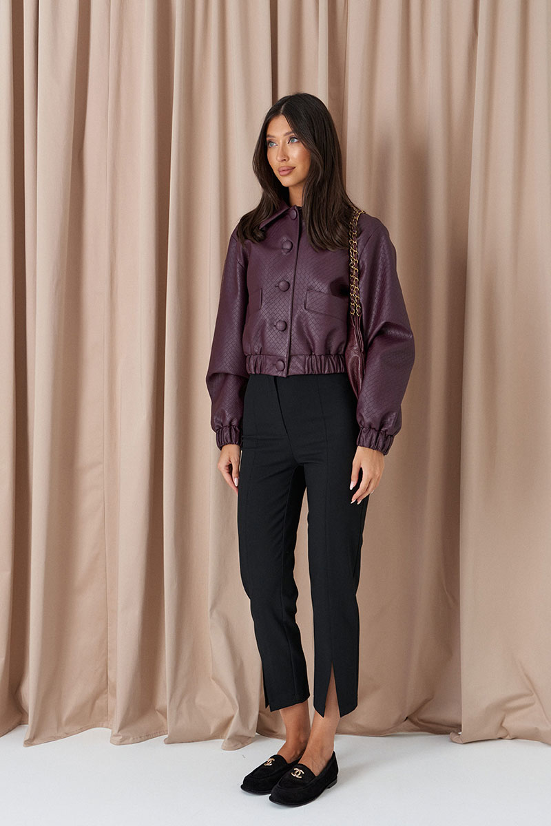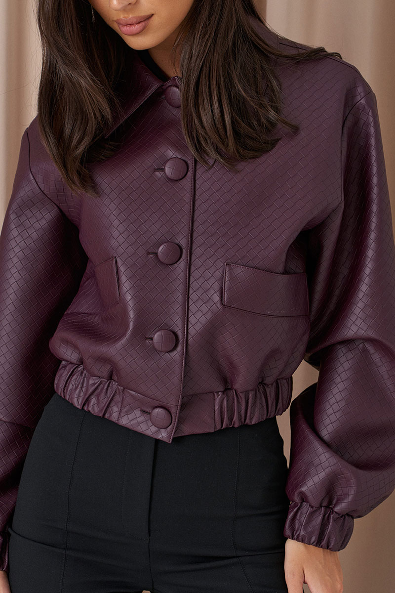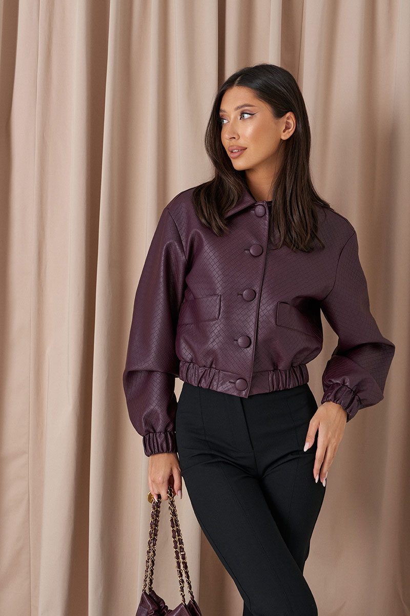 Укороченный жакет. Выполнен из фактурной экокожи бордового цвета. С подкладкой. Воротник отложной. Рукав втачной, немного спущен, с мантежой на резинке. Низ изделия с резинкой. По переду прорезные карманы. Застёжка центральная пуговицы. Жакет дополнит юбка а1611.