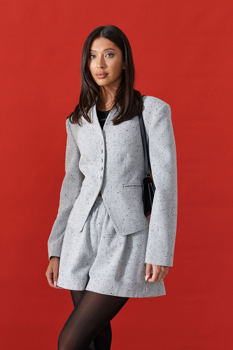 Жакет прилегающего силуэта. Выполнен из фактурной ткани серого цвета со стразами и вкраплениями контрастной нити (чёрного цвета). С подкладкой. Воротник-стойка. Вырез горловины V-образный. Рукав втачной. По переду прорезные карманы. Застёжка центральная - пуговицы. Низ жакета фигурный. Жакет дополнят шорты 1616.