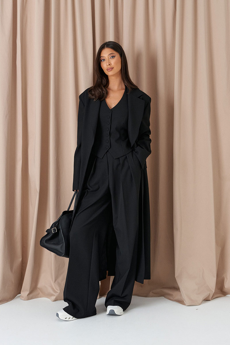 Жилет прилегающего силуэта. Выполнен из костюмной ткани чёрного цвета. С подкладкой. Вырез декольте V-образный. Спинка открытая, с хлястиком и пуговичкой. Застёжка центральная пуговицы.