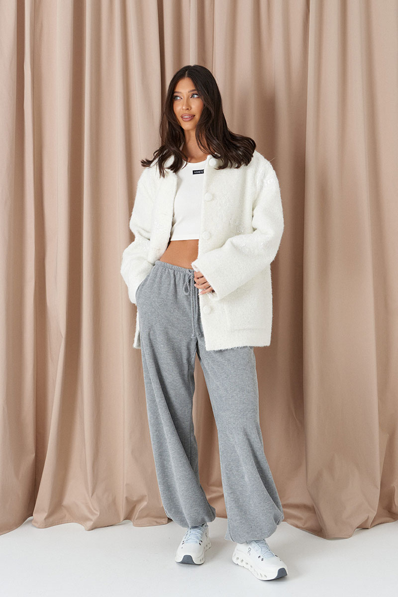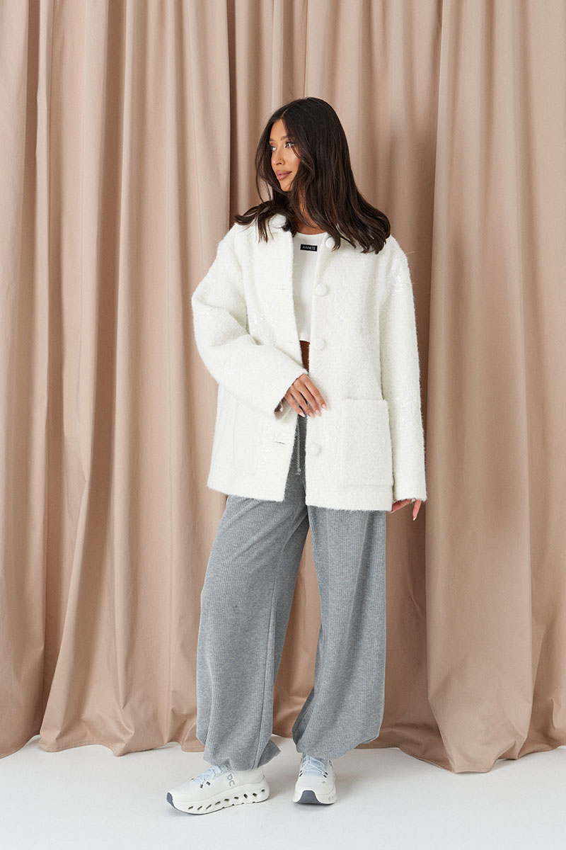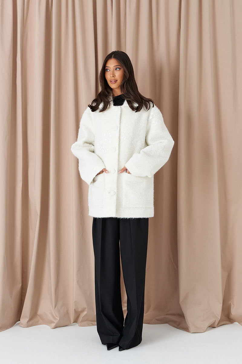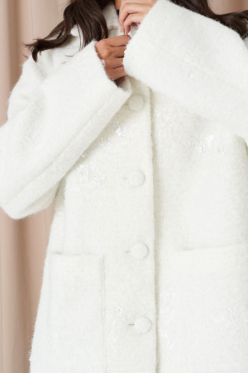 Жакет прямого свободного кроя выполнен из полотна ворсистой тектуры белого цвета с декоративной вышивкой из пайеток.Характеристики: прямой свободный крой,брендированная подкладка, застежки центральные на петли - пуговицы, по переду нашиты функциональные карманы, рукав втачной.