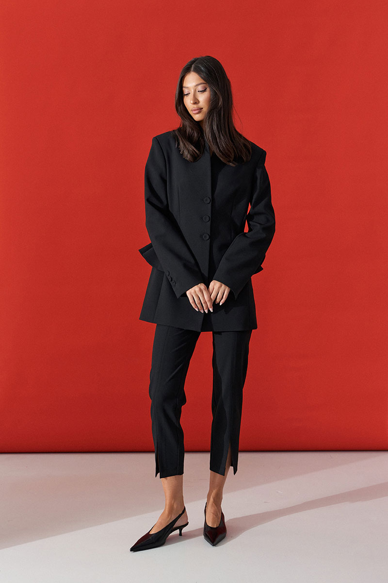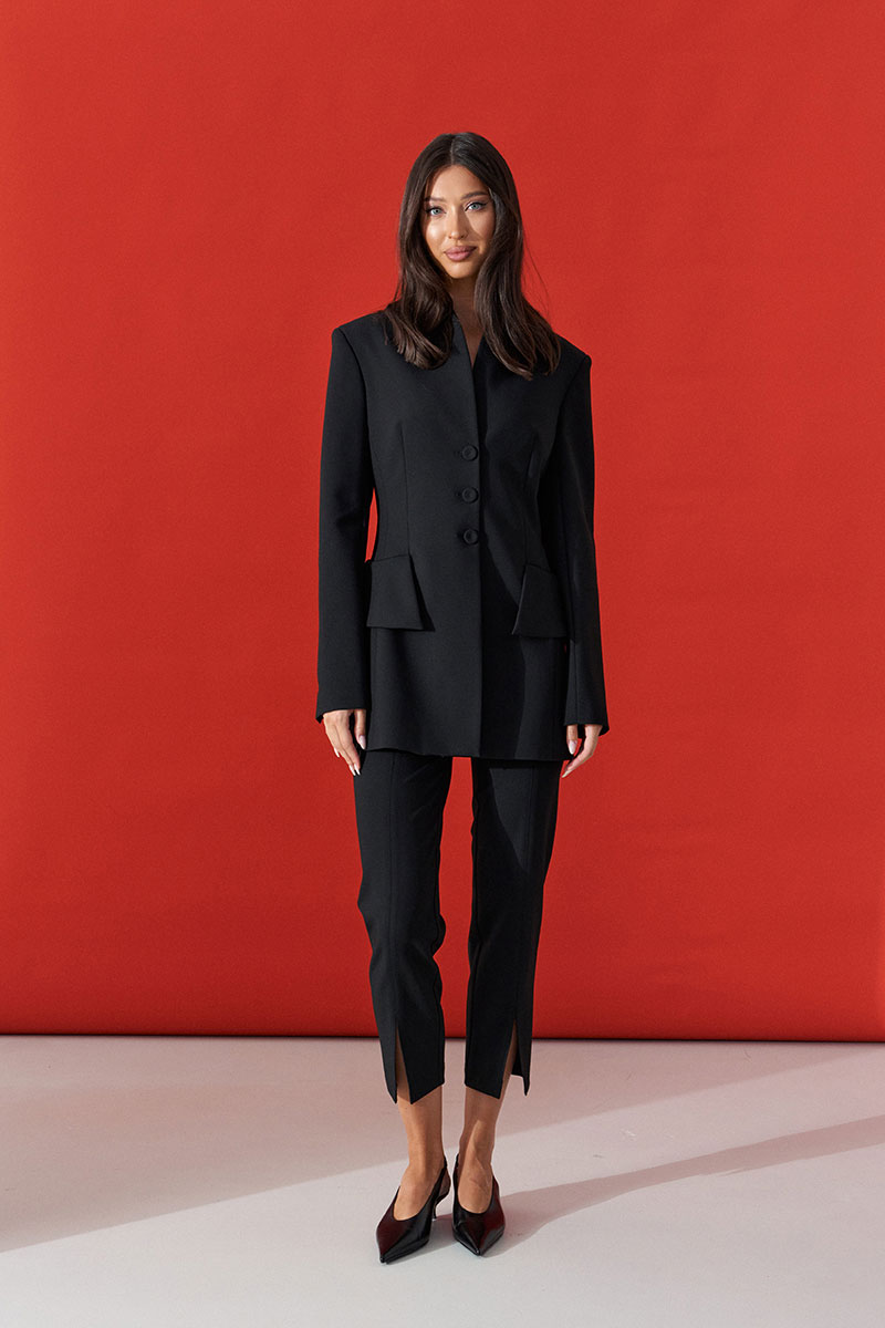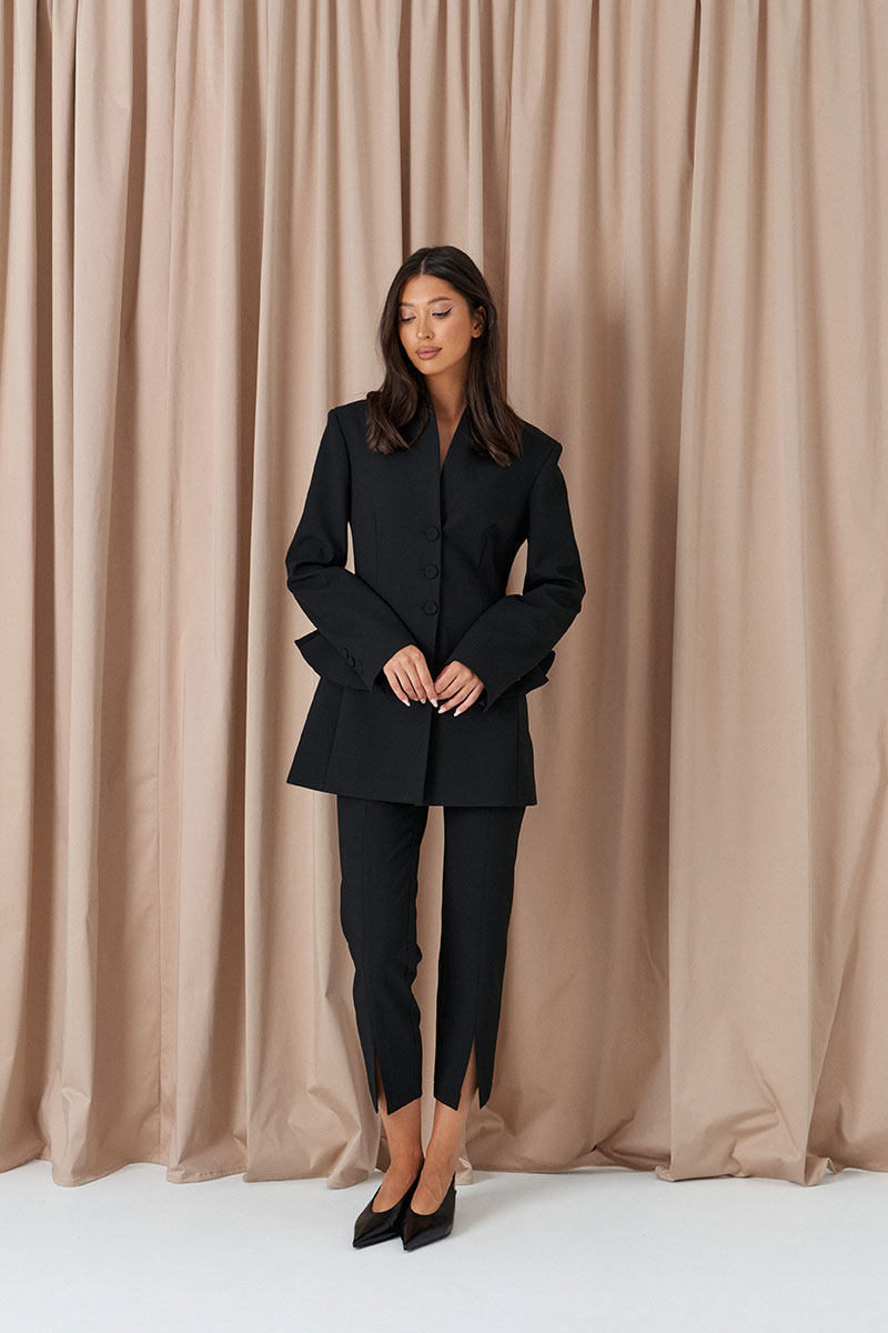 Жакет прилегающего силуэта выполнен из костюмный ткани черного цвета. Характеристики: прилегающий силуэт, однобортный, подплечники, вортник стойка переходяший в V-образный вырез, брендированная подкладка, застежка центральная на 3 пуговицы, рукав втачной, по низу рукава 3 пуговицы, декоративный волан, вставленный по талии.