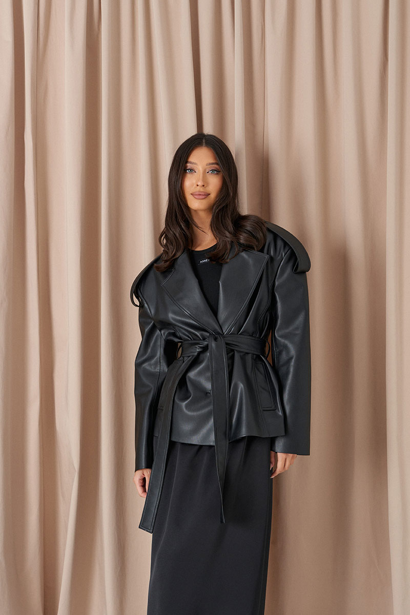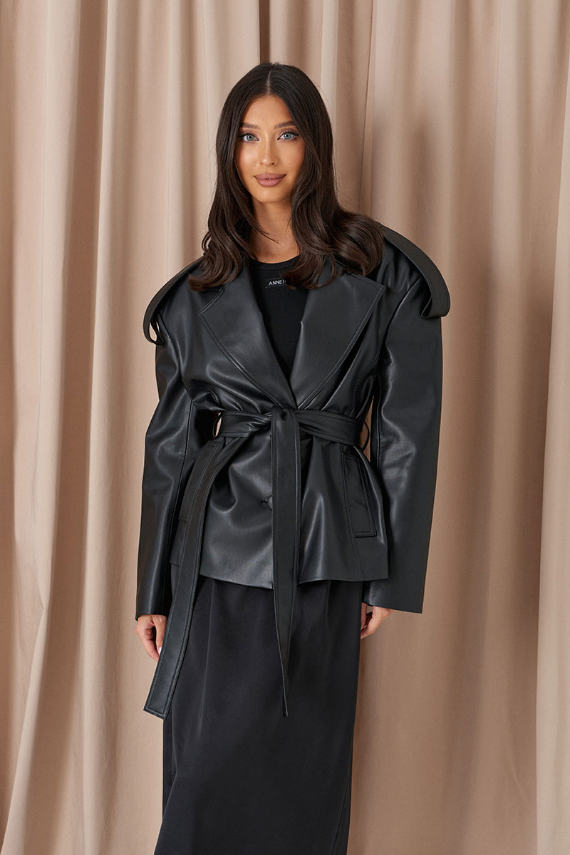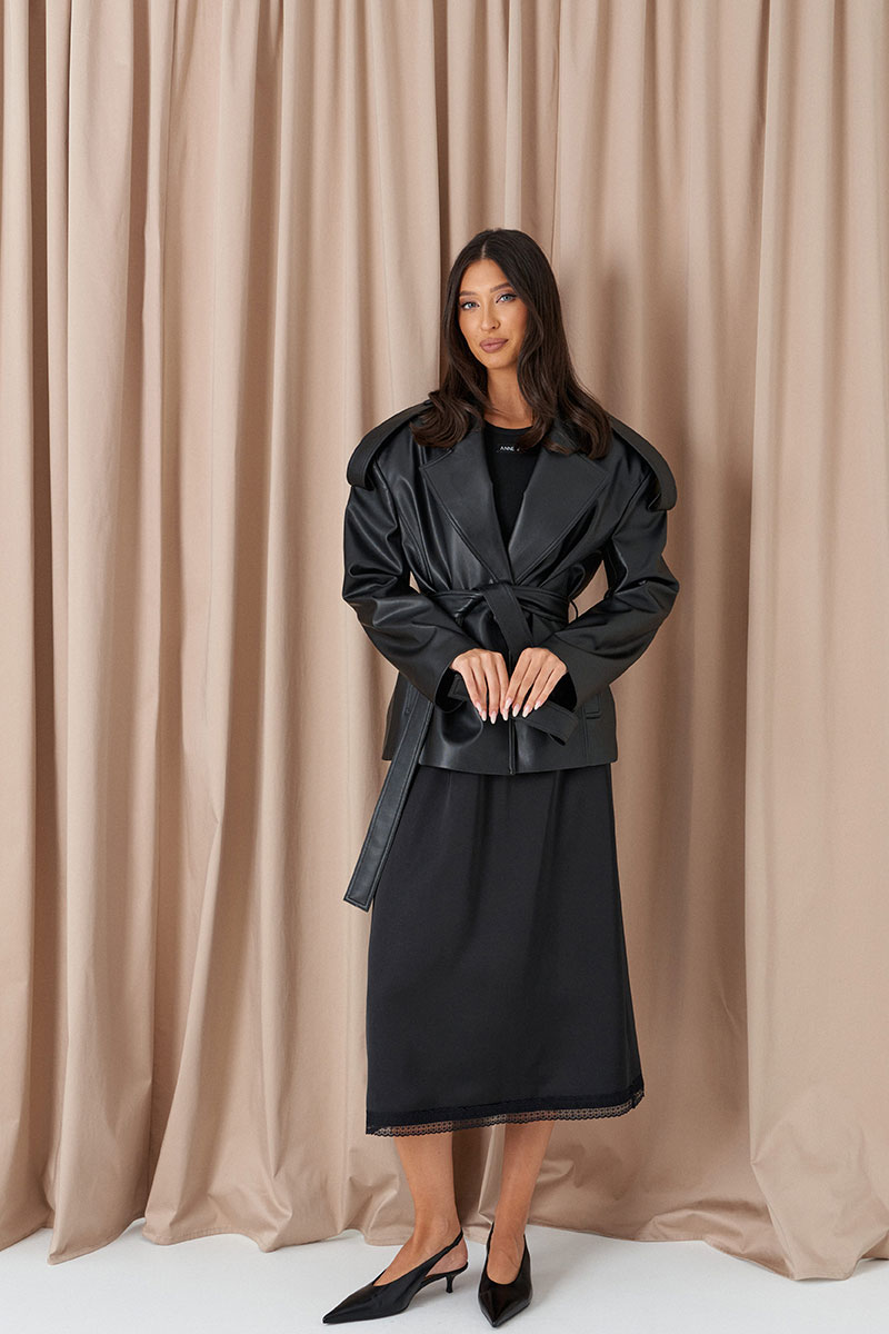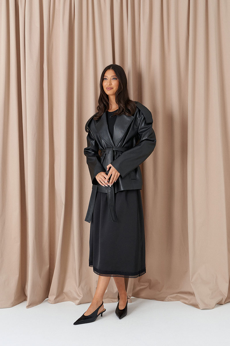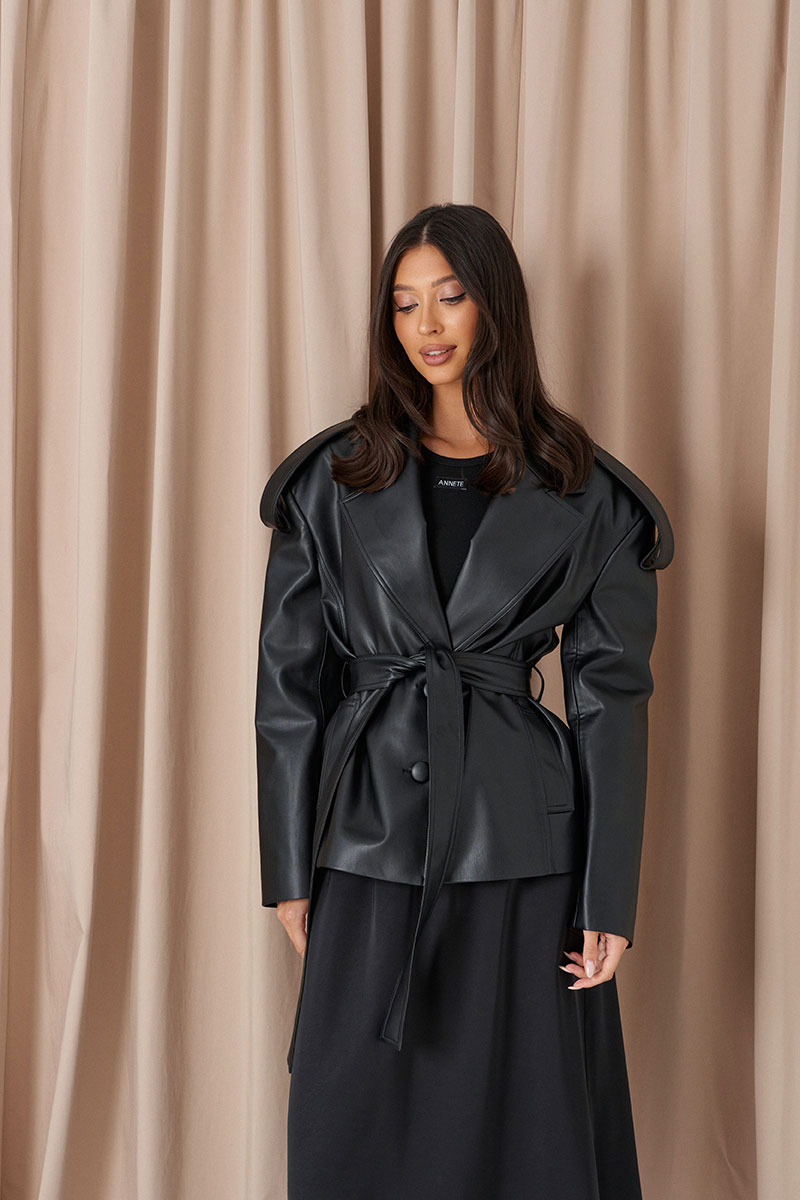 Жакет прямого кроя выполнен из экокожи черного цвета. Характеристики: прямой крой, покладка, подплечники, отложной воротник с остроугольным лацканом, застежка центральная на петли пуговицы, по линии талии шлевки, в комплекте пояс из ткани основного изделия, рукав втачной. По линии плеча погон с пуговицей, в среднем шве заднего полотна изделия шлица 17 см. В боковых швах изделия карманы.