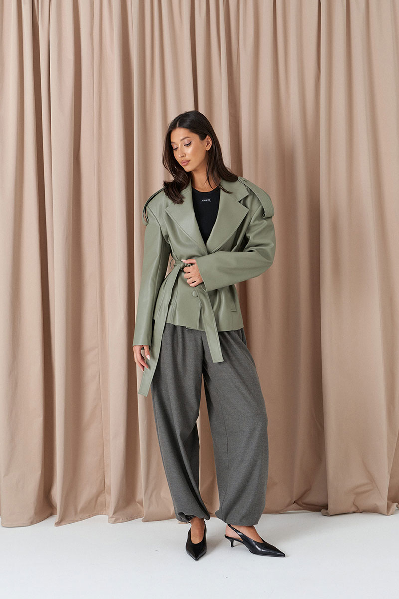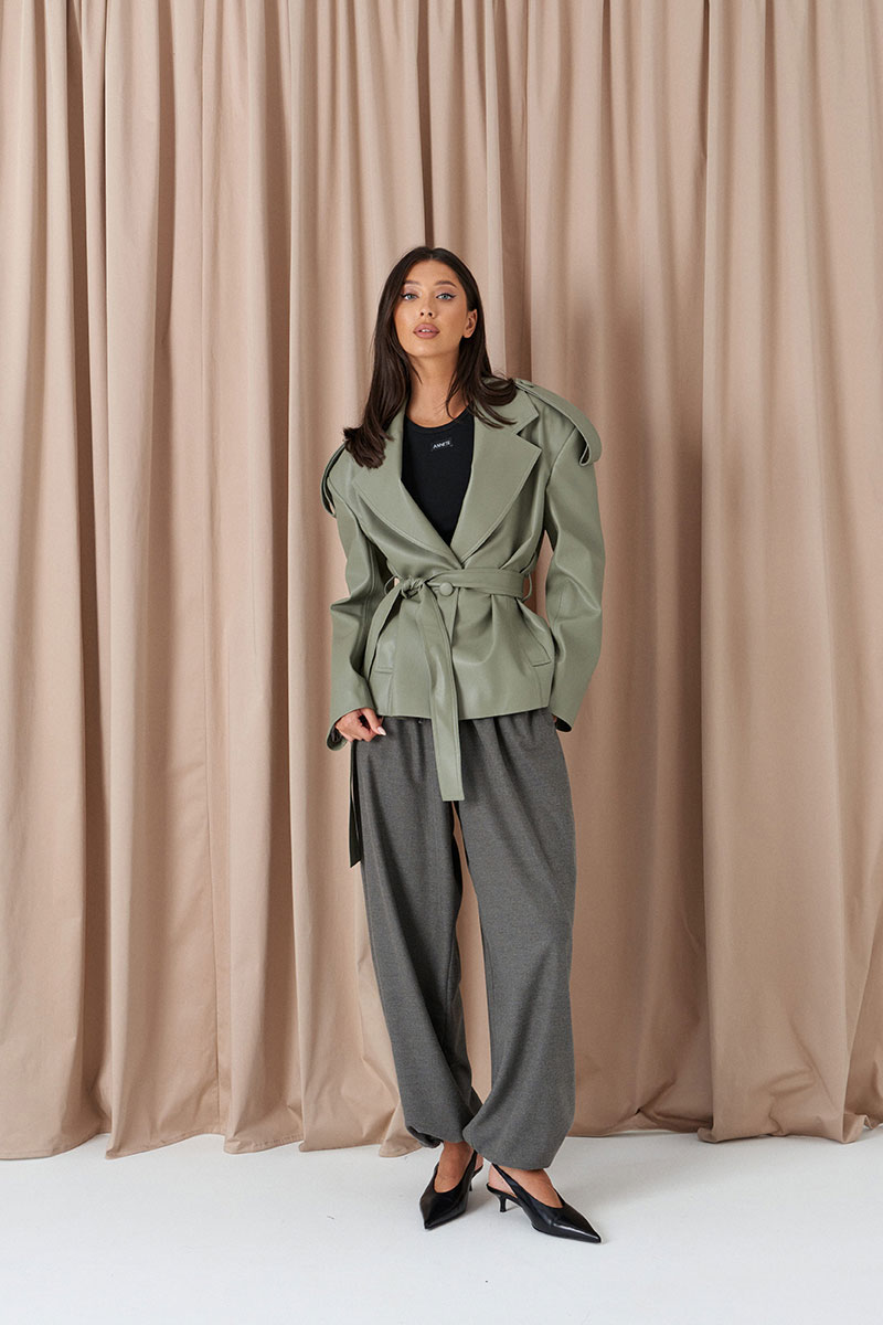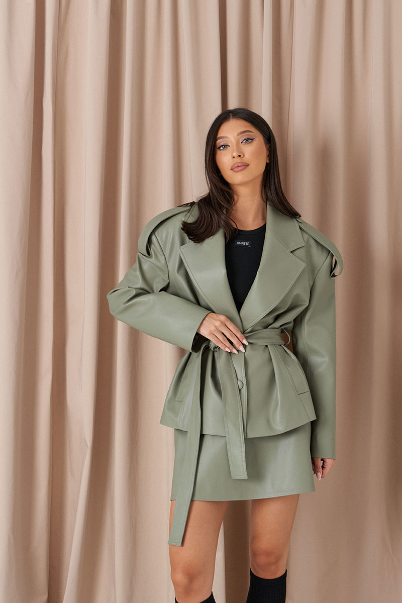 Жакет прямого кроя выполнен из экокожи эвкалиптового цвета. Характеристики: прямой крой, покладка, подплечники, отложной воротник с остроугольным лацканом, застежка центральная на петли пуговицы, по линии талии шлевки, в комплекте пояс из ткани основного изделия, рукав втачной. По линии плеча погон с пуговицей, в среднем шве заднего полотна изделия шлица 17 см. В боковых швах изделия карманы.