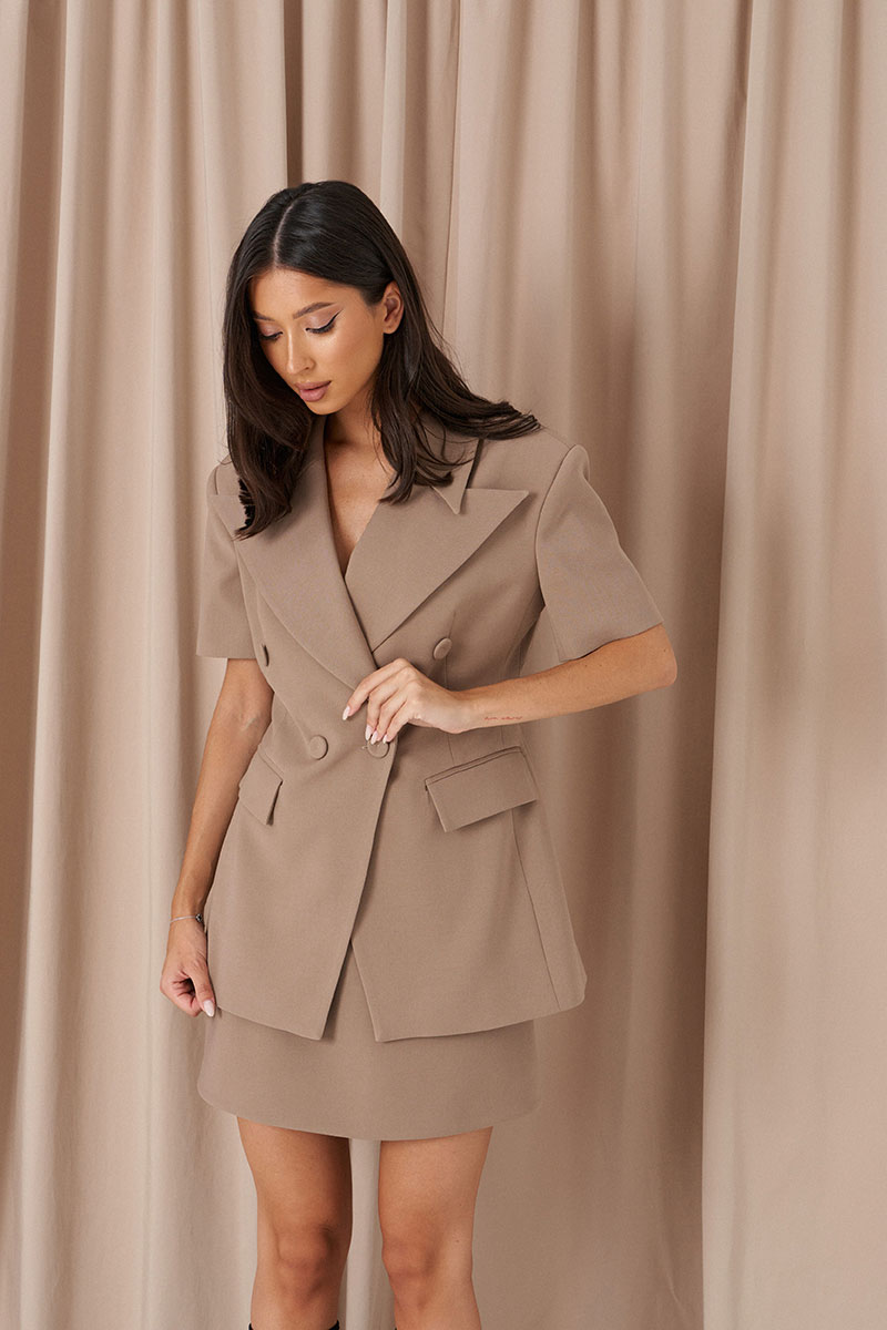 Жакет двубортный, полуприталленого силуэта. Выполнен из костюмной ткани кофейного цвета. Характеристика: отложной воротник с остроугольными геометрическими лацканами, вточной рукав, подклад, подплечники, талиевые выточки по переду, отрезная боковая планка, по переду изделия карманы-листочки, талиевые вытачки по спинке, брендированная подкладка.