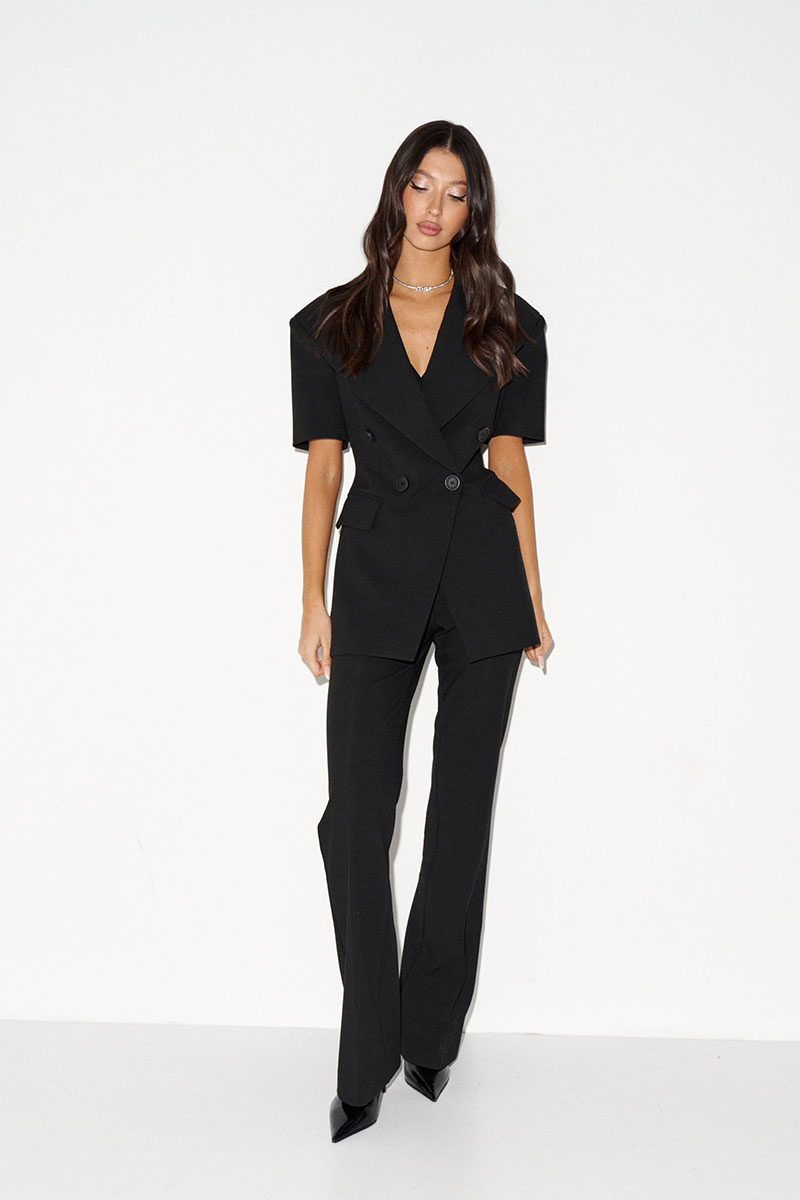 Жакет двубортный, полуприталленого силуэта. Выполнен из костюмной ткани чёрного цвета. Характеристика: отложной воротник с остроугольными геометрическими лацканами, вточной рукав, подклад, подплечники, талиевые выточки по переду, отрезная боковая планка, по переду изделия карманы-листочки, талиевые вытачки по спинке, брендированная подкладка.