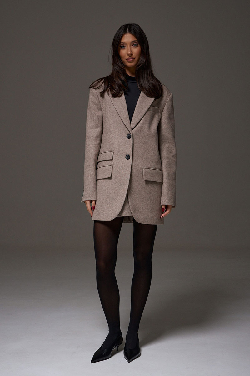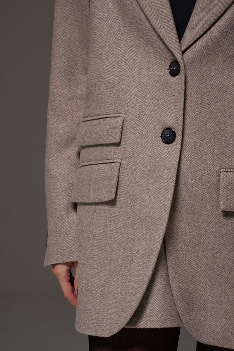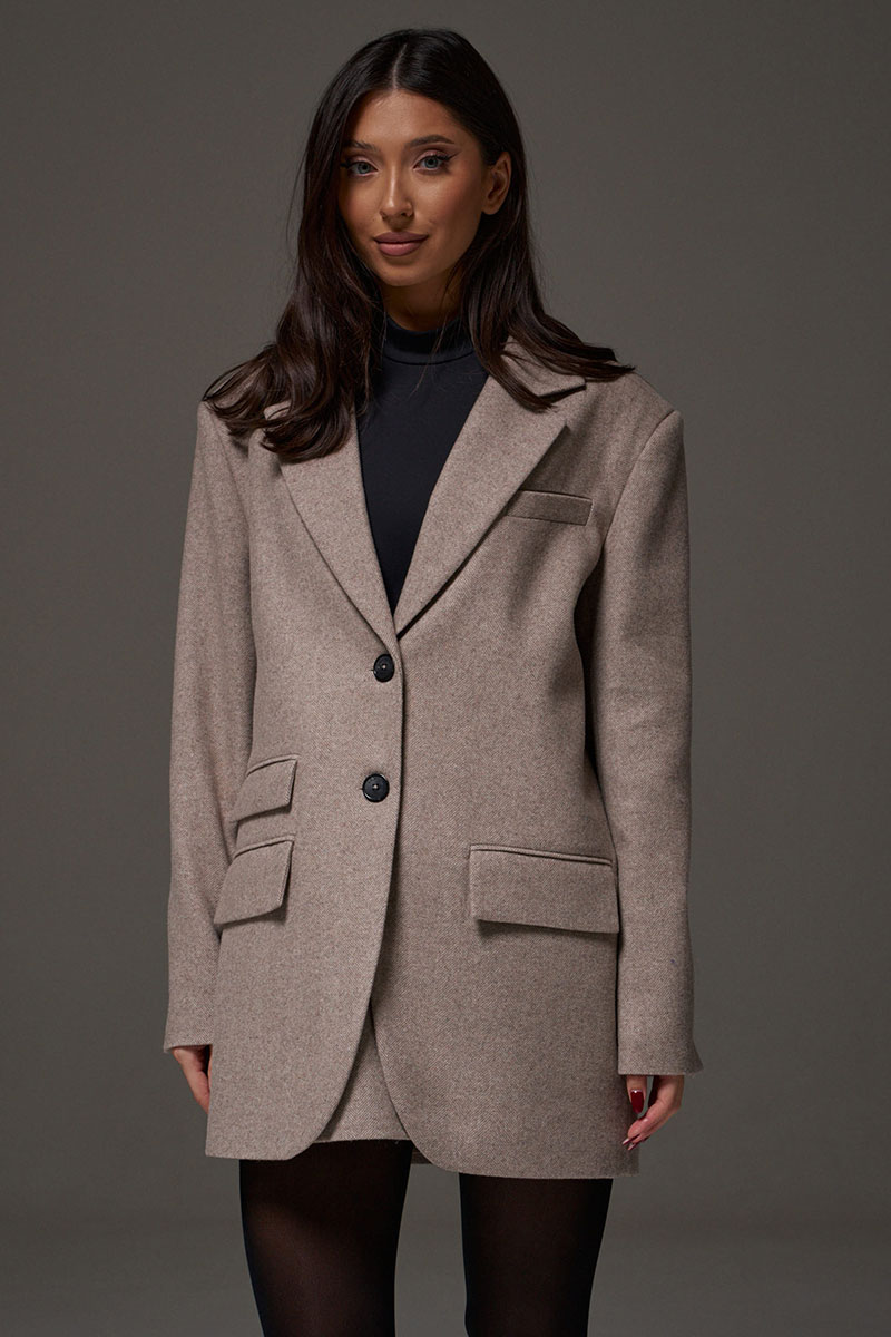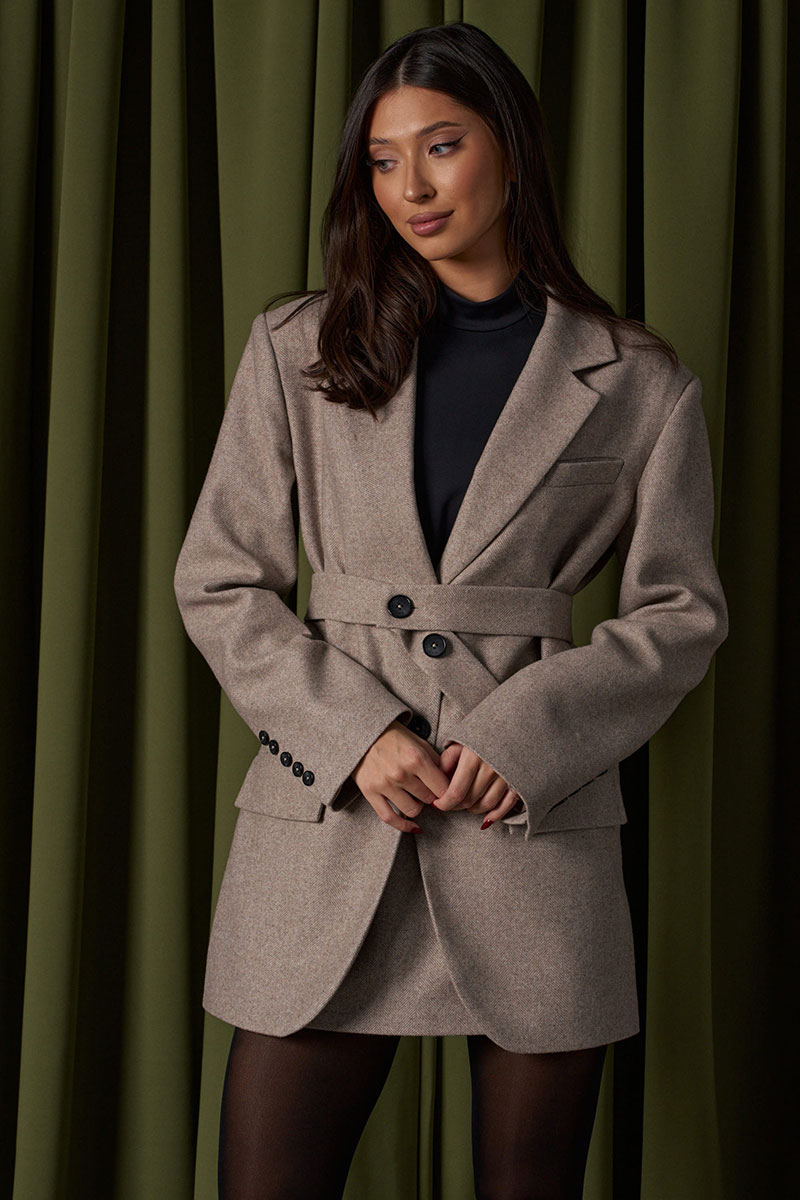 Жакет прямого свободного кроя выполнен из фактурного полотна. Характеристики: прямой свободный крой, подплечники, подкладка, отложной воротник с лацканом, застежка центральная на петли пуговицы, по переду прорезной кармашек «обманка», функциональный карман с клапаном, рукав втачной прямого кроя, по низу рукава нашиты пуговички. низ изделия с плавным срезом, в комплекте пояс из ткани основного изделия.