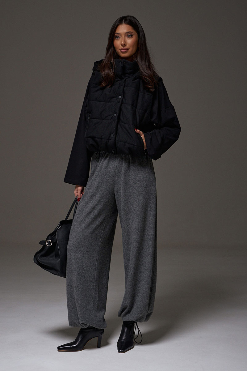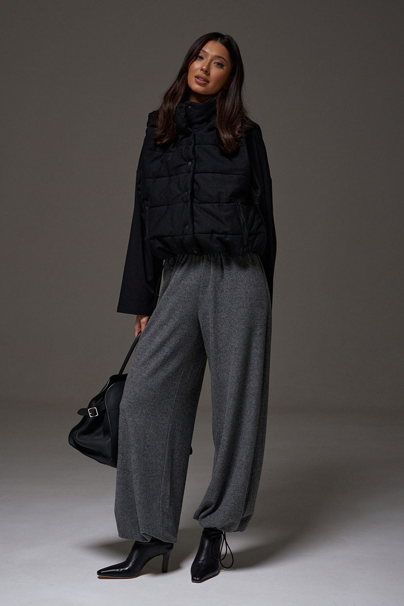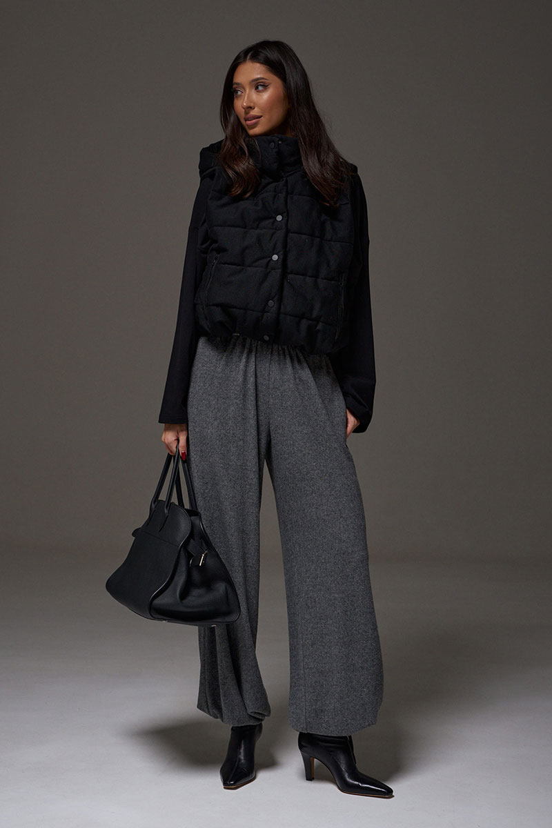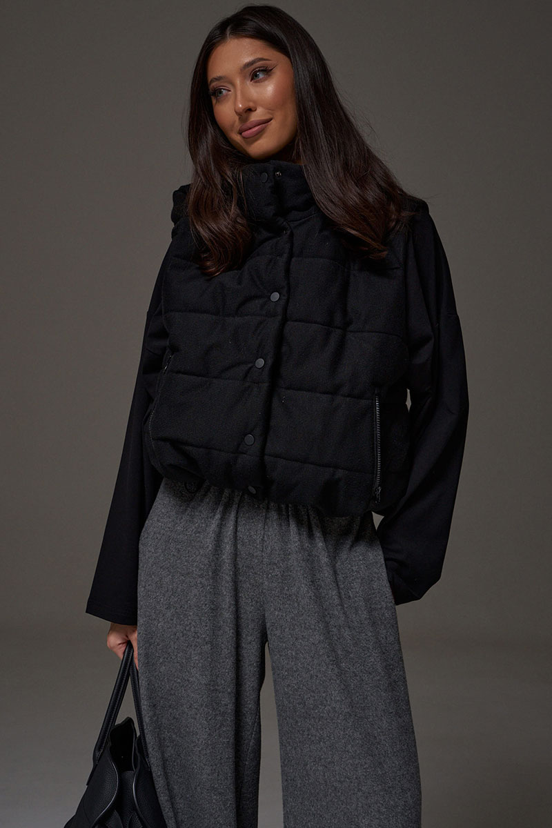 Жилет укороченный, выполнен из стеганной трикотажной ткани черного цвета. Характеристика: жилет А-силуэта, вортник стойка, капюшон цельный с жилетом, центральная застежка на молнию, скрывается под планкой на кнопках, боковые карманы на молнии, по низу изделия резинка с фиксаторами, брендированный подклад, спинка цельнокройная.
