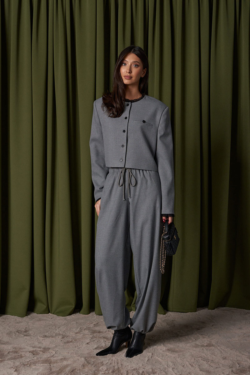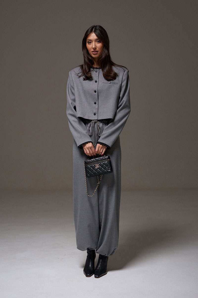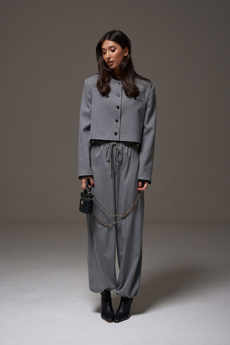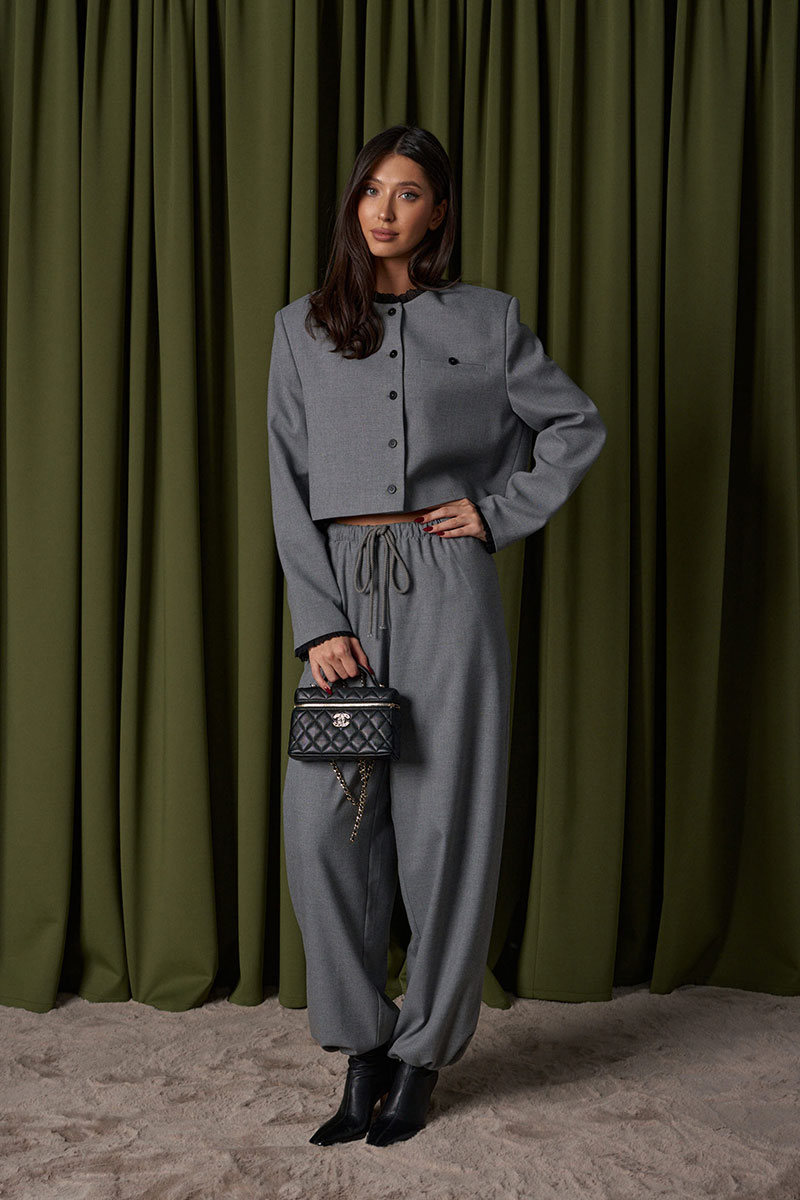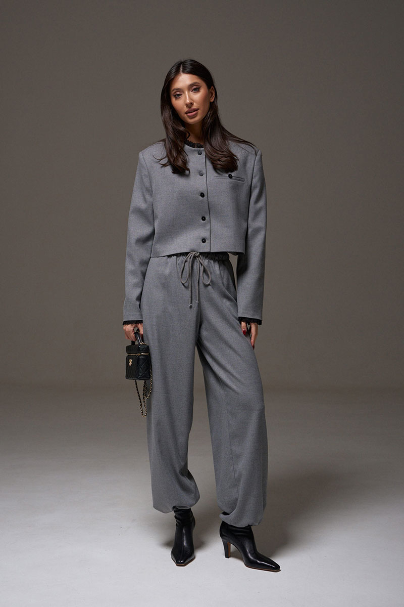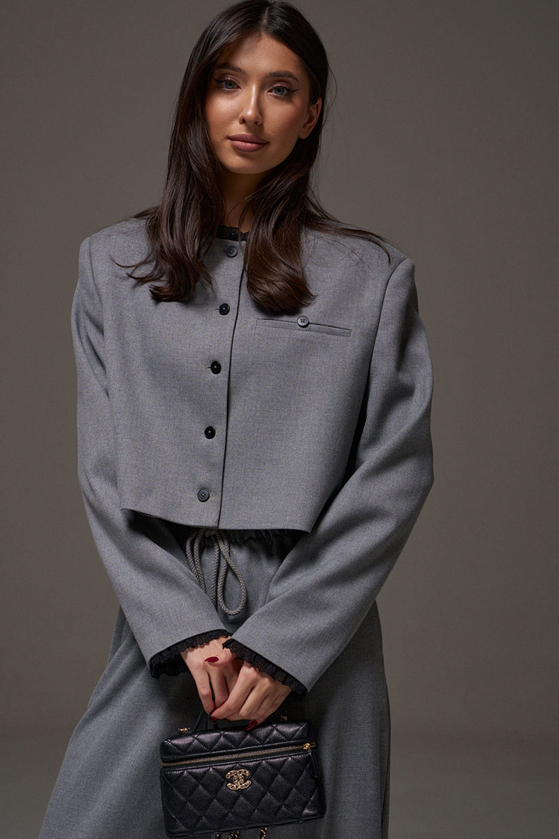 Жакет укороченный прямого свободного кроя. Выполнен из текстильной ткани серого цвета. С подкладкой. Горловина круглая. По переду на уровне груди слева имитация кармана с листочкой с пуговицей. Застёжка центральная - пуговицы. Рукав втачной. Горловина и низ рукава декорированы кружевом.
