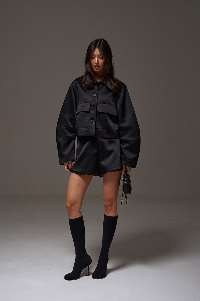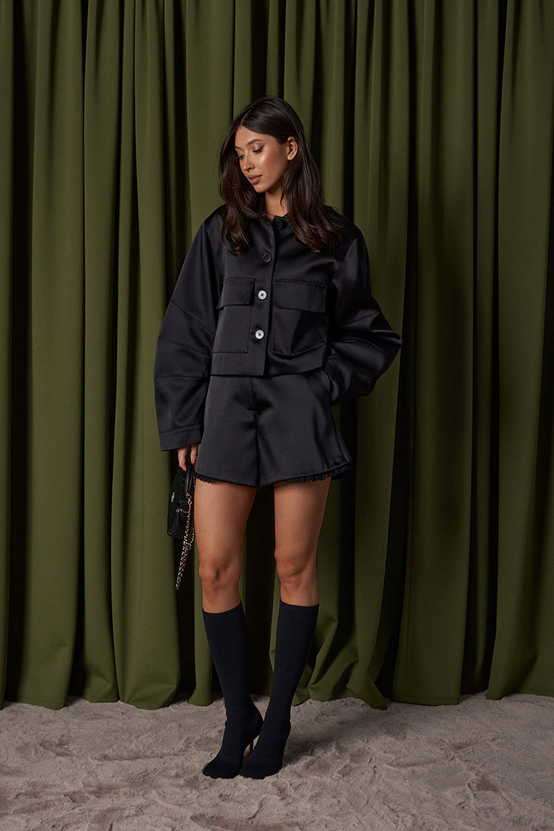 Жакет прямого свободного кроя. Выполнен из плотного текстильного полотна с лёгким блеском. С подкладкой. Воротник отложной из фактурной эко-кожи. Рукав втачной, объёмный, с выточками, с узкой манжетой. Застёжка центральная - пуговицы. По переду внизу накладные карманы с клапаном. Спинка с отрезной кокеткой.