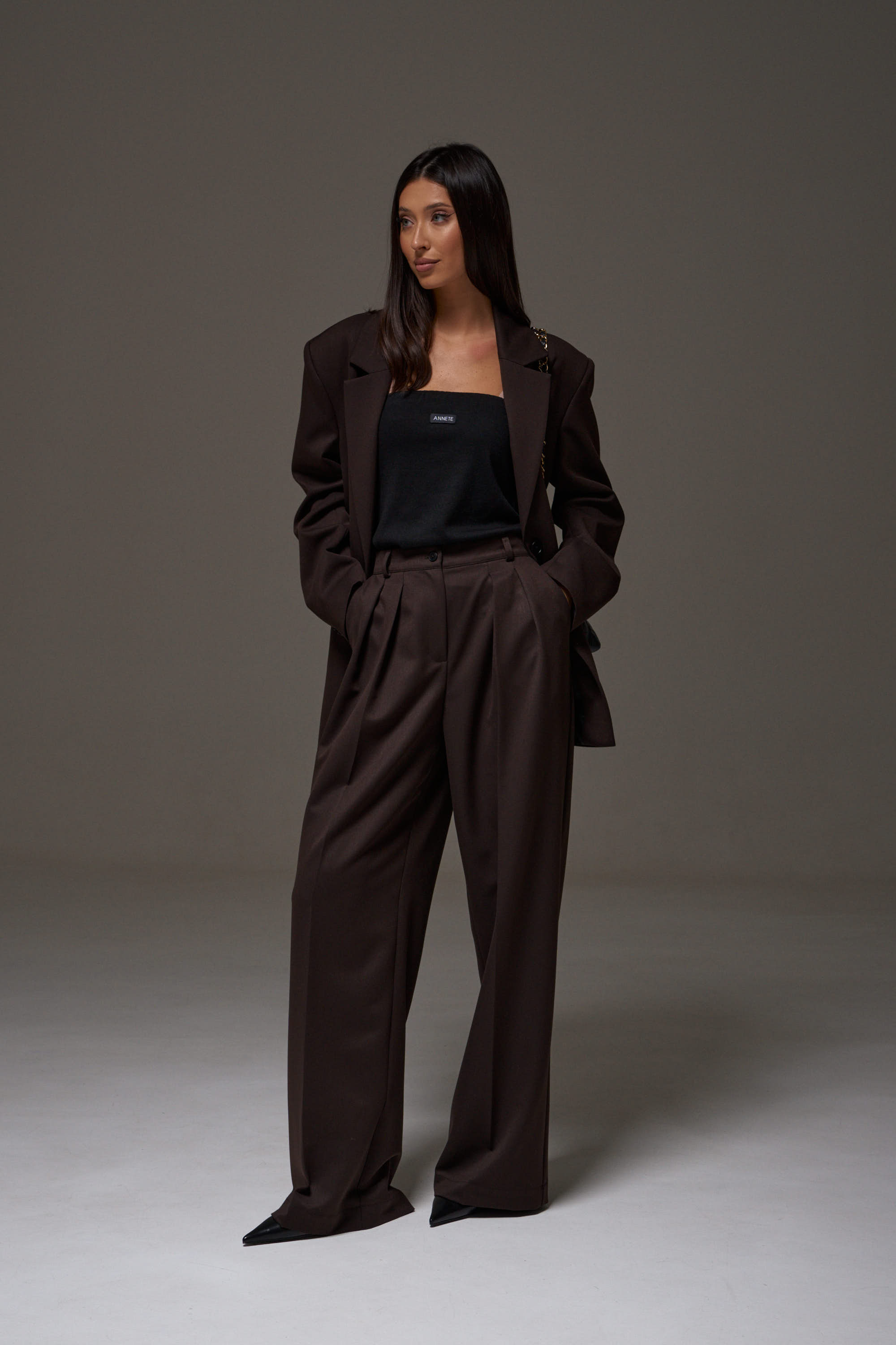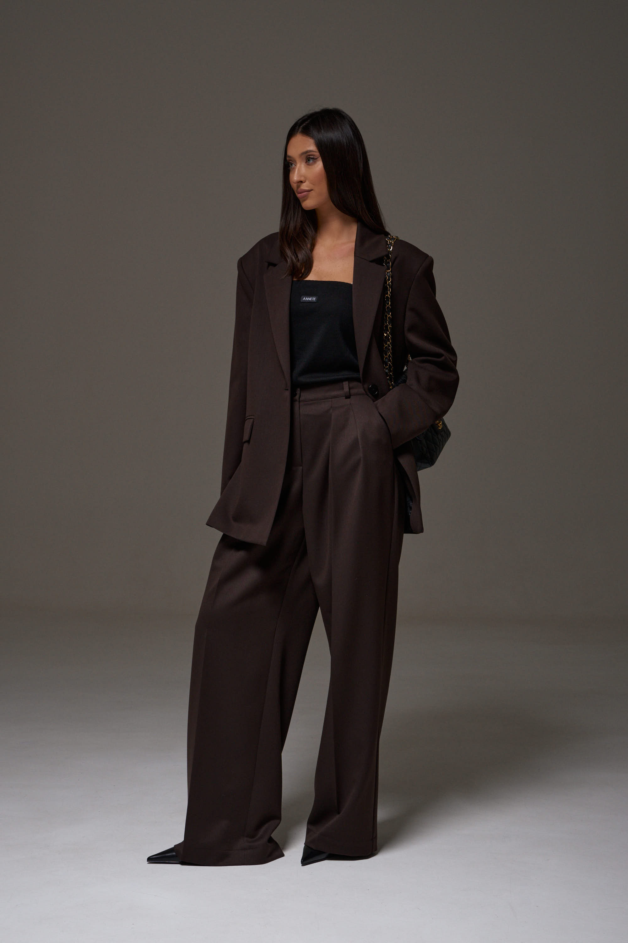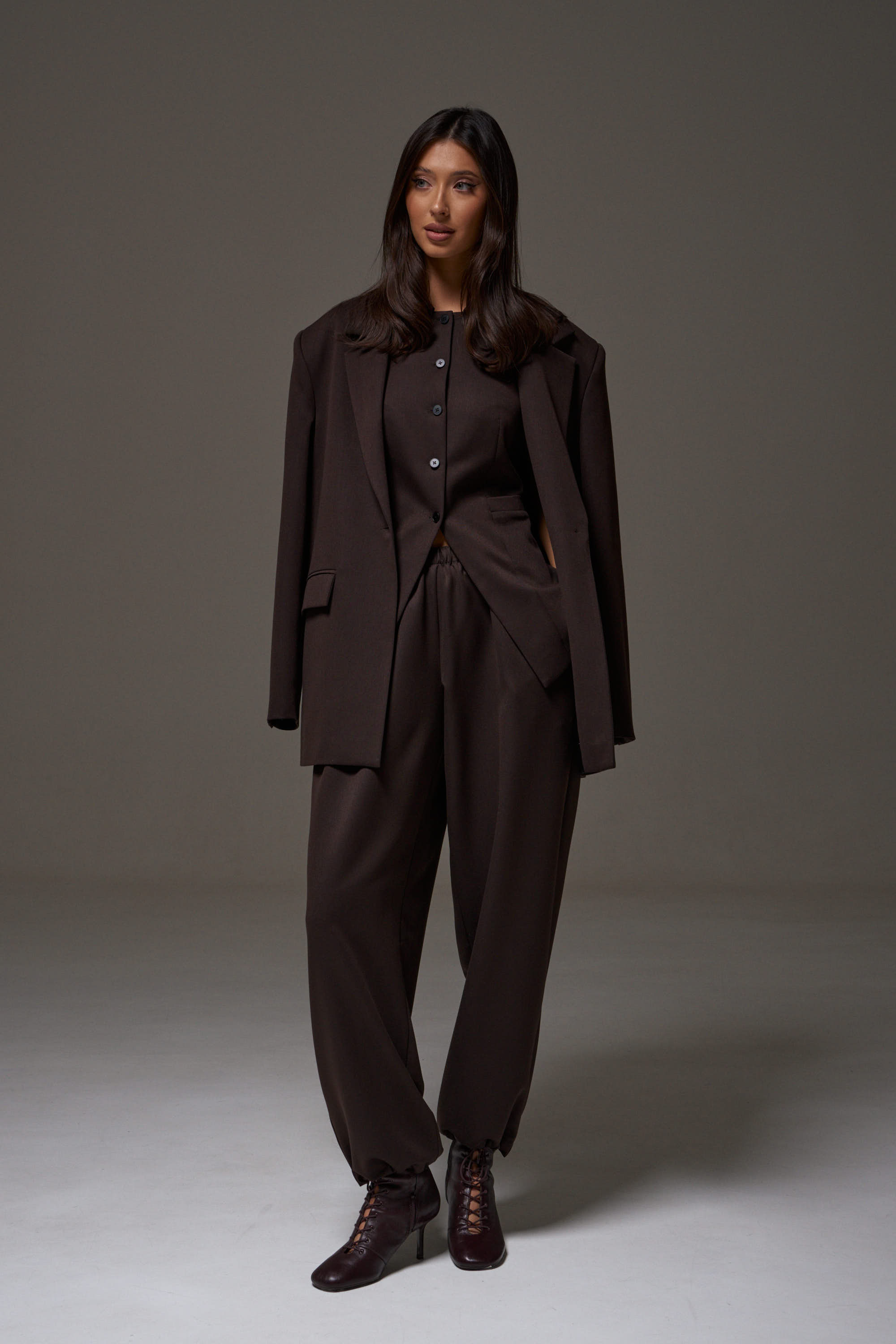 Жакет прямого свободного кроя выполнен из костюмной ткани темно-коричневого цвета. Характеристики: прямой свободный крой, брендированная подкладка, подплечники, воротник с остроугольным лацканом, застежка центральная на петлю - пуговицу, по переду функциональные карманы с клапаном, рукав втачной, по низу рукава нашиты пуговички, спинка со средним швом, в среднем шве разрез 24 см.