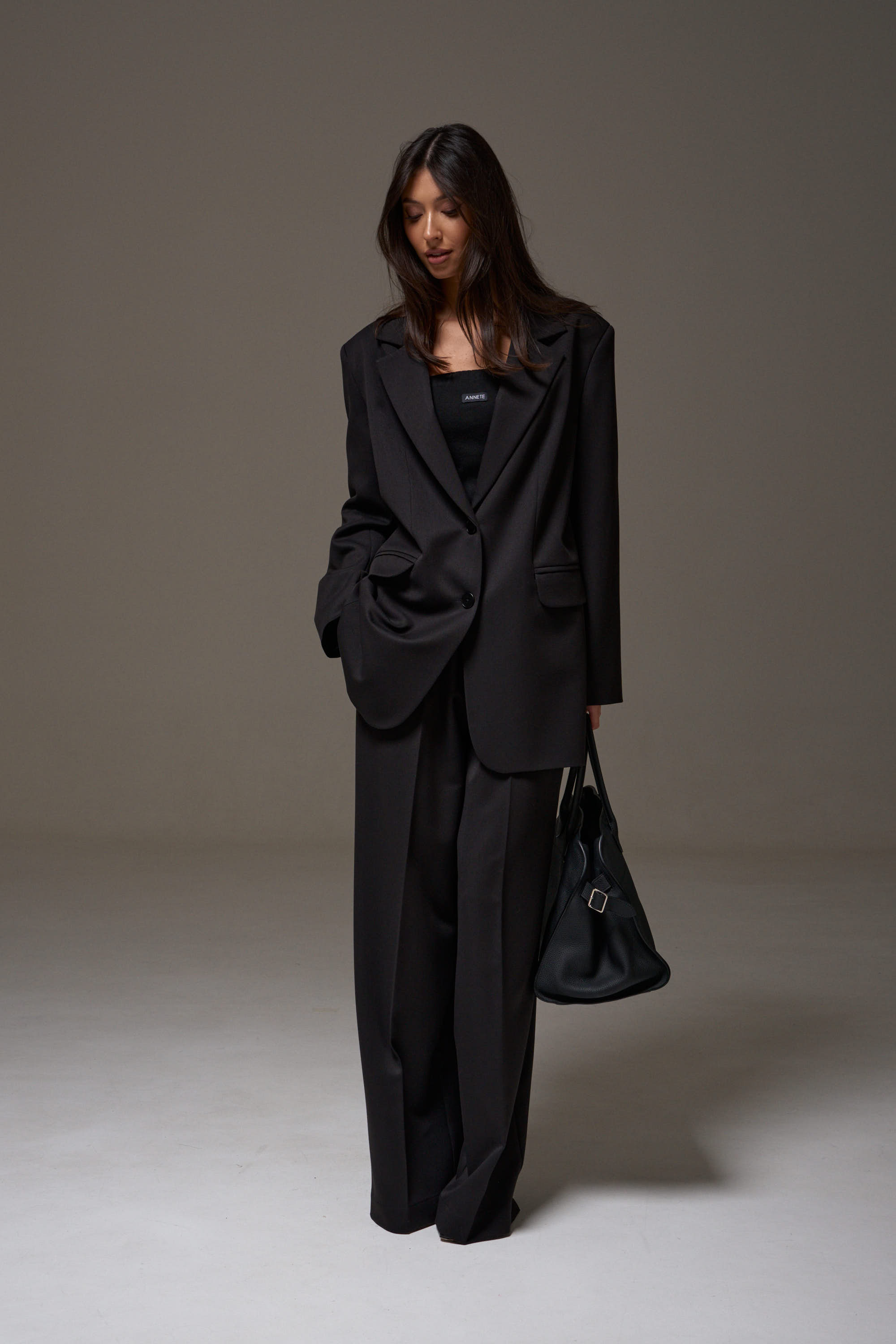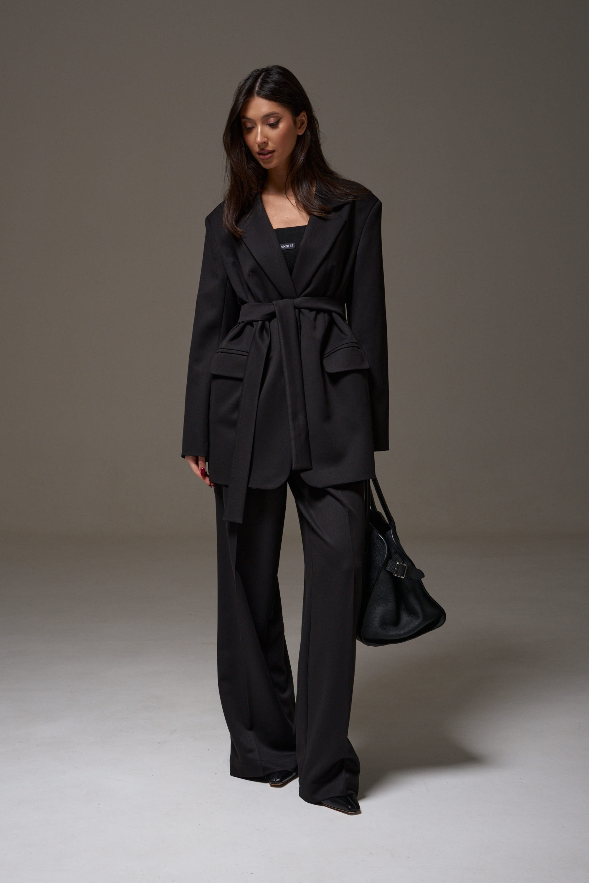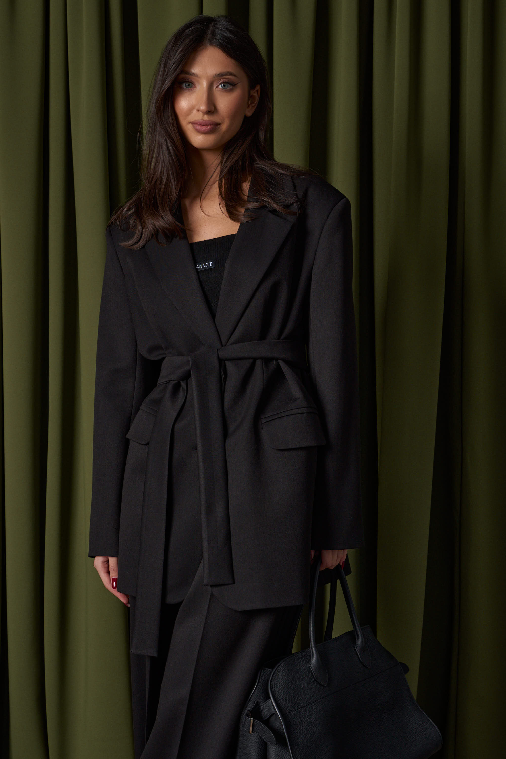 Жакет однобортный прямого свободного кроя, выполнен из текстильного полотна черного цвета. Характеристики: брендированная подкладка, подплечники, воротник с остроугольным лацканом, застежка центральная на петли пуговицы, по переду карманы с клапаном, рукав втачной, спинка со средним швом, по низу изделия лацкан 29см, в комплекте пояс из ткани основного изделия.