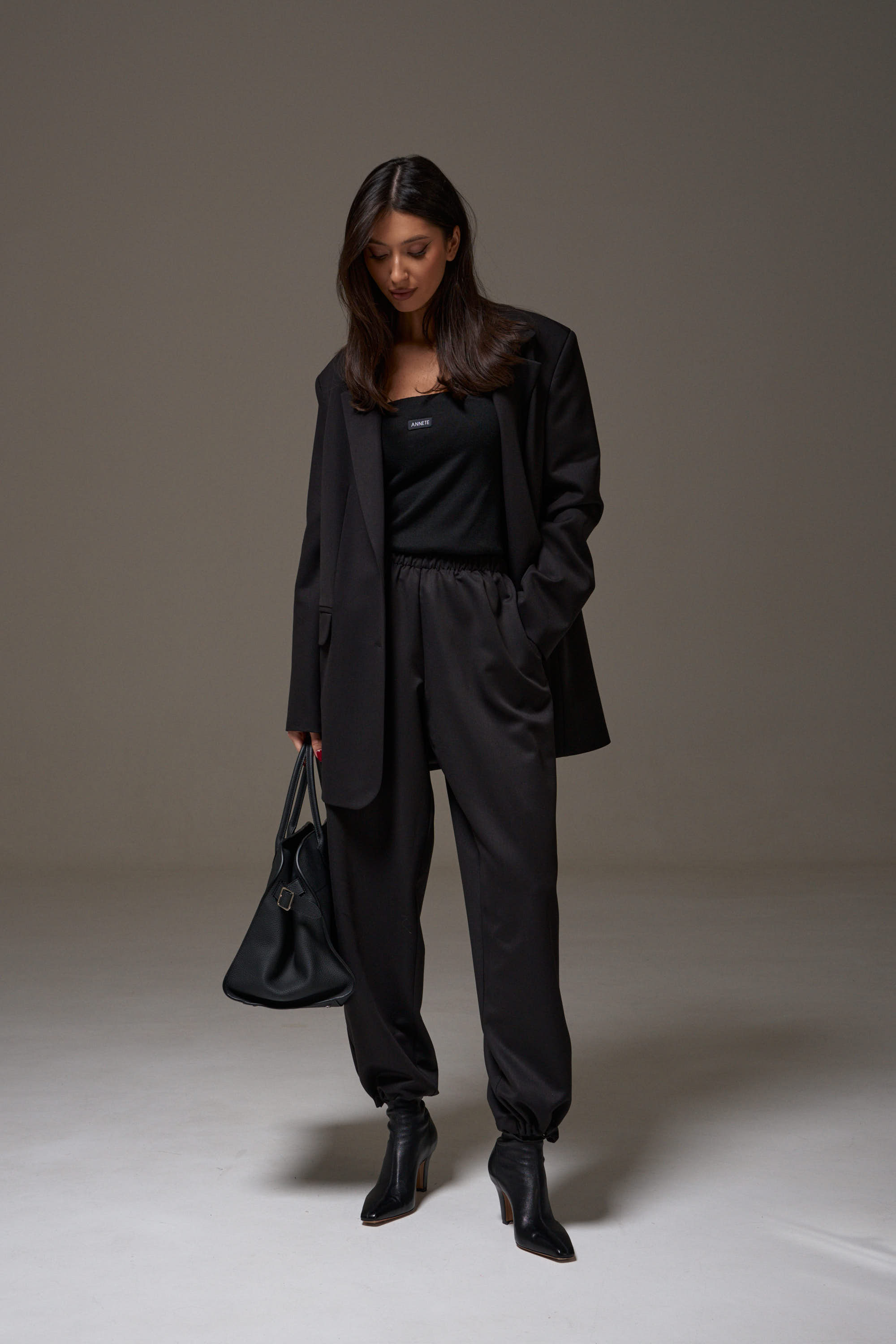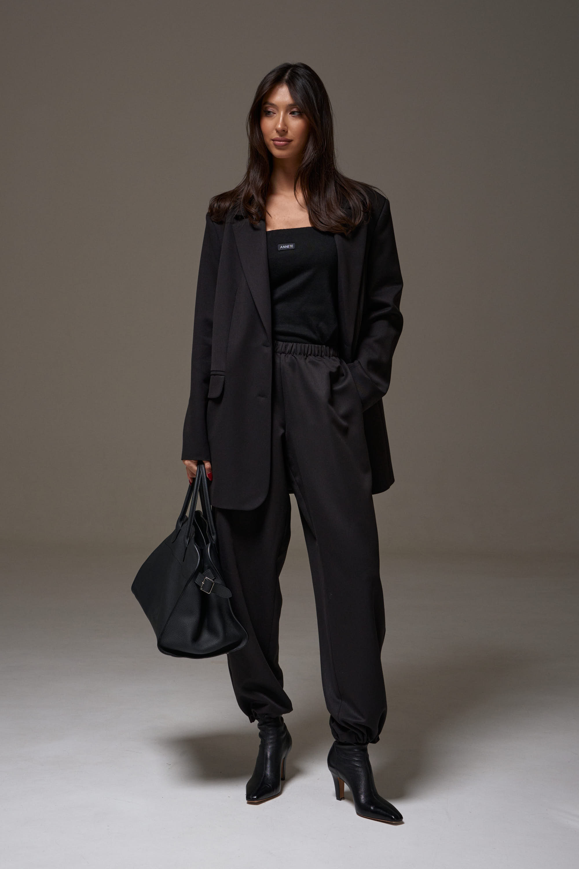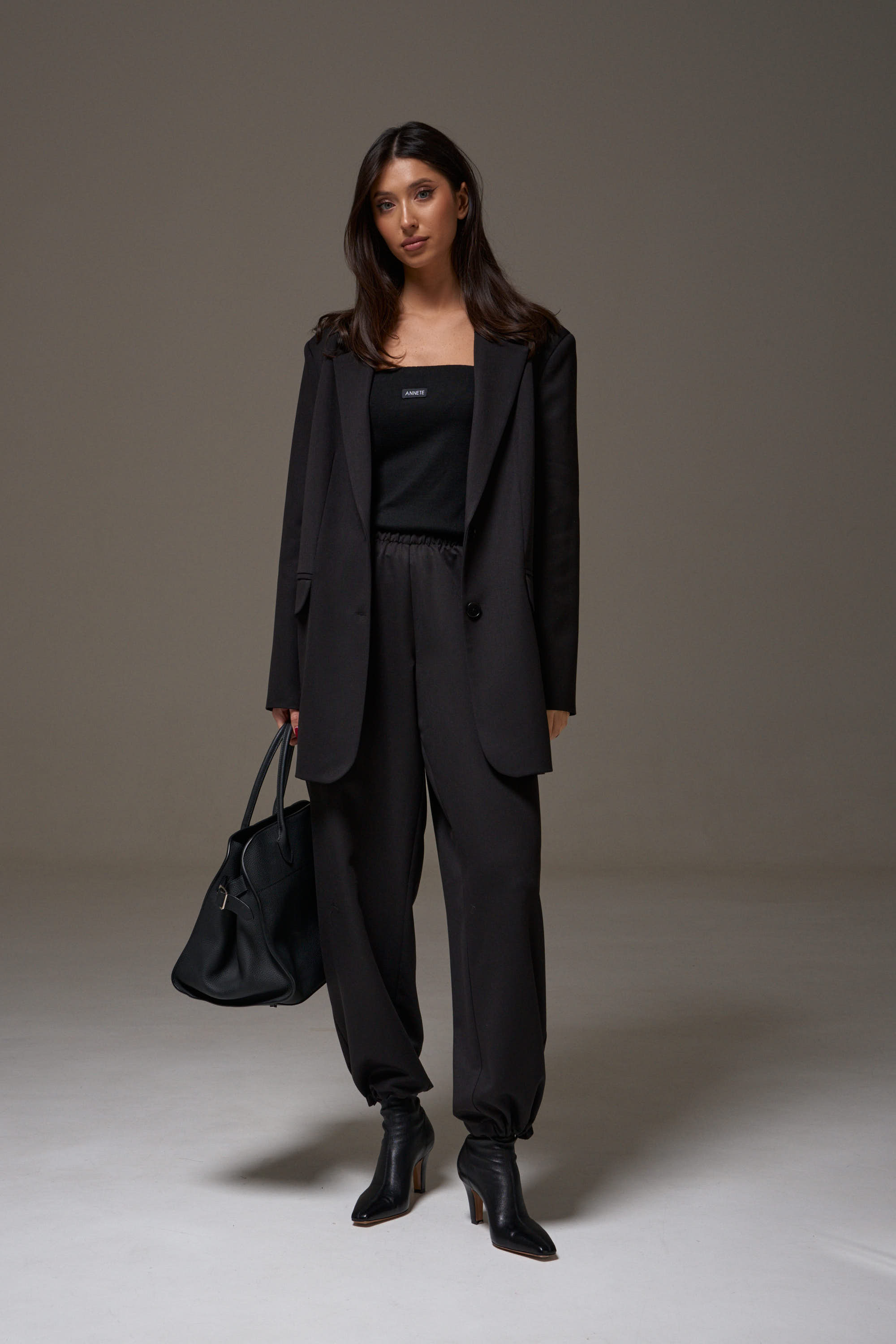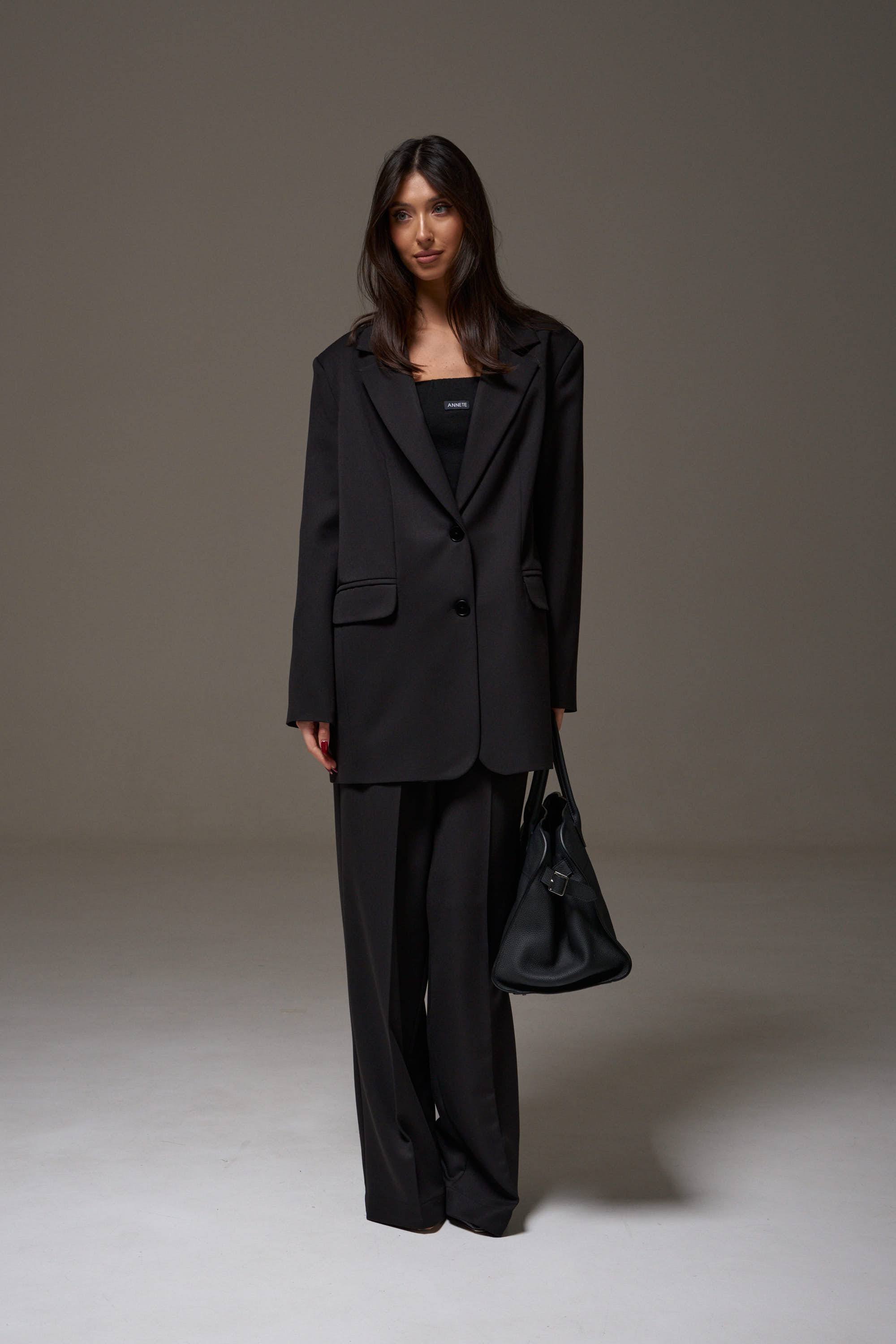 Жакет однобортный прямого свободного кроя, выполнен из текстильного полотна черного цвета. Характеристики: брендированная подкладка, подплечники, воротник с остроугольным лацканом, застежка центральная на петли пуговицы, по переду карманы с клапаном, рукав втачной, спинка со средним швом, по низу изделия лацкан 29см, в комплекте пояс из ткани основного изделия.