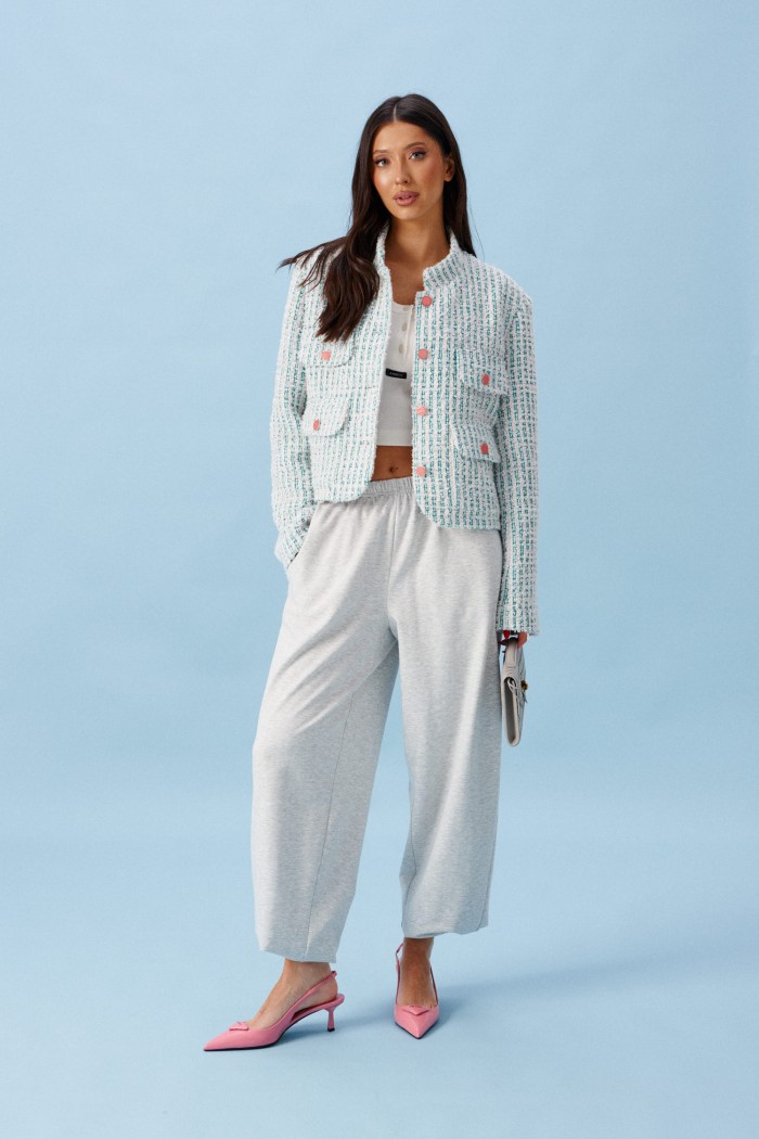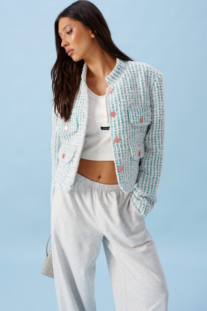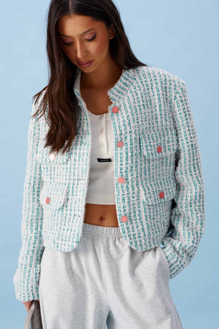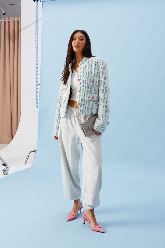 Жакет прямого свободного кроя, выполнен из фактурного твидового полотна. Характеристики: горловина стойка, застежка центральнаяна петли пуговицы, подплечники, рукав прямой, внутри брдендированная подкладка. На уровне линии груди декоративные карманы с клапаном, внизу накладные карманы с клапаном.