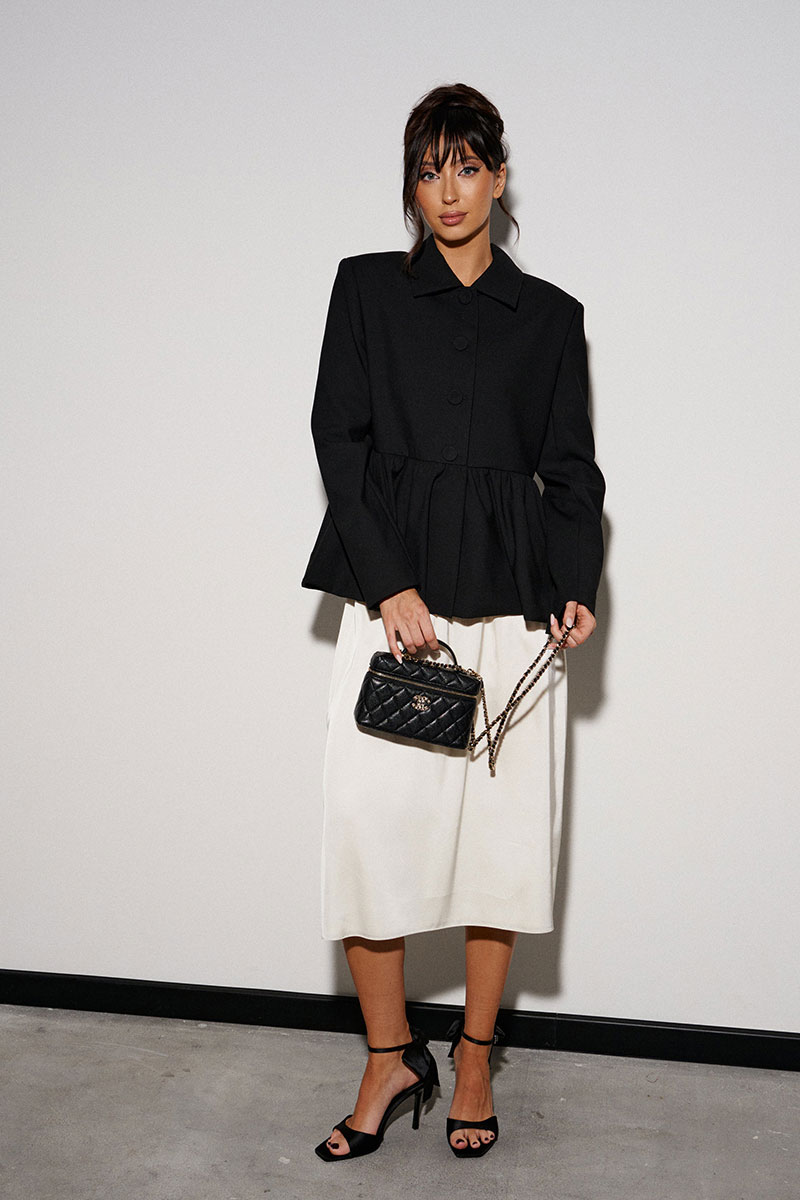 Жакет прямого кроя, с баской по нижней части изделия. Выполнен из костюмной ткани. Характеристики: брендированая подкладка, отложной воротник, застежка центральная на пуговички, рукав втачной.
