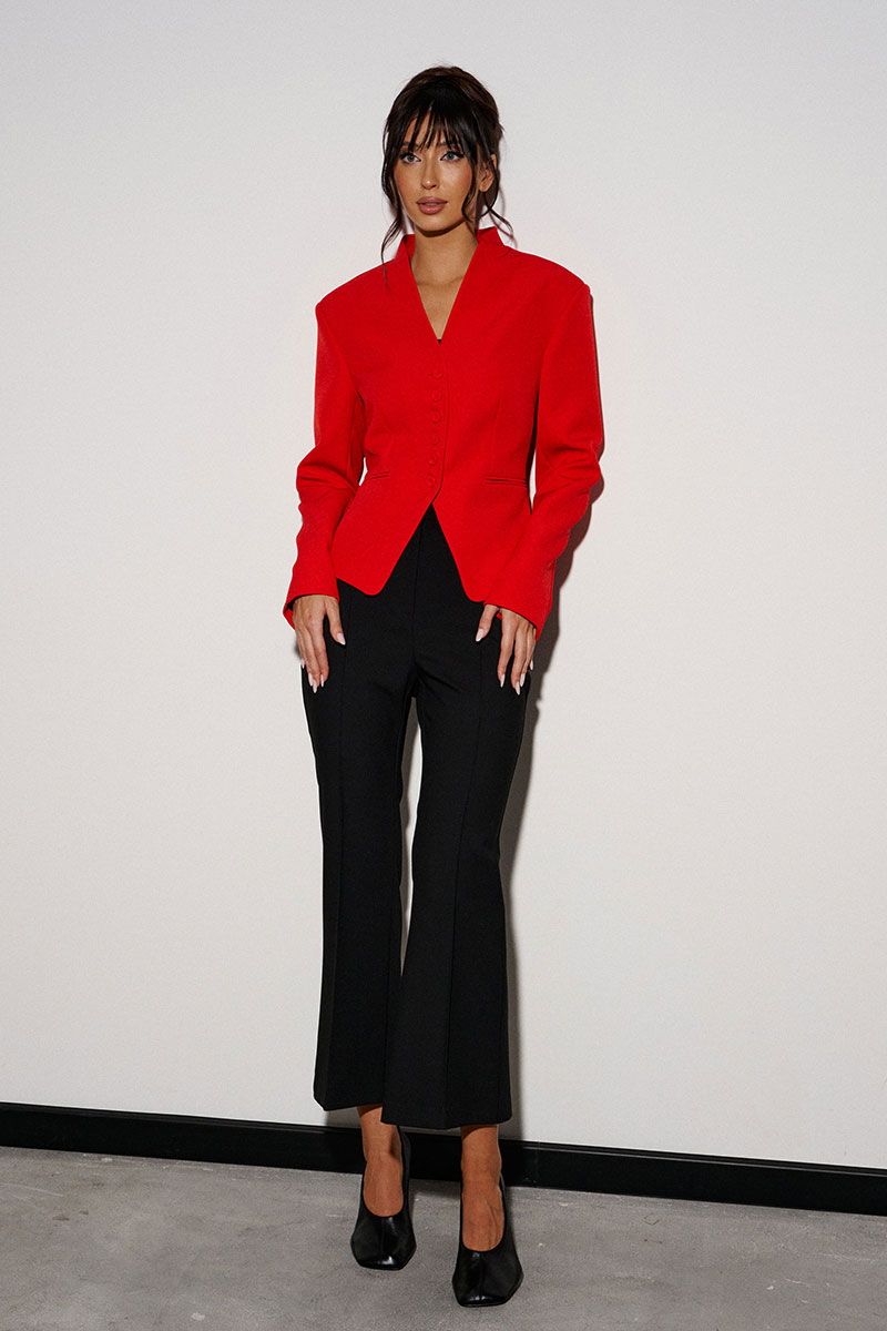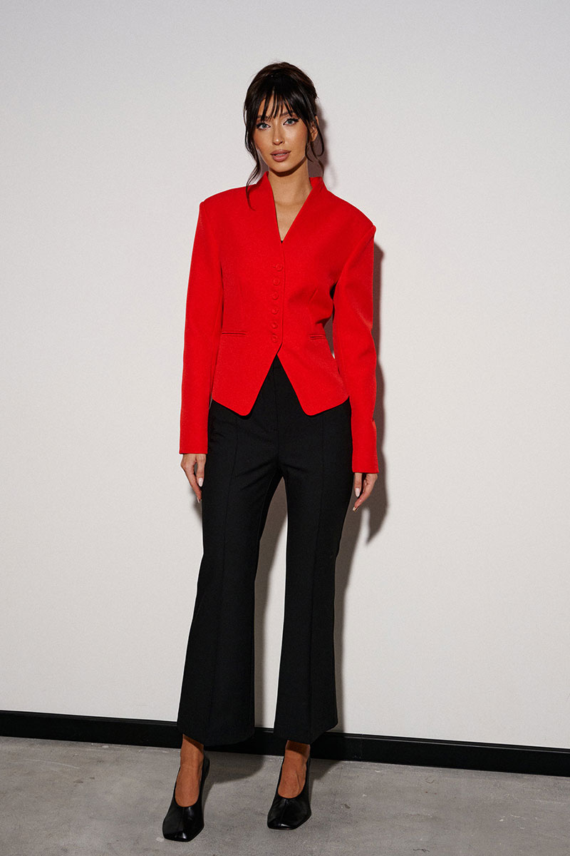 Жакет прилегающего силуэта. Выполнен из костюмной ткани красного цвета. С подкладкой. Воротник-стойка. Вырез горловины V-образный. Рукав втачной. По переду прорезные карманы. Застёжка центральная - пуговицы. Низ жакета фигурный.