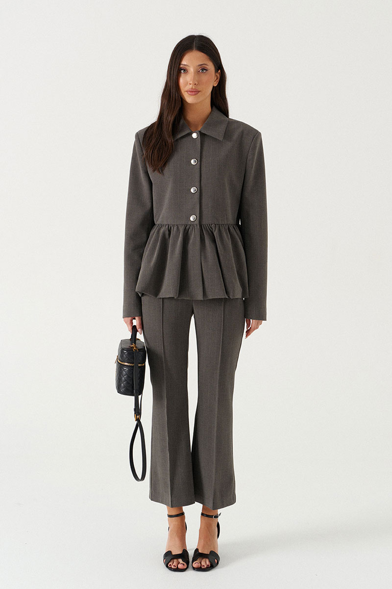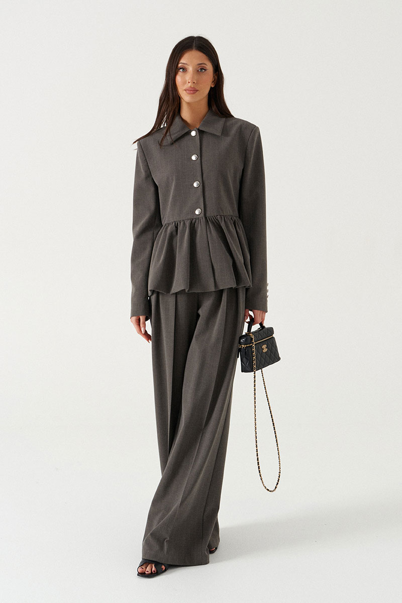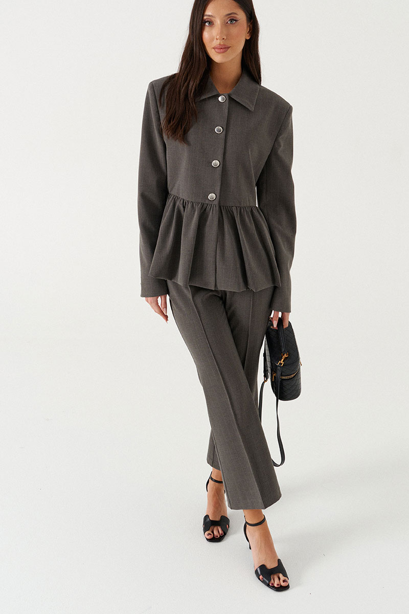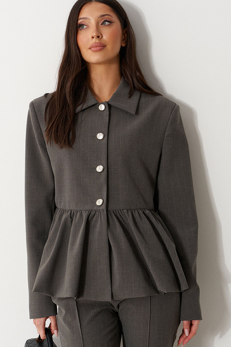 Жакет прямого кроя серого цвета с полоской, с баской по нижней части изделия. Выполнен из костюмной ткани. Характеристики: на подкладке, отложной воротник, застежка центральная на пуговички, рукав втачной.