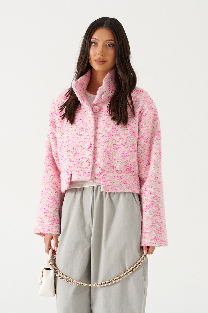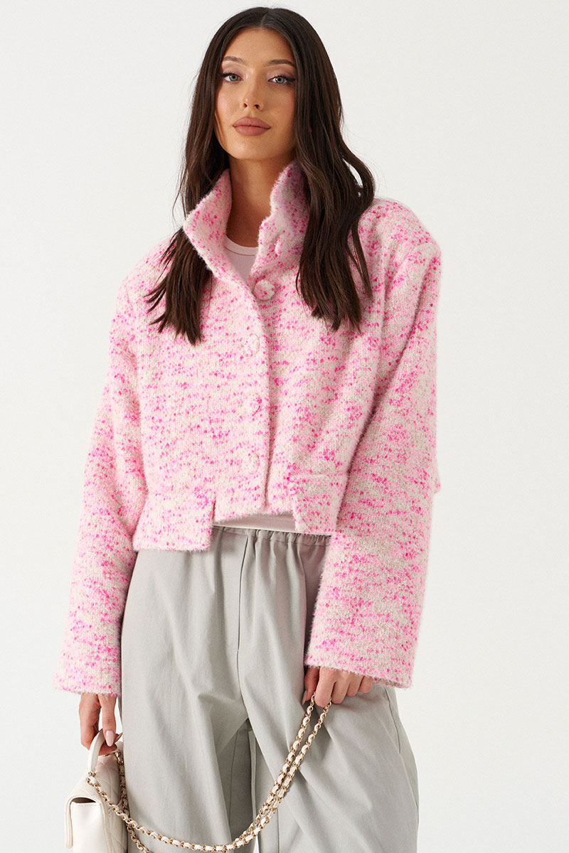 Жакет укороченный прямого кроя, выполнен из трикотажного полотна бежево-розового цвета. Характеристики: на подкладке, горловина-стойка, втачной рукав, линия плеча немного спущена. По деталям полочки настрочные клапаны, выходящие за линию низа.Застежка центральная, застегивающаяся на пробивные петли и пришивные пуговицы.