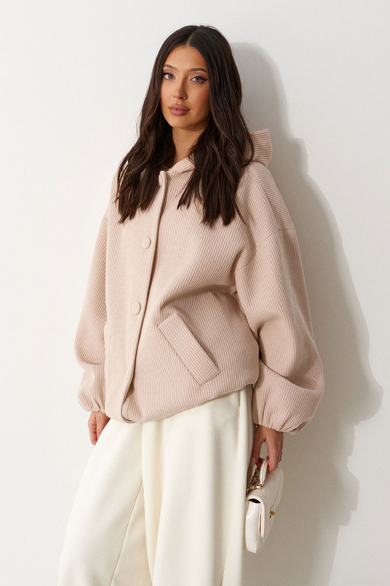 Жакет (бомбер), прямого силуэта , на подкладке. Выполнен из фактурной пальтовой ткани бежевого цвета. Характеристика: горловина круглая с притачным капюшеном. Линия плеча спущенная. Рукав длинный, одношовный, втачной. По низу присборен на резинку. По деталям полочки прорезные карманы с накладными листочками. Спинка цельная. Застежка центральная бортовая, застегивающаяся на прорезные петли и пришивные пуговицы.