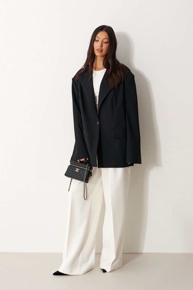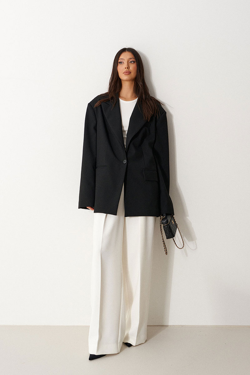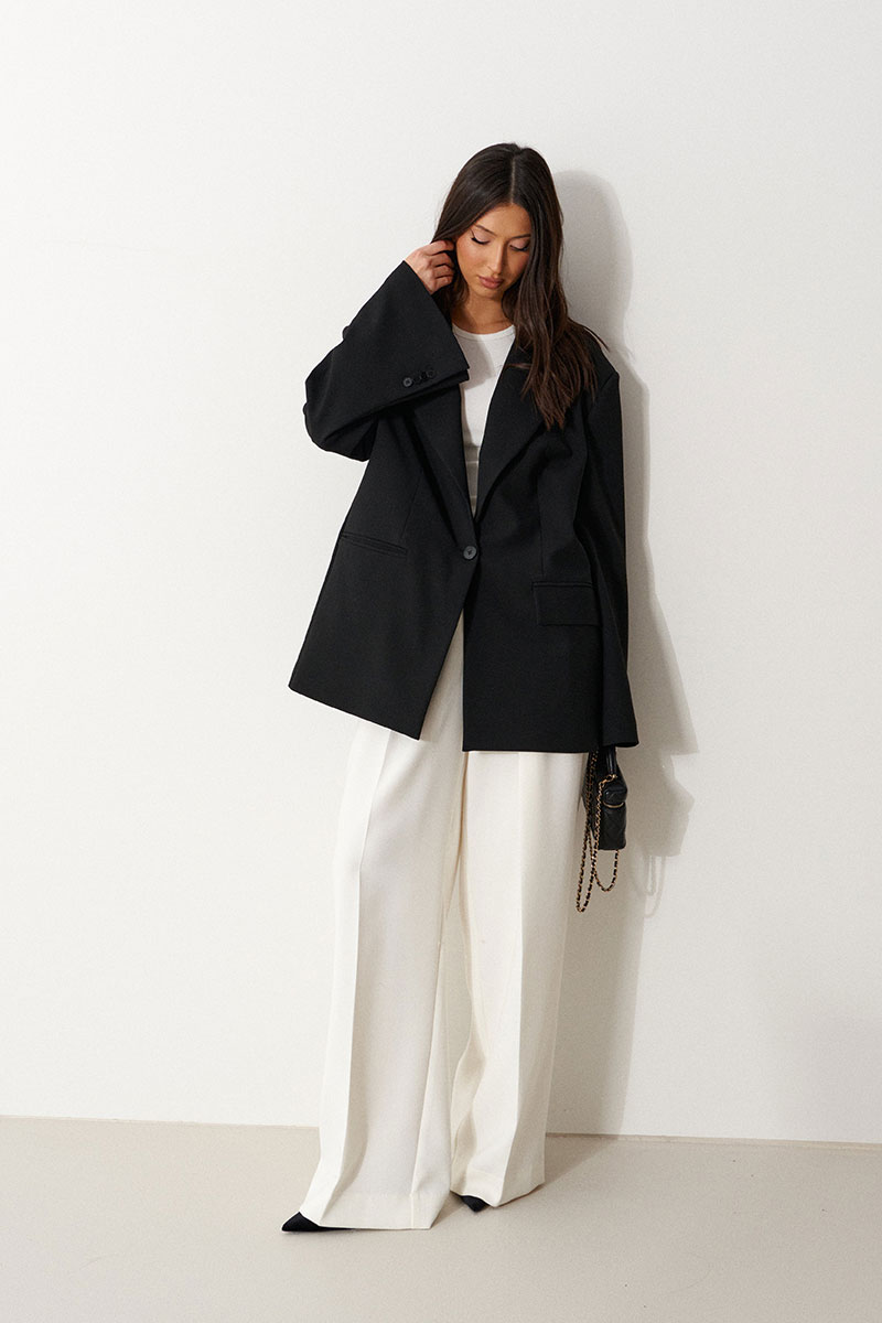 Жакет прямого свободного кроя выполнен из костюмной ткани черного цвета. Характеристики: прямой свободный крой, брендированная подкладка, подплечники, воротник с остроугольным лацканом, застежка центральная на петлю - пуговицу, по переду функциональные карманы с клапаном, рукав к низу расклешен, втачной, чуть спущен, по низу рукава нашиты пуговички, спинка цельнокроеная.