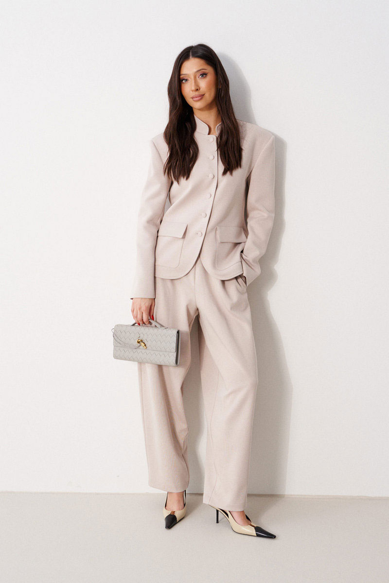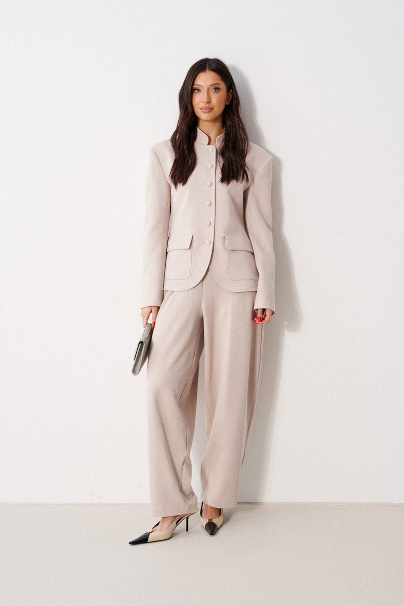 Жакет прямого кроя, выполнен из трикотажного полотна. Характеристики: прямой крой, на подкладке, вырез горловины круглый с притачным воротником-стойкой, накладные карманы с клапанами, спинка цельная, рукав втачной, застежка центральная бортовая, застегивающаяся на пробивные петли и пришивные пуговицы.