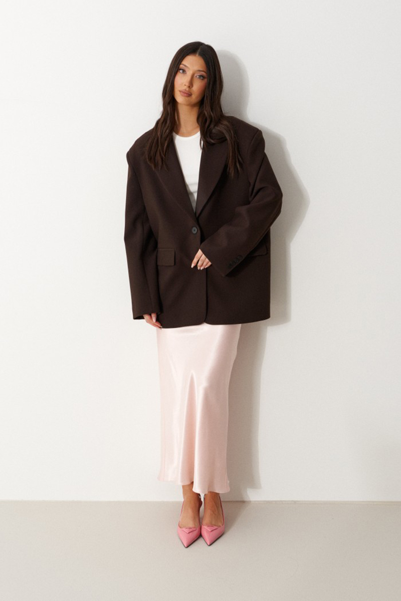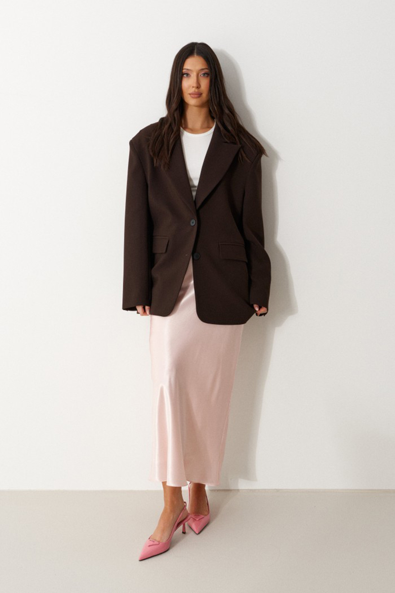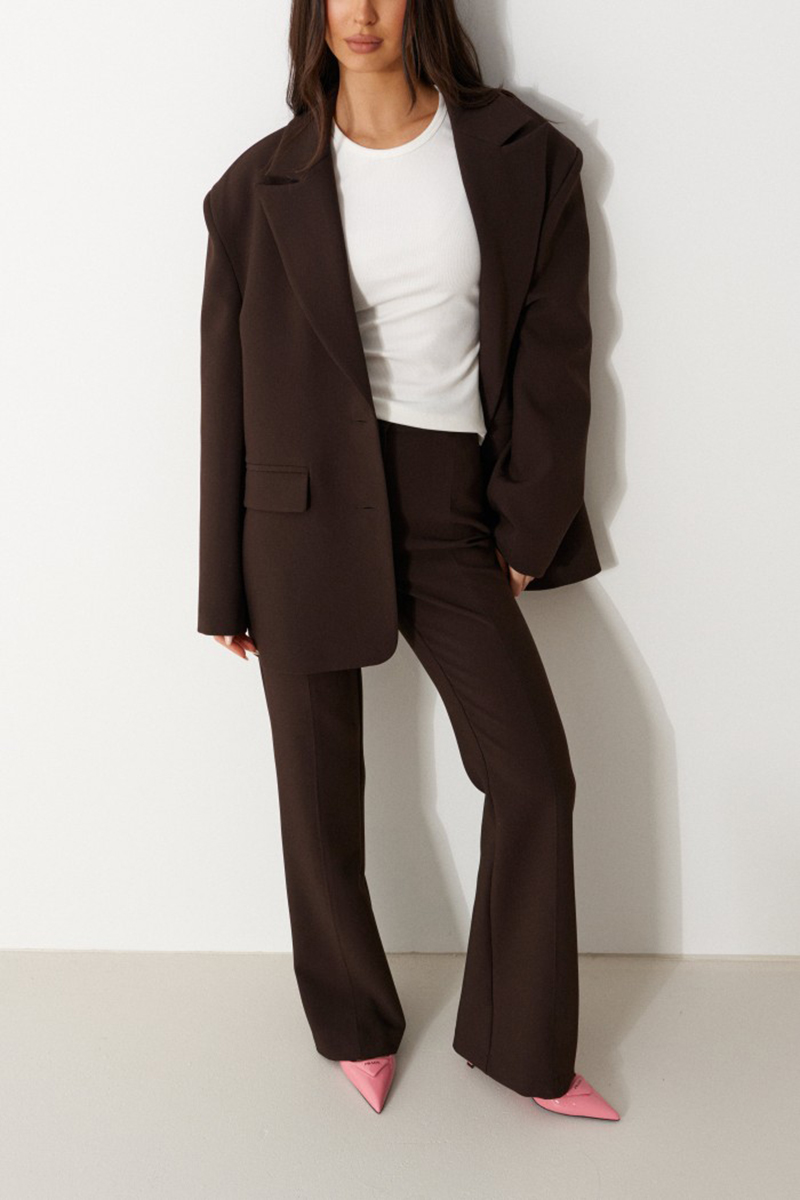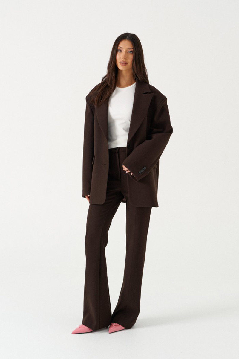 Жакет прямого силуэта, на подкладке. Выполнен из костюмной ткани. Характеристика: воротник пиджачного типа, с лацканами. На переде, по линии таллии, обработаны карманы в рамку с клапаном. Спинка со средним швом заканчивающийся шлицей. Рукав втачной двух шовный. Локтевой шов заканчивающийся шлицей застегивающая на петли и пуговицы. Застежка центральная бортовая, застегивающаяся на две петли, пуговицы.