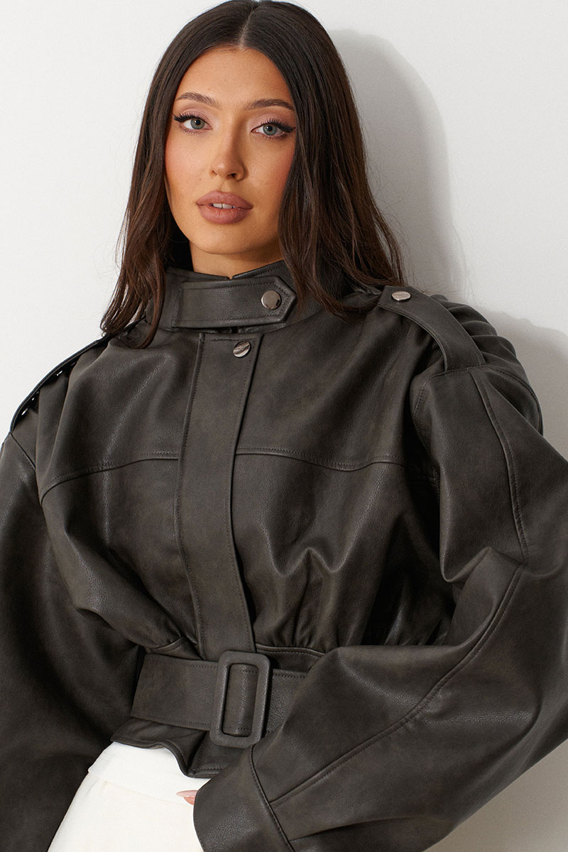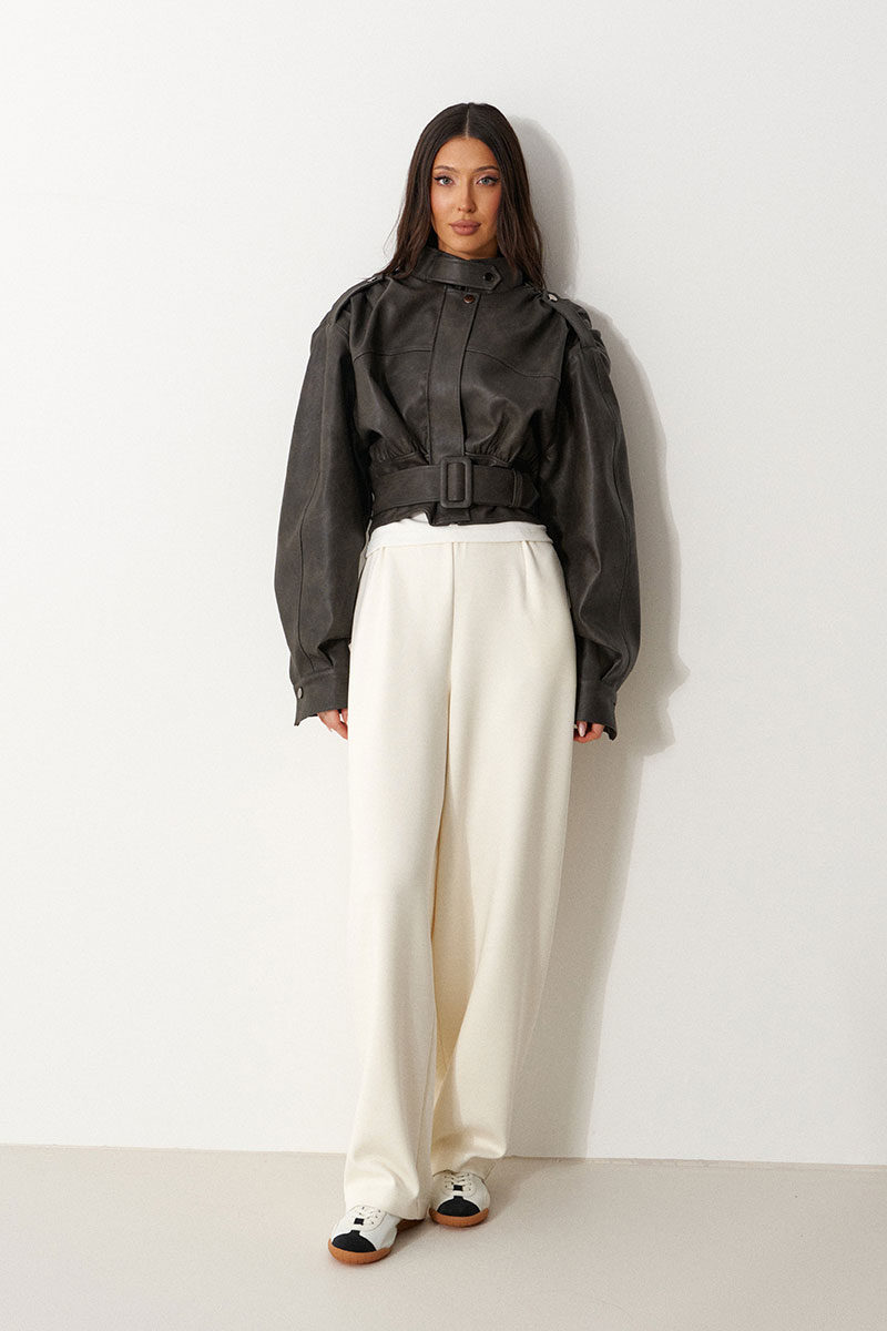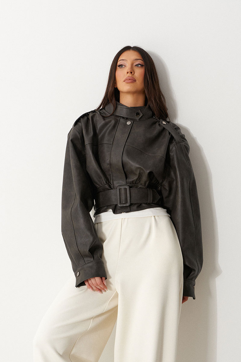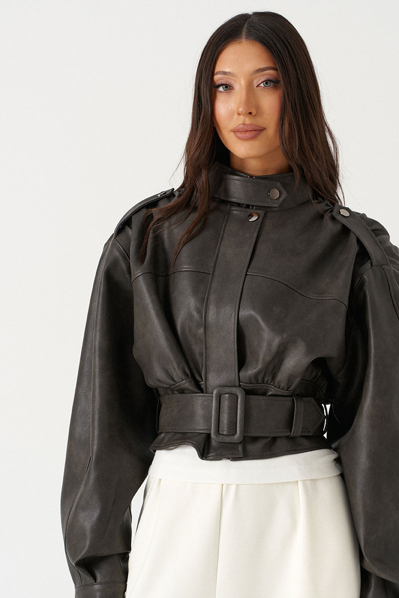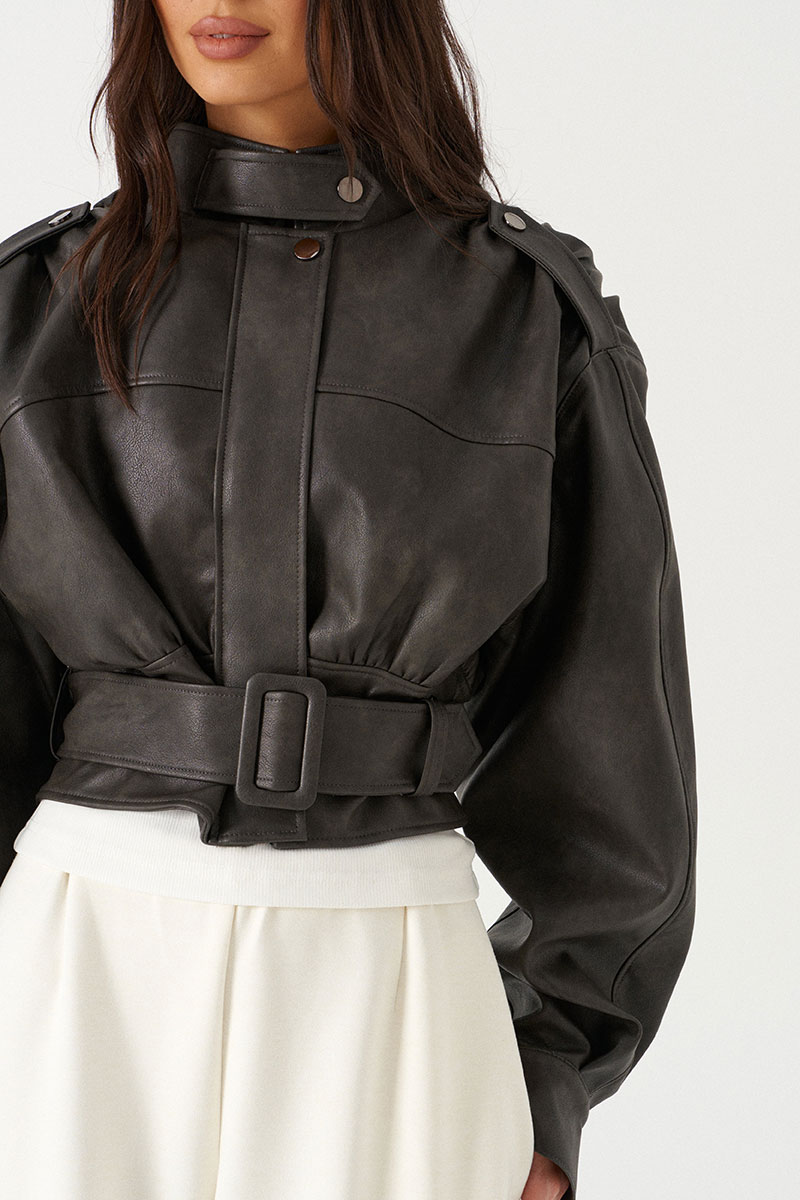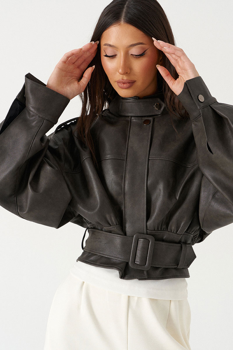 Куртка с акцентыми деталями, выполнен из экокожи графитового цвета. Характеристика: укороченный крой, воротник-стойка с застежкой-ремешком на кнопке, центральная застежка-замок, скрытая под планкой на кнопку сверху, плечевые швы сшиты сборкой и гармонично сочетаются с патами на кнопке, плечики, брендированный подклад, планка по низу изделия спереди, спинка отрезная, по спинке талия на резинке с кокеткой по низу, пояс в комплекте, рукав втачной слегка спущен, широкий манжет на одну кнопку.