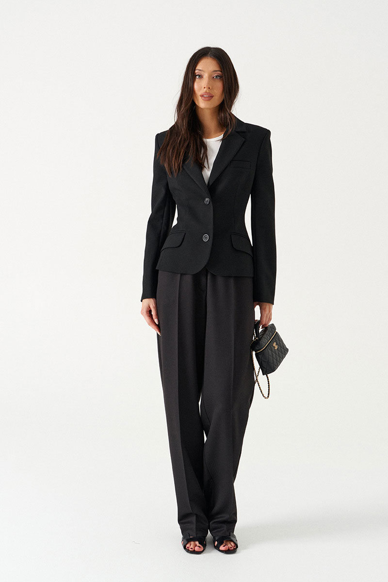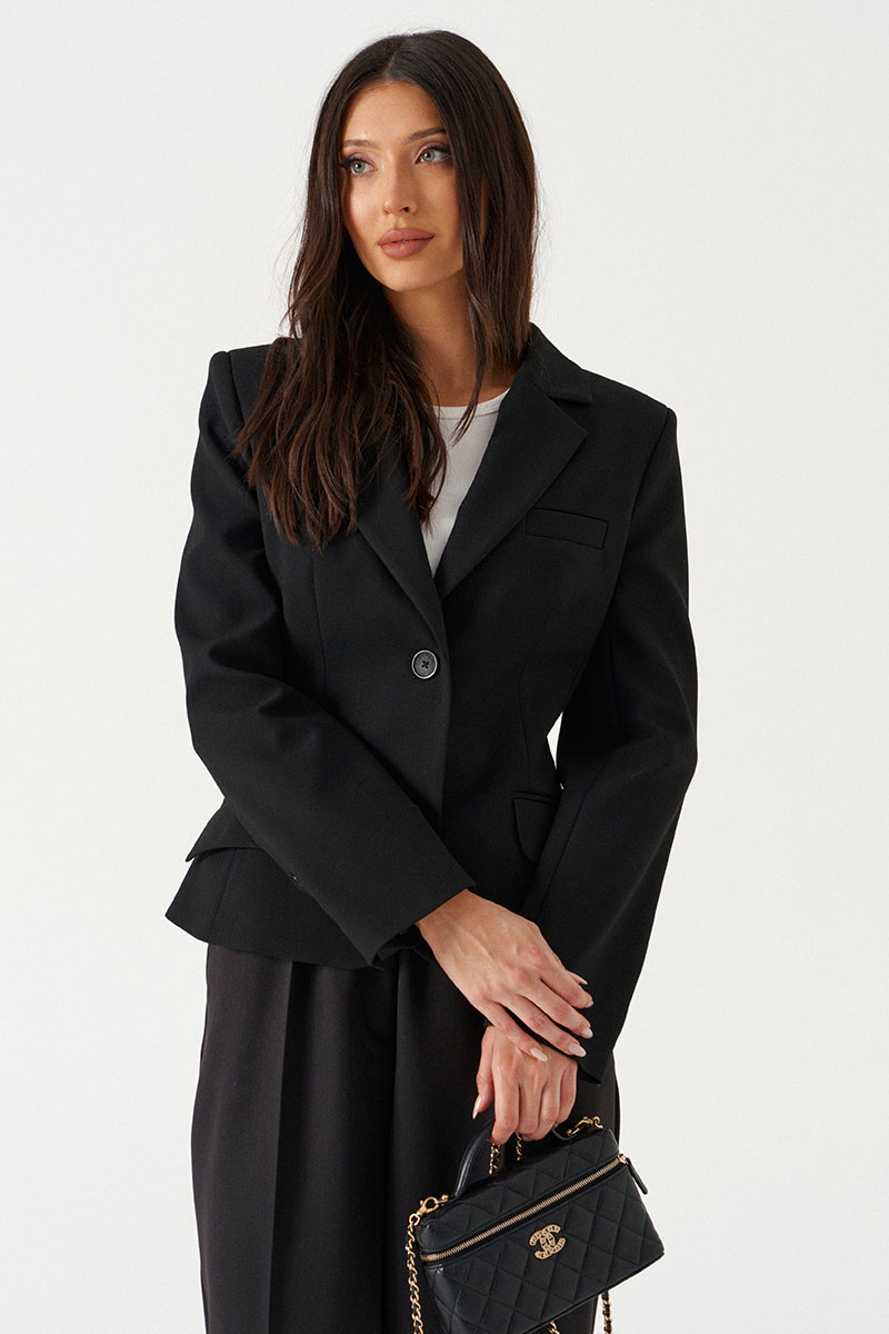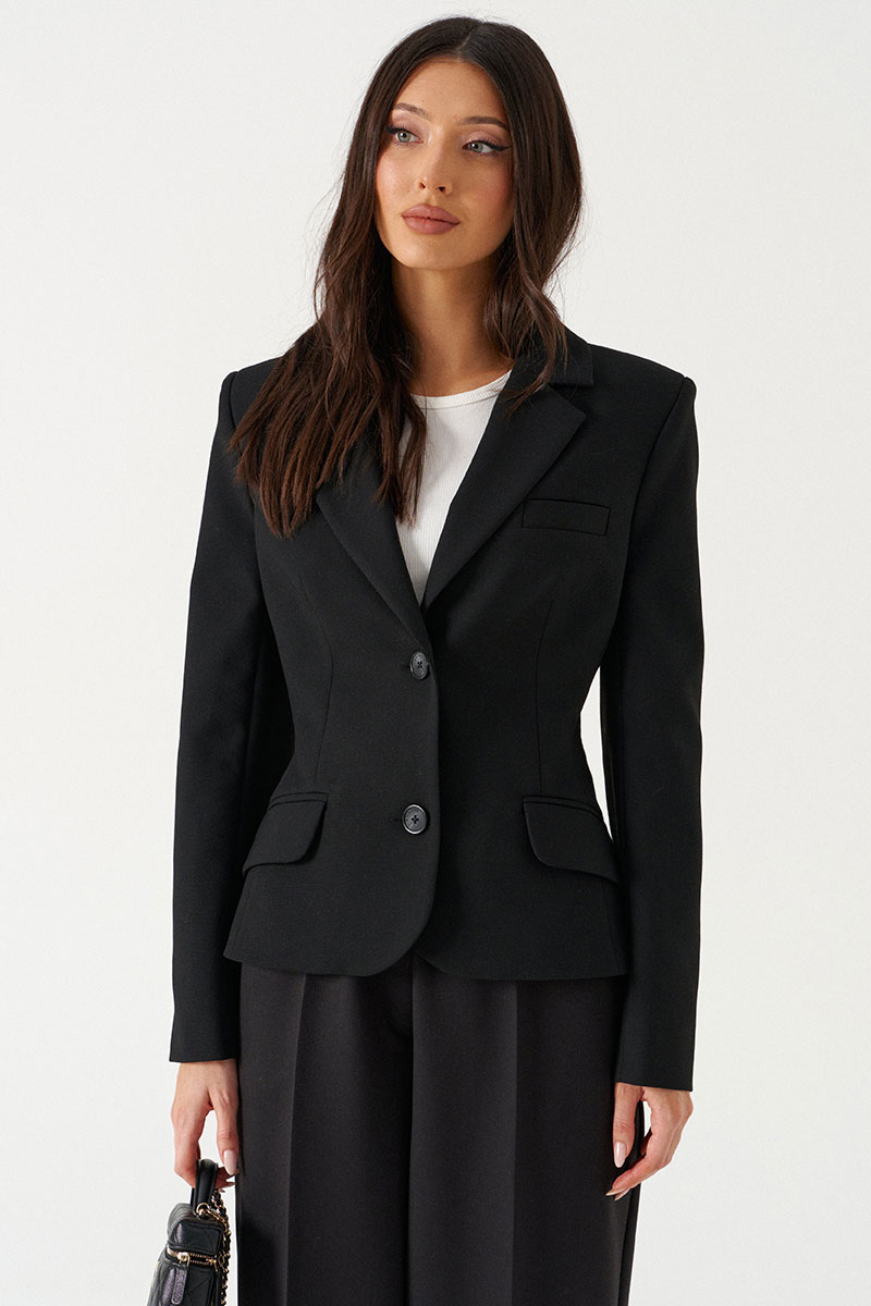 Жакет приталенного кроя выполнен из текстильного полотна черного цвета. Характеристики: приталеный крой, однобортный, брендированная подкладка, застежка центральная на петли и пуговицы, по переду накладные функциональные карманы, рукав втачной, три пуговицы на манжете.
