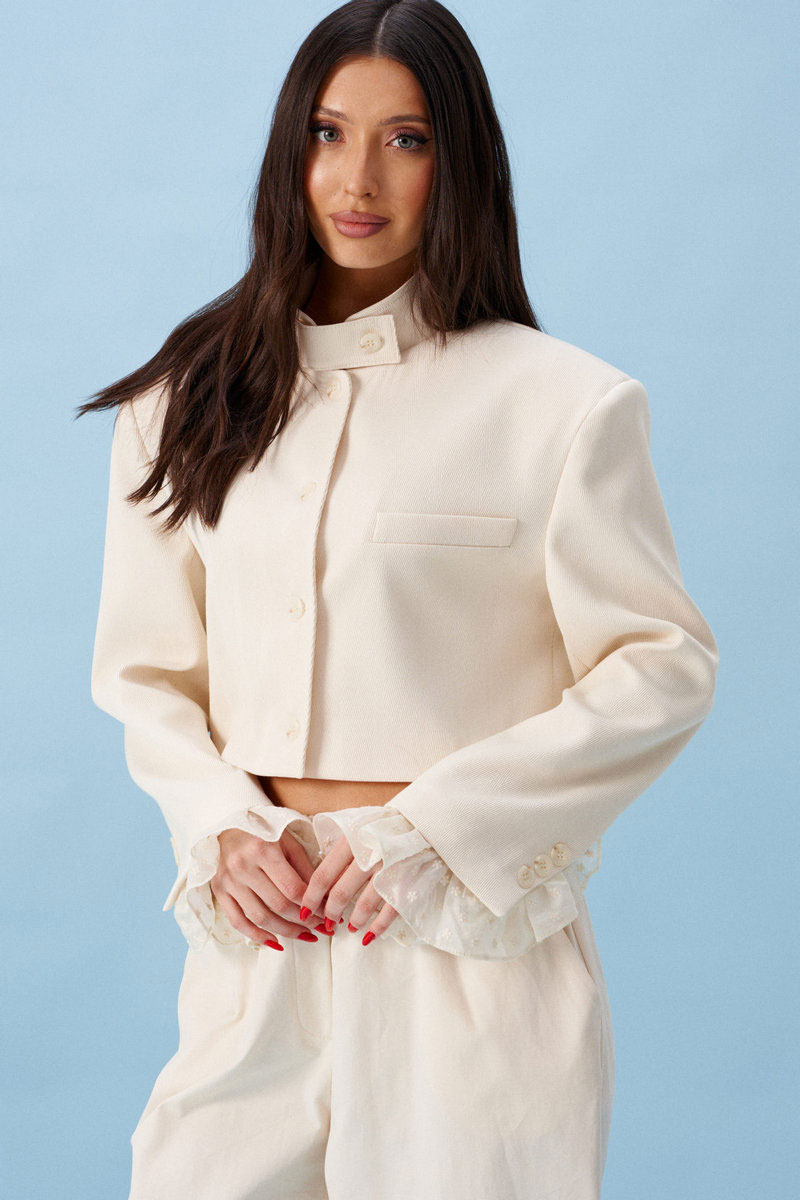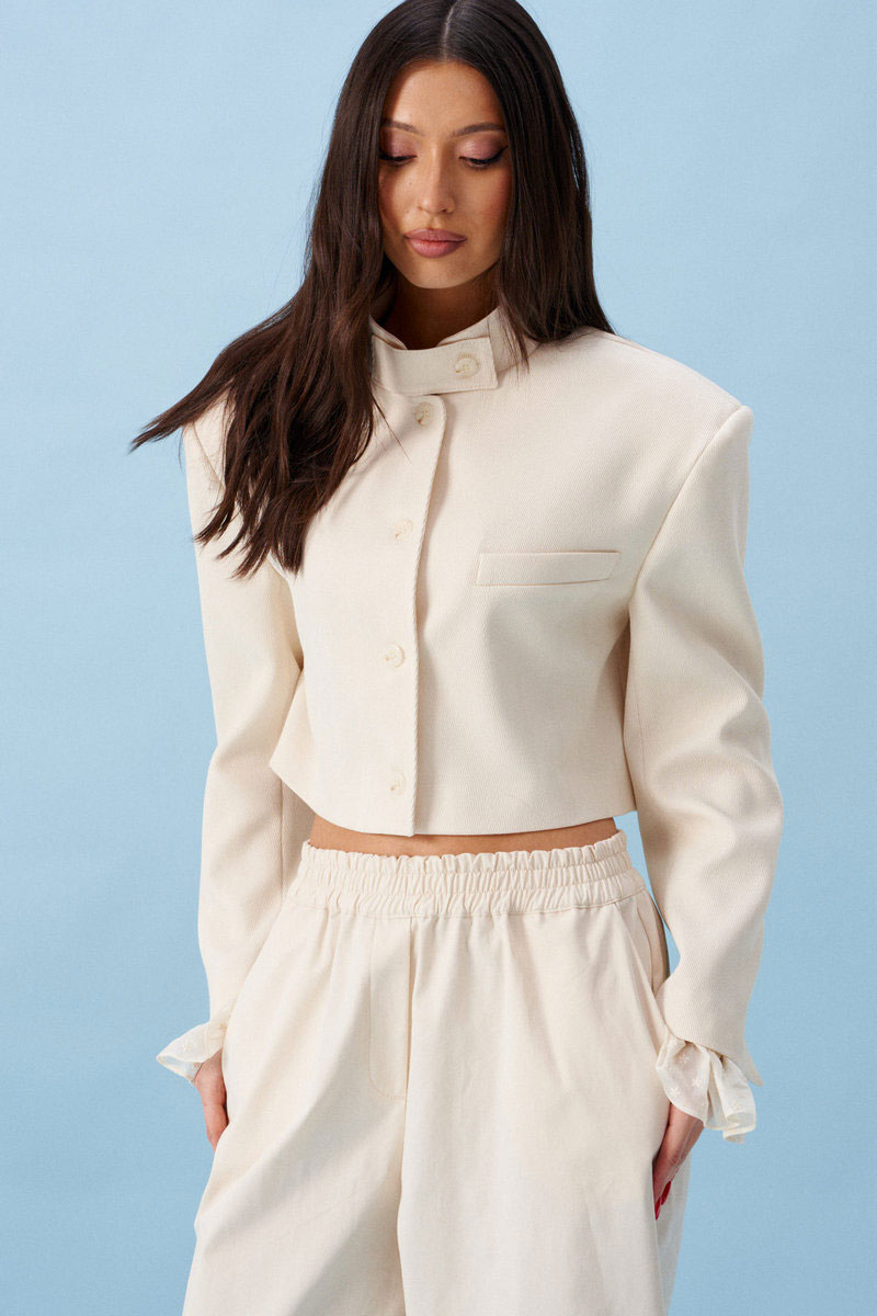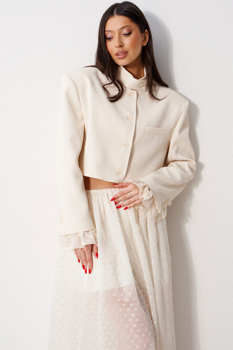 Жакет женский, прямого силуэта, укороченный, на подкладке. Выполнен из текстильной, фактурной ткани серого цвета, рисунок елочка. Характеристика: горловина стойка с хлястиком, застегивается на петлю с пуговицей. Застежка центральная бортовая, застегивающаяся на петли, пуговицы. Подплечники. Брендированная подкладка. Рукав втачной двухшовный, по низу рукава вставлена рюша из тонкой хлопковой ткани. Рюша притачная. По низу рукава нашиты пуговицы. Спинка с двумя рельефными швами.
