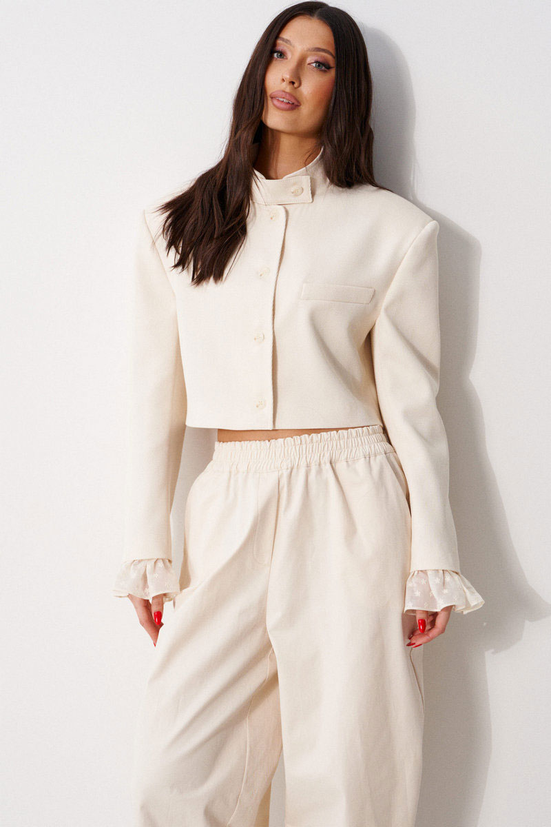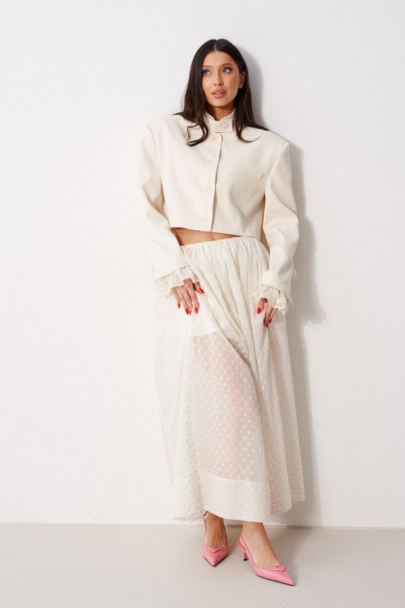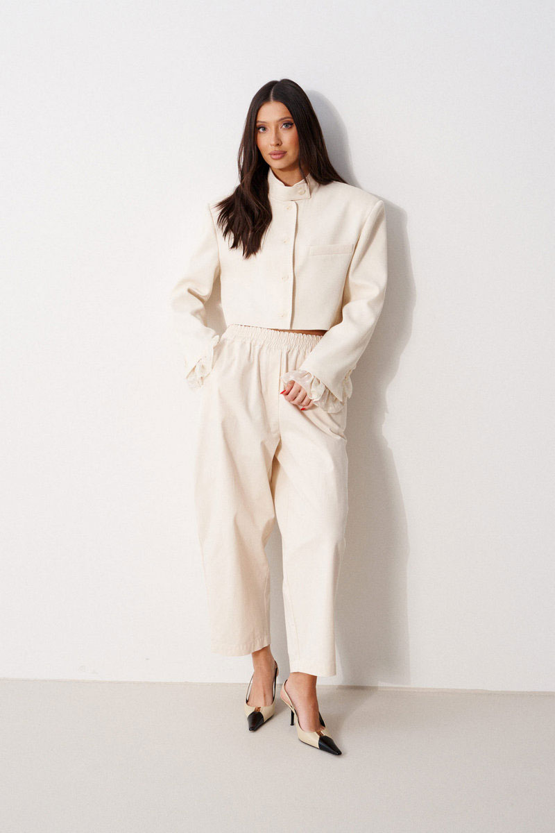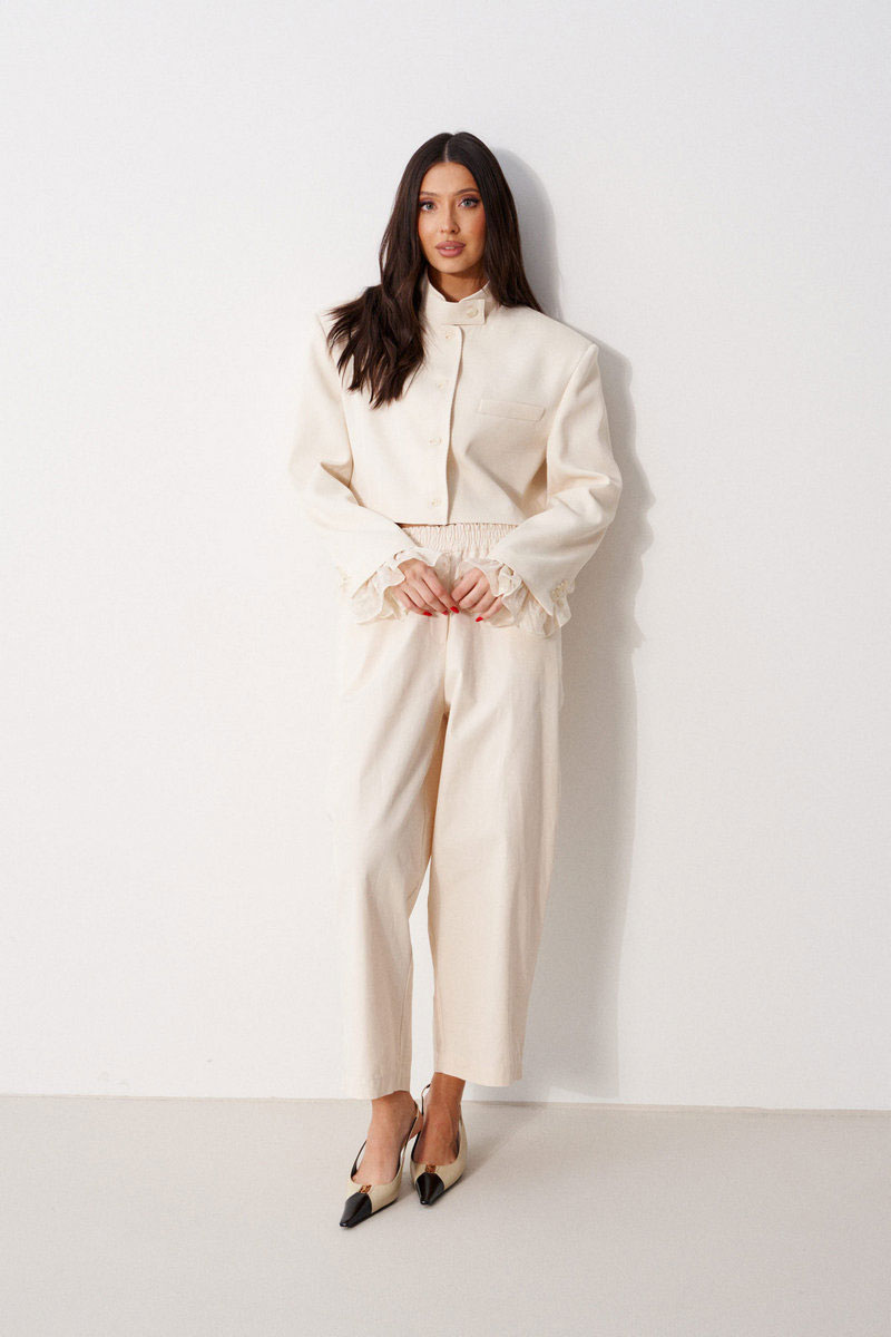Жакет женский, прямого силуэта, укороченный, на подкладке. Выполнен из текстильной, фактурной ткани серого цвета, рисунок елочка. Характеристика: горловина стойка с хлястиком, застегивается на петлю с пуговицей. Застежка центральная бортовая, застегивающаяся на петли, пуговицы. Подплечники. Брендированная подкладка. Рукав втачной двухшовный, по низу рукава вставлена рюша из тонкой хлопковой ткани. Рюша притачная. По низу рукава нашиты пуговицы. Спинка с двумя рельефными швами.
