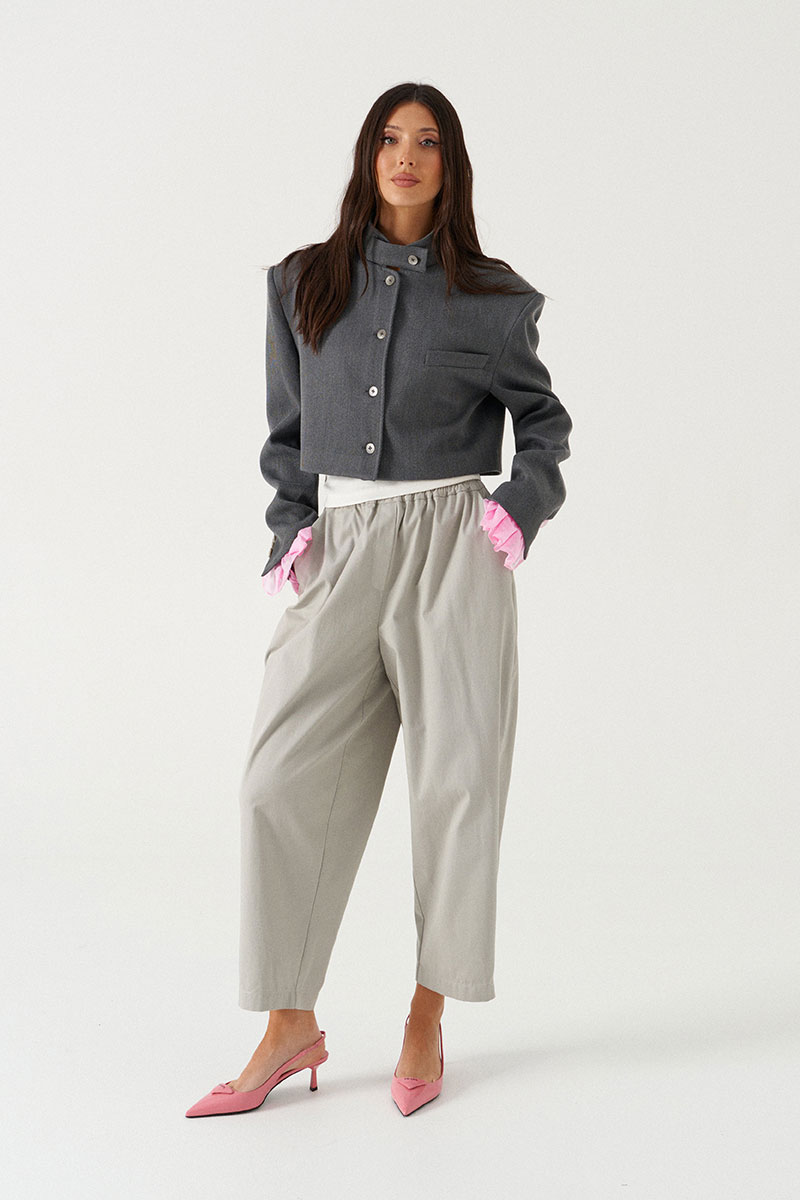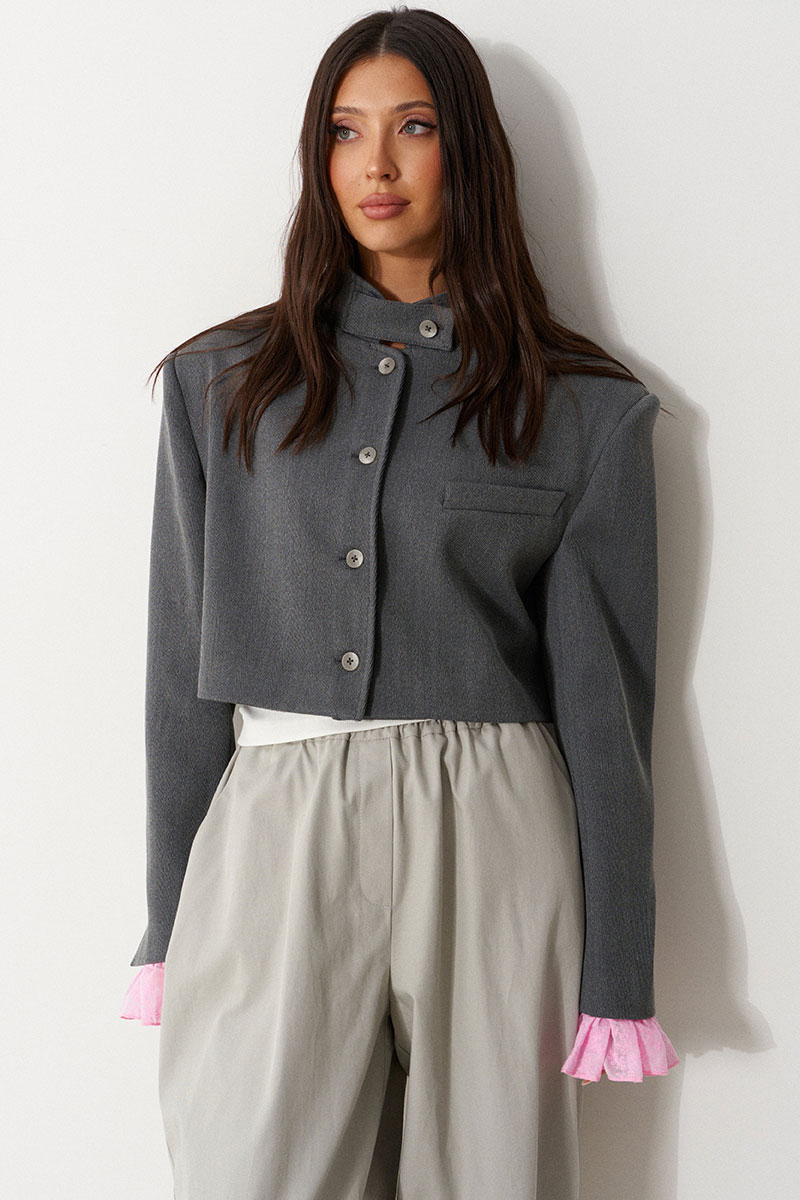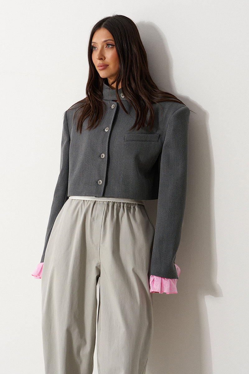 Жакет женский, прямого силуэта, укороченный, на подкладке. Выполнен из текстильной, фактурной ткани серого цвета, рисунок елочка. Характеристика: горловина стойка с хлястиком, застегивается на петлю с пуговицей. Застежка центральная бортовая, застегивающаяся на петли, пуговицы. Подплечники. Брендированная подкладка. Рукав втачной двухшовный, по низу рукава вставлена рюша из тонкой хлопковой ткани. Рюша притачная. По низу рукава нашиты пуговицы. Спинка с двумя рельефными швами.