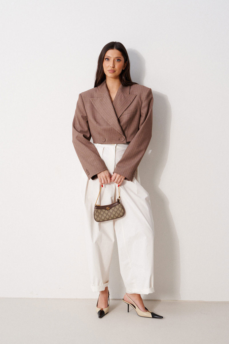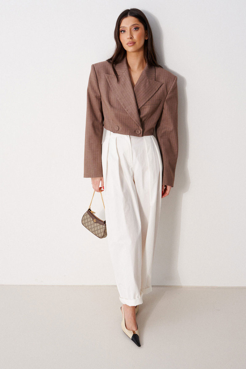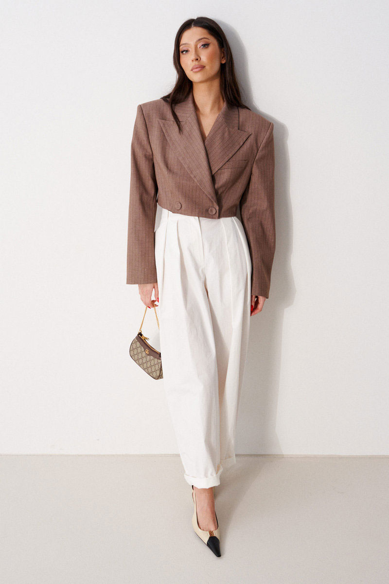 Жакет укороченный прямого кроя, выполнен из костюмной ткани коричневого цвета в черную полоску. Характеристики: прямой крой, подкладка, воротник с остроугольным лацканом, подплечики, застежка на петли-пуговицы, втачной рукав, три пуговицы на манжете.