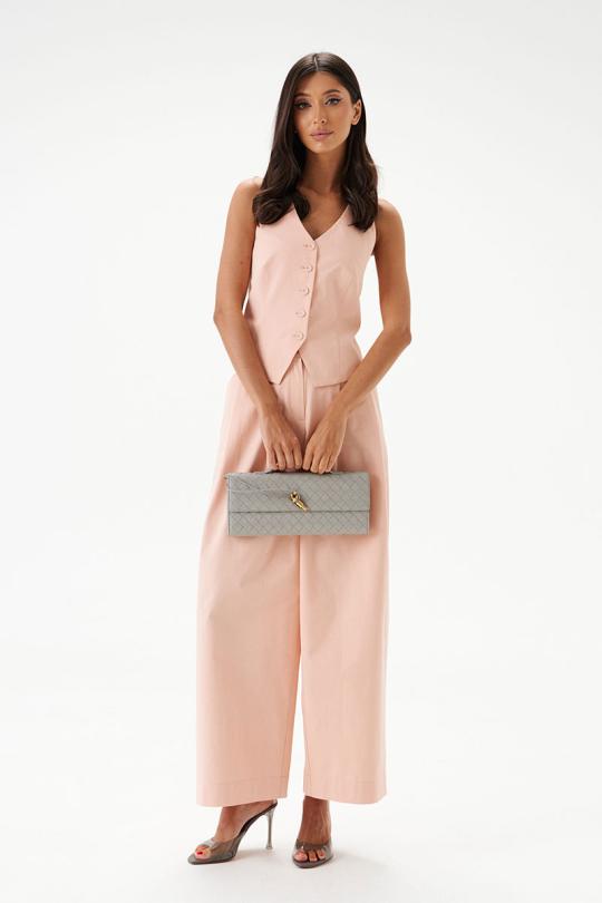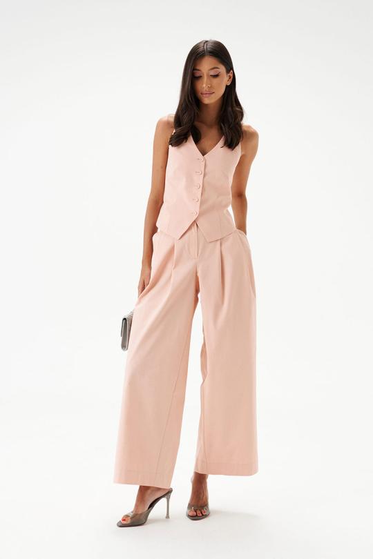 Жилет полуприлегающего силуэта. Выполнен из хлопкового полотна нежно-розового цвета. С подкладкой. Вырез горловины V-образный, переходящий в завязки на спине. Спинка открытая. Низ жилета фигурный. Застёжка центральная – пуговицы. Жилет дополнят брюки А1543/1.