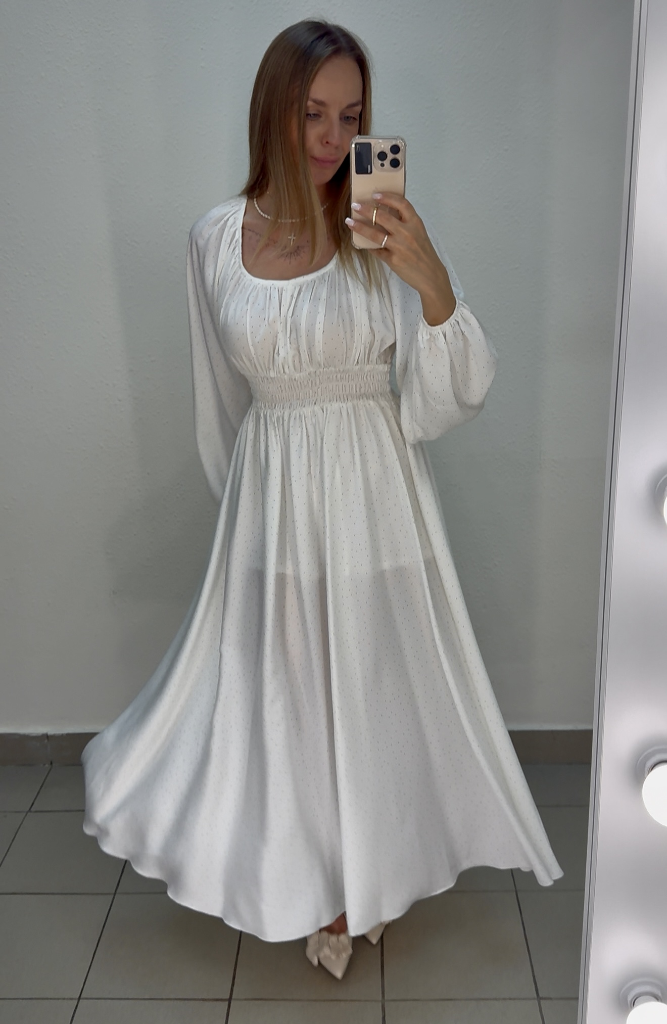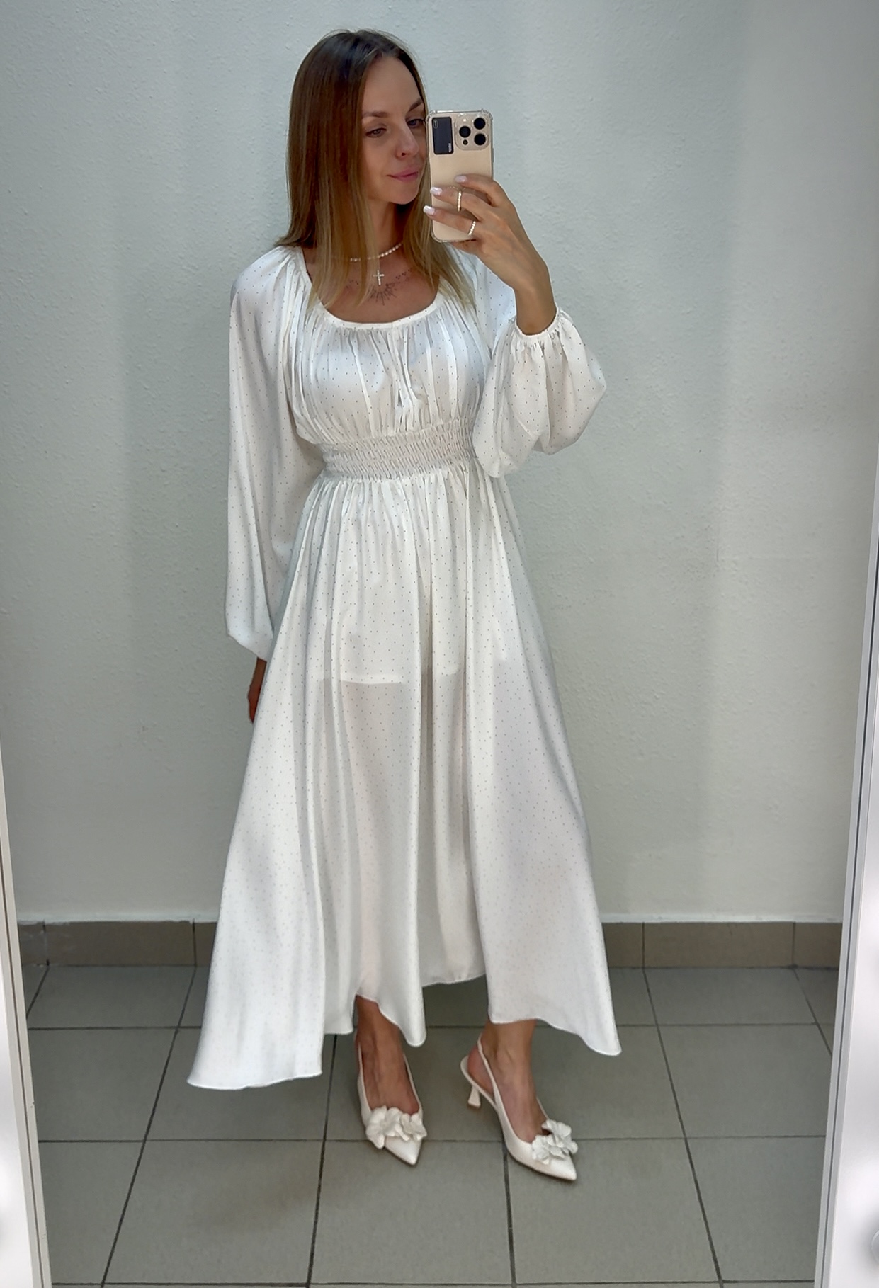 Платье полуприлегающего силуэта выполнено из белой струящейся ткани с принтом мелкая россыпь. Характеристики: полуприлегающий силуэт, отрезное, отрез фигурный, по линии отреза широкая венгерка, горловина V-образный плавный вырез, рукав реглан свободного кроя, по низу рукава резинка.