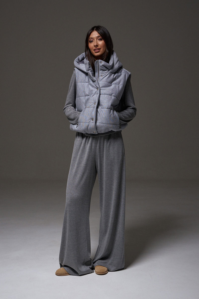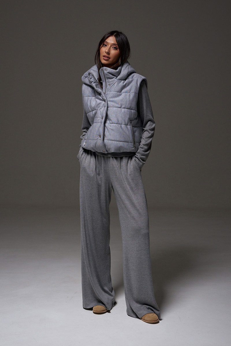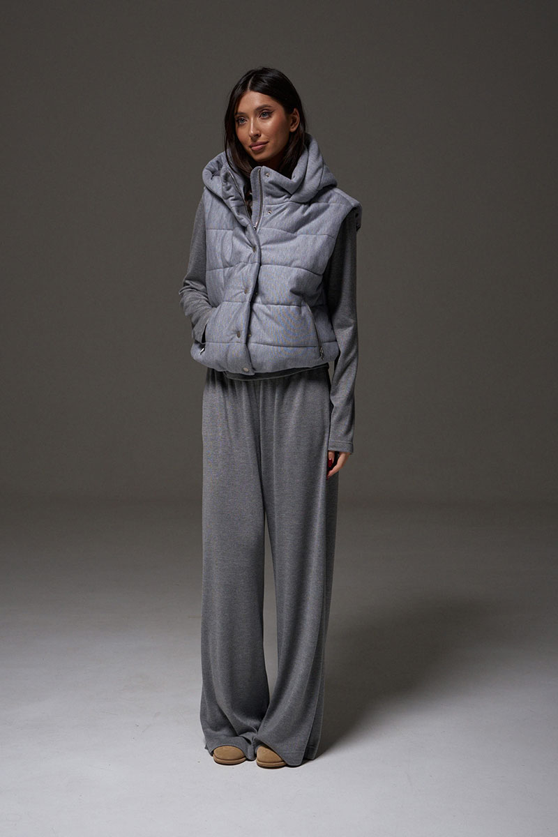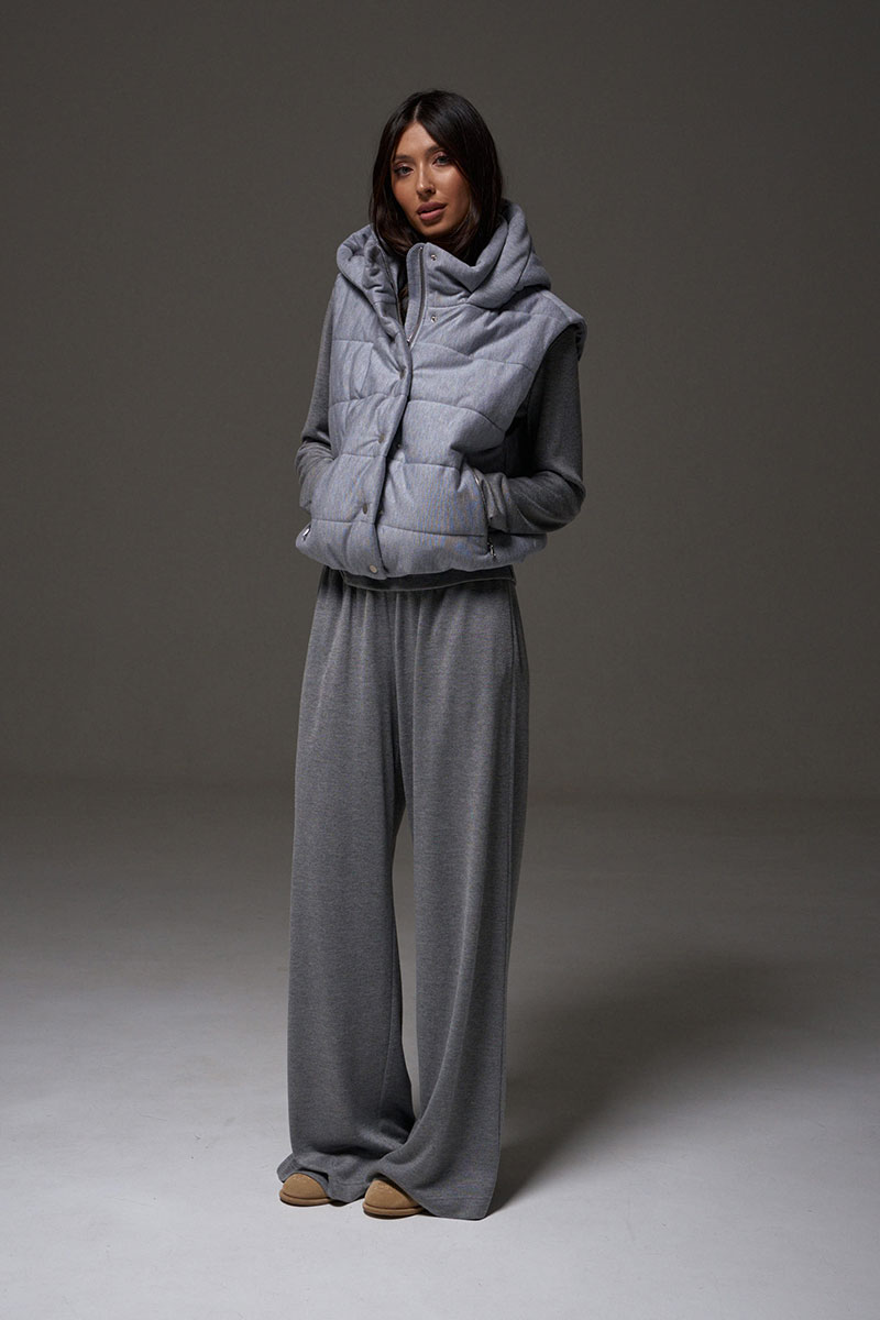 Жилет укороченный, выполнен из стеганной трикотажной ткани серого цвета. Характеристика: Жилет укороченный, выполнен из стеганной трикотажной ткани графитового цвета. Характеристика: жилет А-силуэта, вортник стойка, капюшон цельный с жилетом, центральная застежка на молнию, скрывается под планкой на кнопках, боковые карманы на молнии, по низу изделия резинка с фиксаторами, брендированный подклад, спинка цельнокройная.
