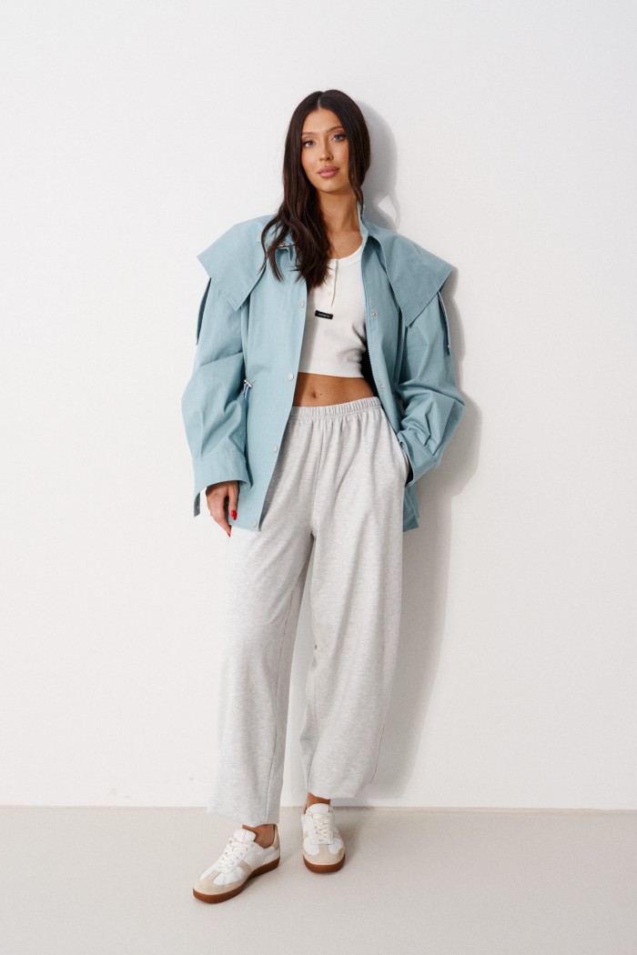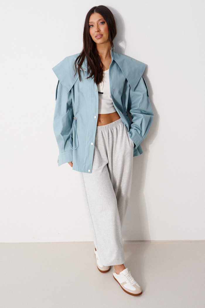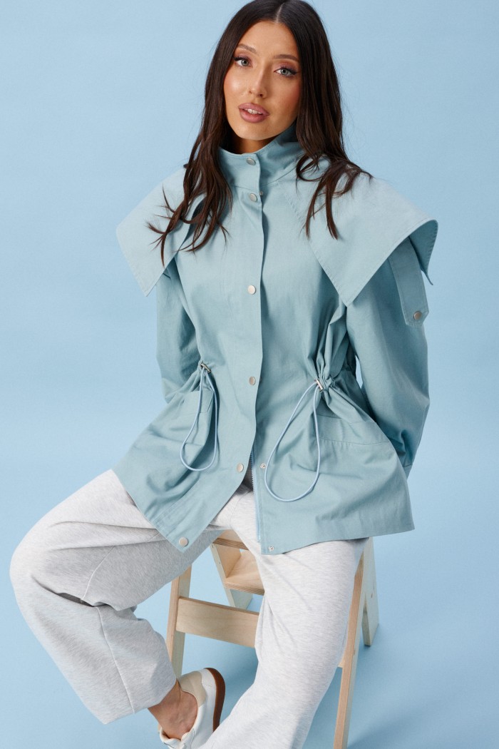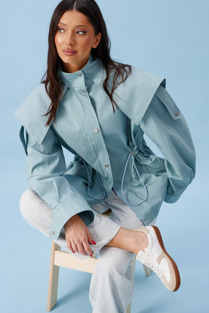 Куртка прилегающего силуэта, выполнена из хлопкового полотна бирюзового цвета.