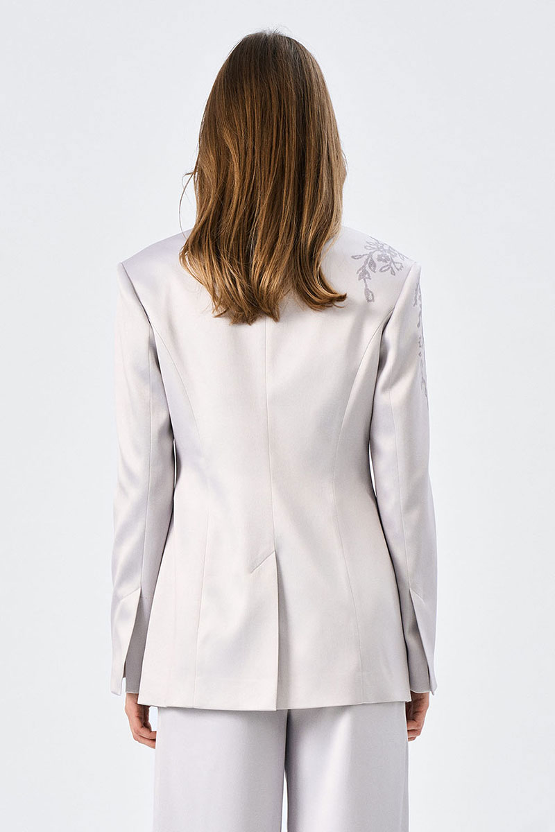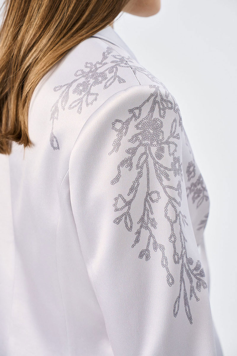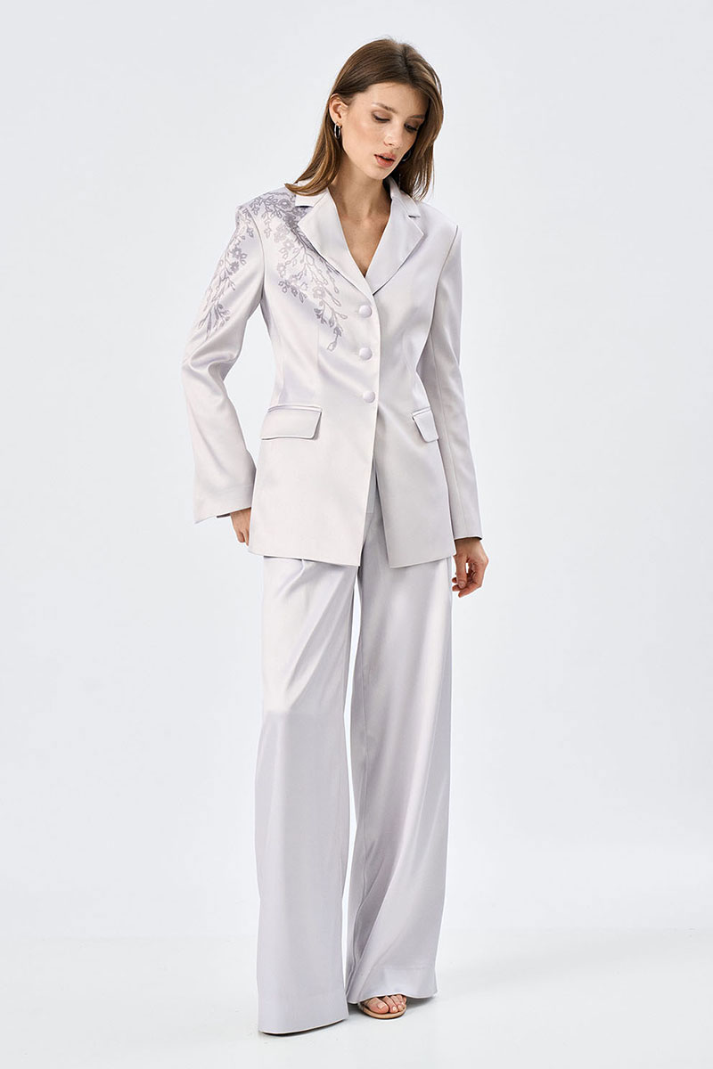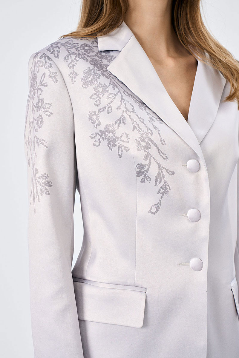 Жакет прямого силуэта, из плотного атласа, с вытачками на переде и прорезными карманами. Спинка со средним швом и шлицей. Рукав двухшовный, втачной и длинный. Воротник пиджачного типа. Изделие на подкладке. Возможно отличие фотографии по оттенку, связанное с разной цветопередачей монитора.