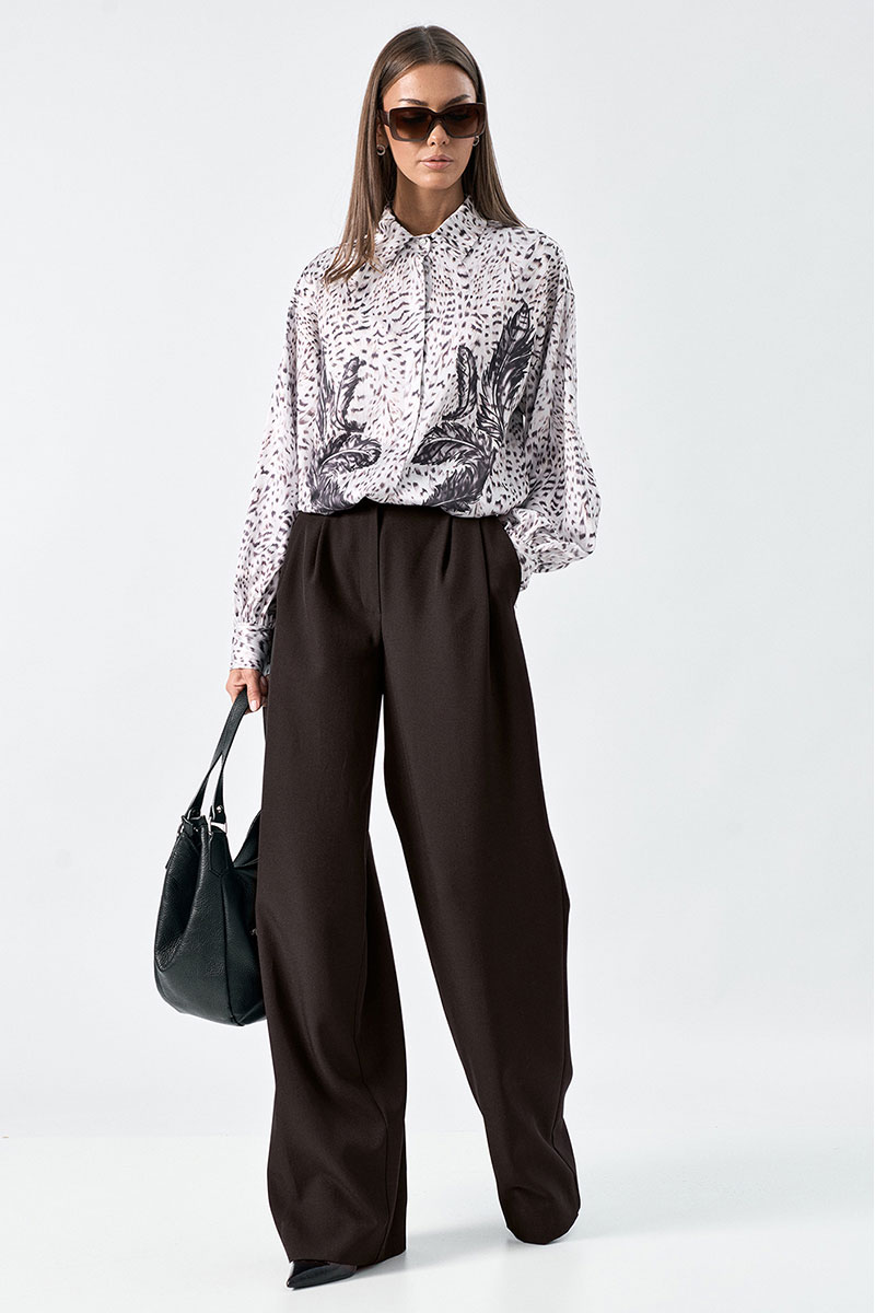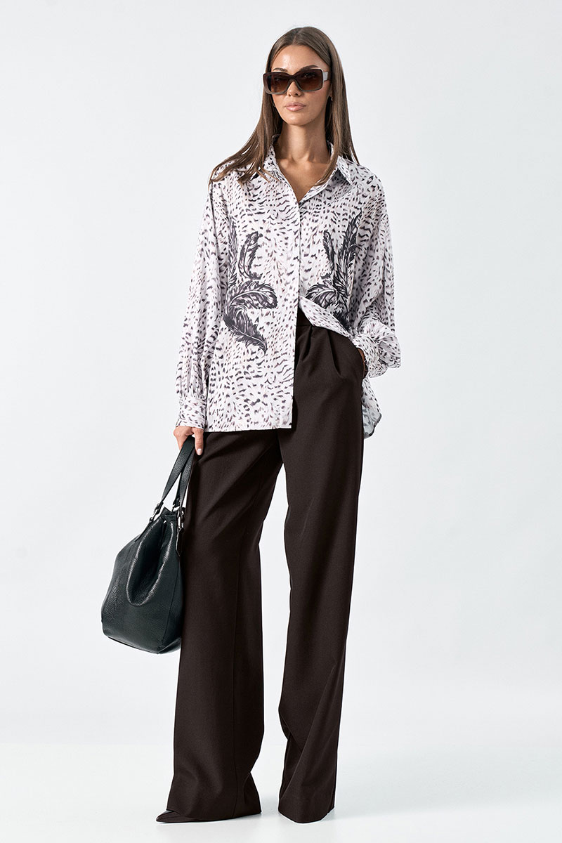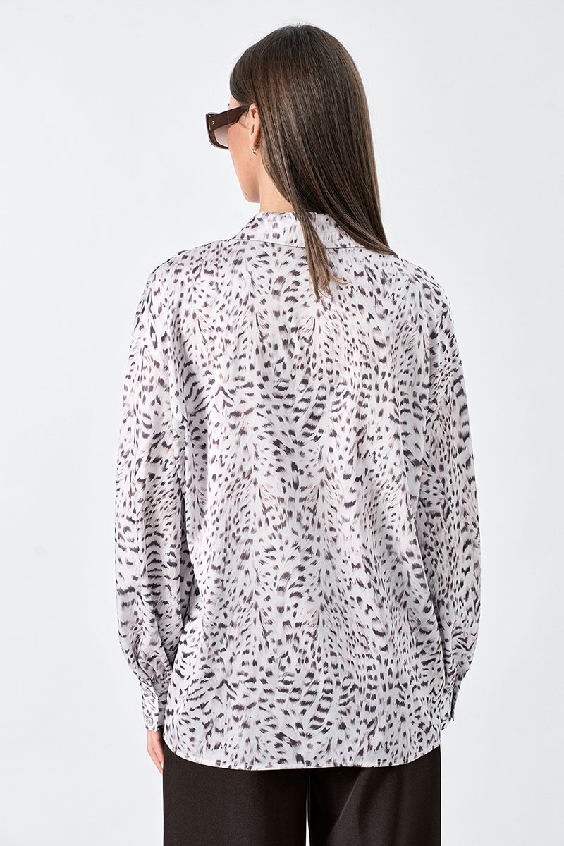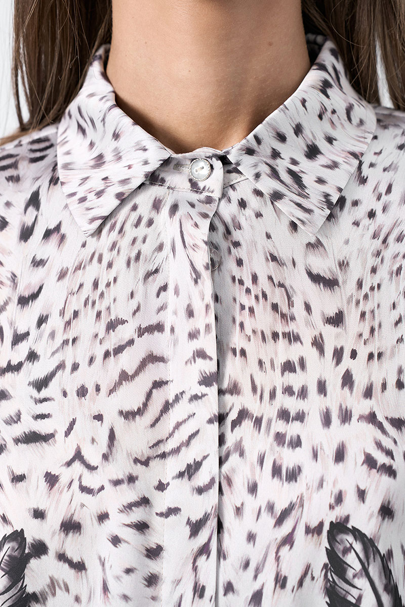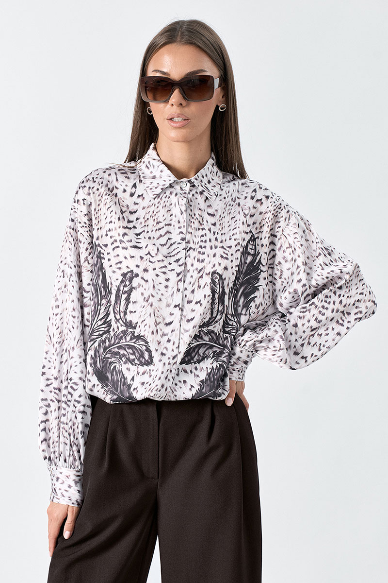 Блузка свободного силуэта выполнена из шелковой ткани с дизайнерским принтом. Рукав длинный, втачной с манжетой. Воротник -отложной. Возможно отличие фотографии по оттенку, связанное с разной цветопередачей монитора.