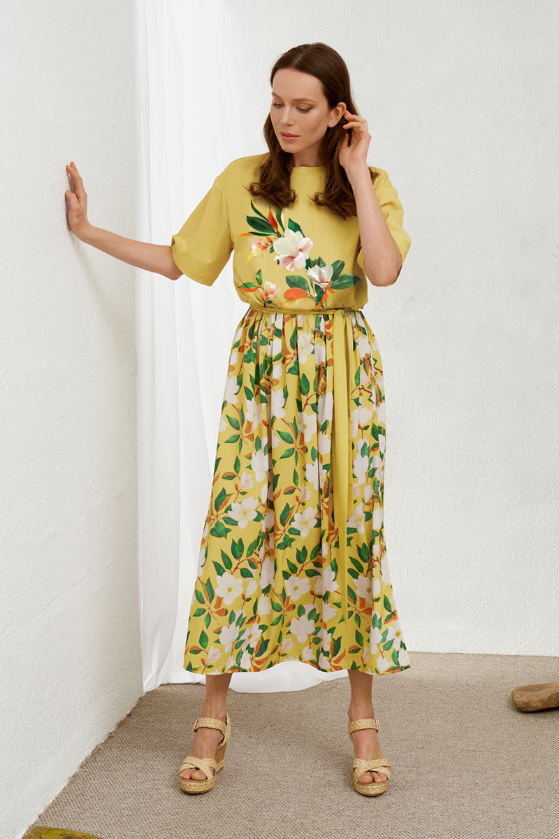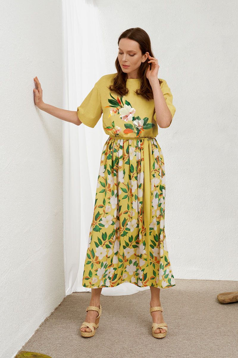Оригинальное платье ArtRibbon сочетает в себе две фактуры тканей: лиф из легкого трикотажа, а юбка из невесомой шелковистой ткани. Платье свободного силуэта. Рукав спущенный,