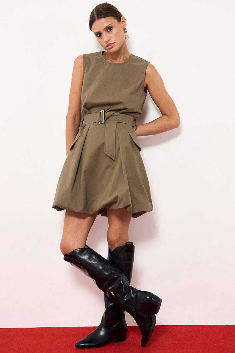 Платье-баллон из хлопковой ткани в длине мини. Платье приталенное по талии по линии талии пояс из основной ткани изделия. По бокам юбки накладные клапаны. Платье на подкладке. По спинке застежка на потайную молнию.