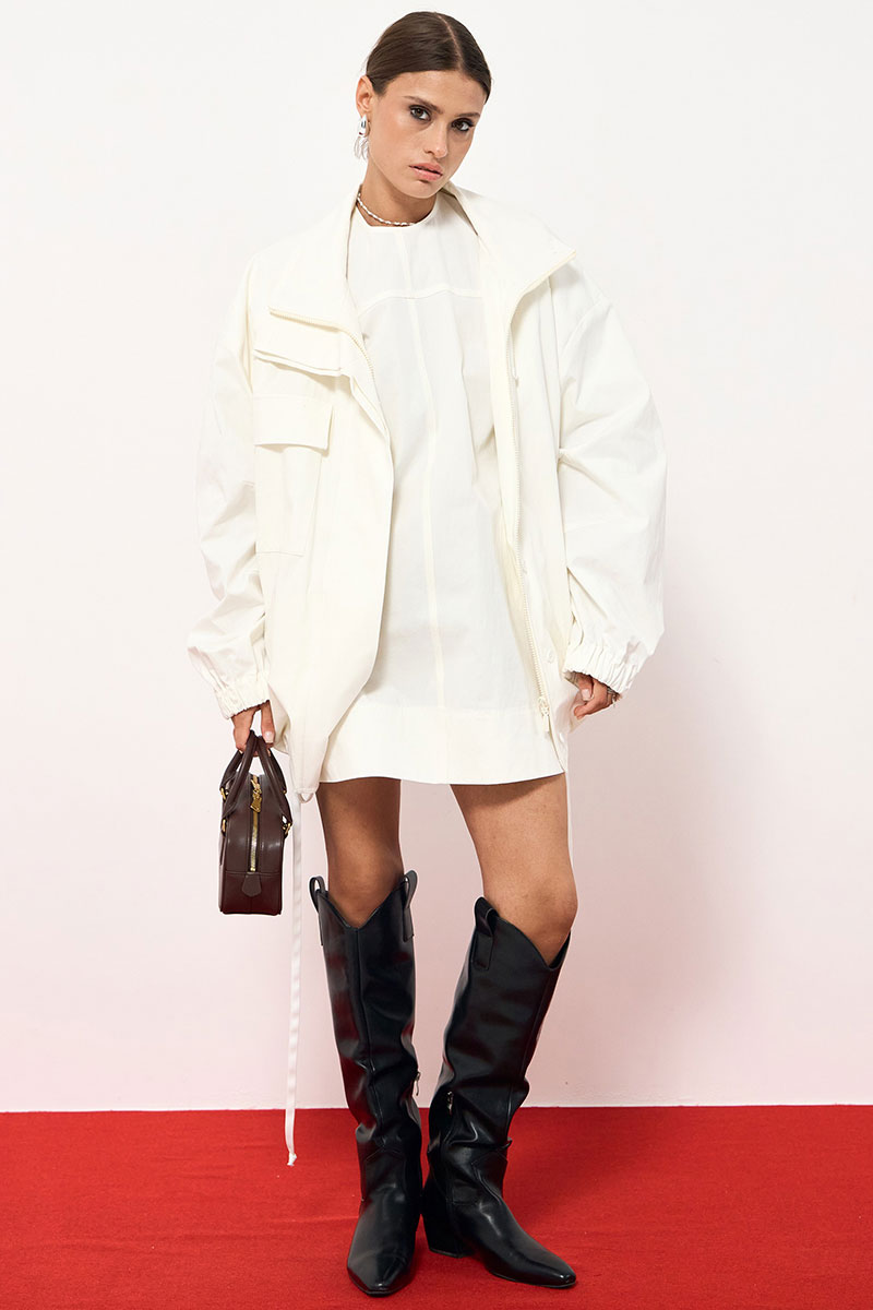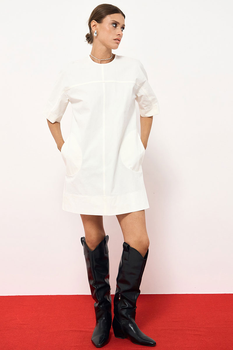 Платье прямого силуэта в длине мини из хлопка. По переду декоративные швы, по бокам функциональные карманы. По спинке застежка на потайную молнию.