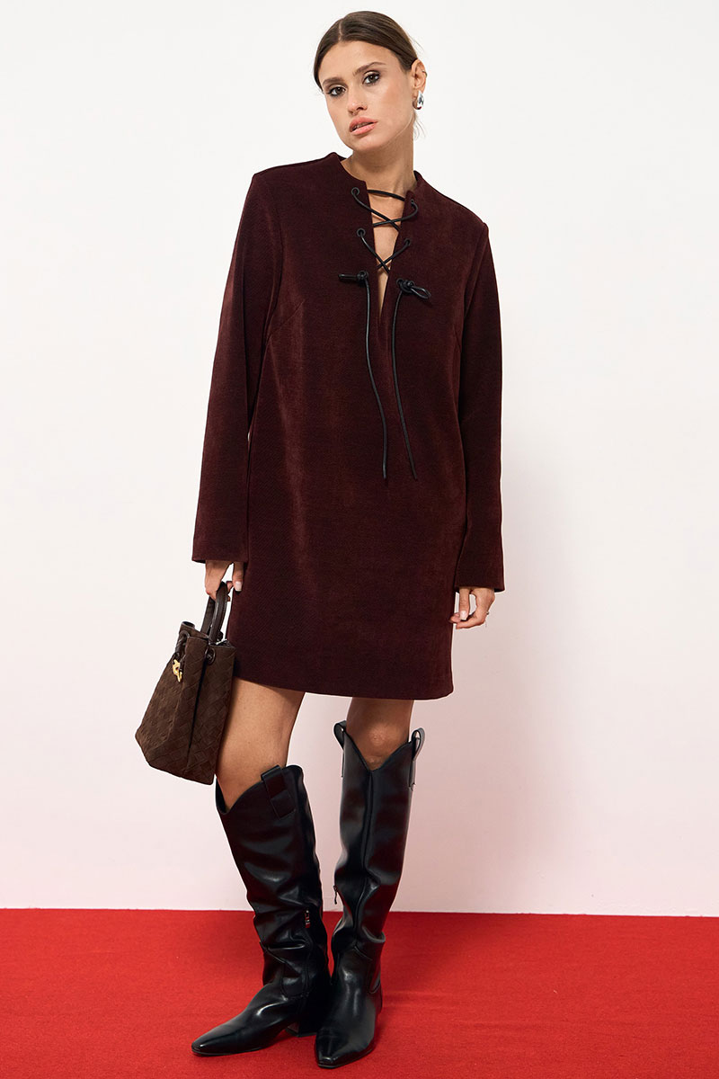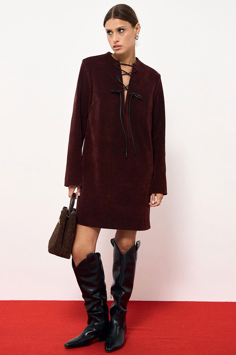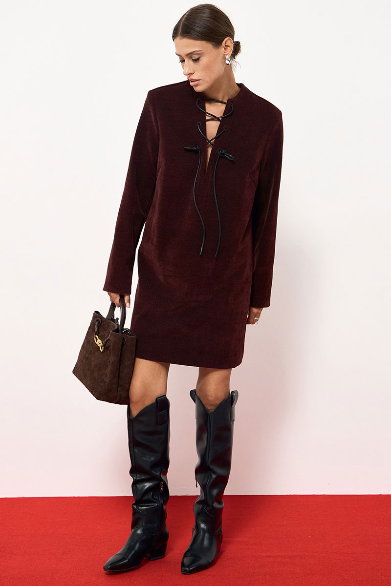 Платье А-образного силуэта в длине мини из костюмной вельветовой ткани. По переду v-образный вырез. По вырезу люверсы с кожаной шнуровкой.