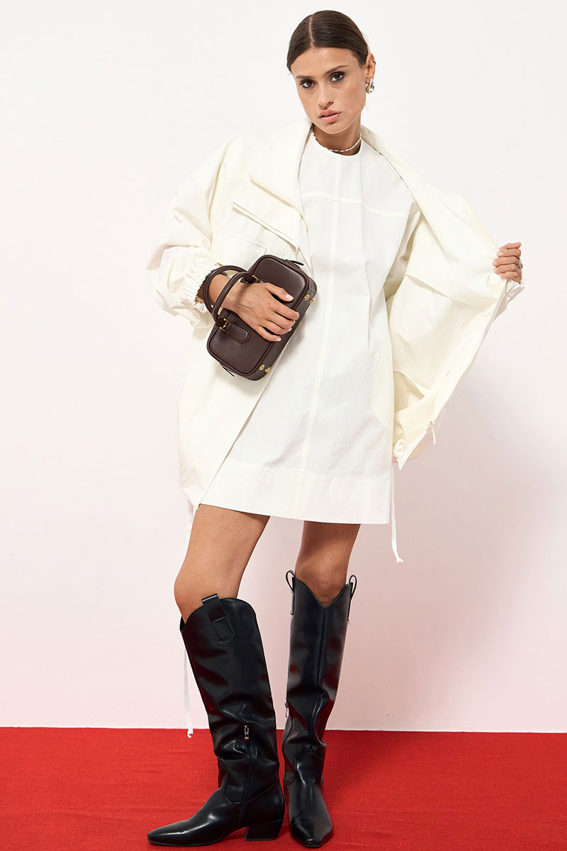 Платье прямого силуэта в длине мини из хлопка. По переду декоративные швы, по бокам функциональные карманы. По спинке застежка на потайную молнию.