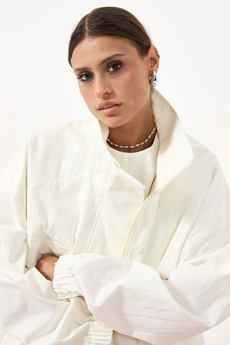 Куртка из хлопковой ткани, большого объема, со спущенной линией плеча. По переду накладной карман, застежка на молнию и приточную планку на пуговицах. Рукав одношевный, низ обработан эластичной тесьмой. По низу куртки кулиса с декоративным шнурком. Воротник стойка.