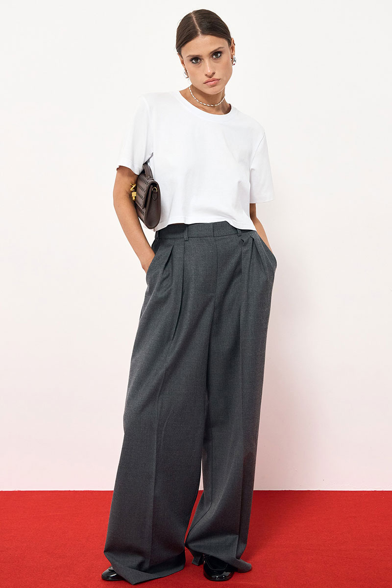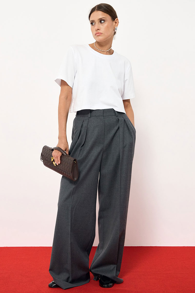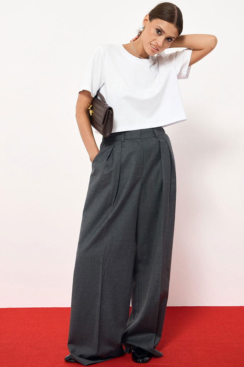 Брюки на стабильном поясе, застежка на молнию и пуговицу, по бокам функциональные карманы. Брюки прямого широкого кроя, по переду стрелки.
